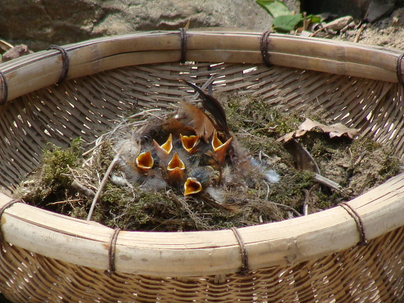 딱새가 깍꿍할머니댁 실겅에 얹어 둔 바구니에 둥지를 틀고 알을 낳아 여섯마리의 새끼를 부화시켰다.