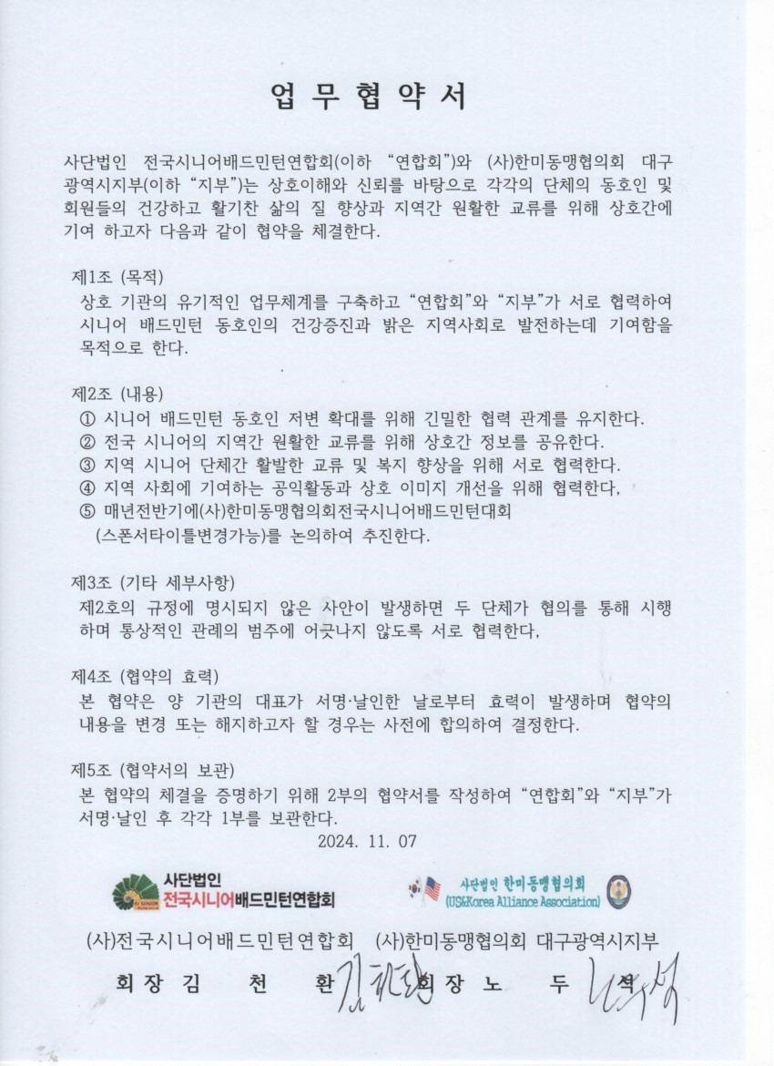 사)한미동맹협의회 대구광역시지부와 협약서 작성자김철한 (대구)|작성시간24.11.11|조회수12 목록 댓글 1 글자크기 작게가 글자크기 크게가 다음검색 현재 게시글 추가 기능 열기 북마크 공유하기 신고 센터로 신고 댓글 댓글 1 댓글쓰기 답글쓰기 댓글 리스트 작성자김철한 (대구) 작성자 본인 여부 작성자 | 작성시간 24.11.11 2024.11.7일 사)한미동맹협의회대구광역시지부와매해 배드민턴대회를 사)한미동맹협의회 대구광역시지부와 대회유치하기로협약을 하였습니다. 댓글 전체보기