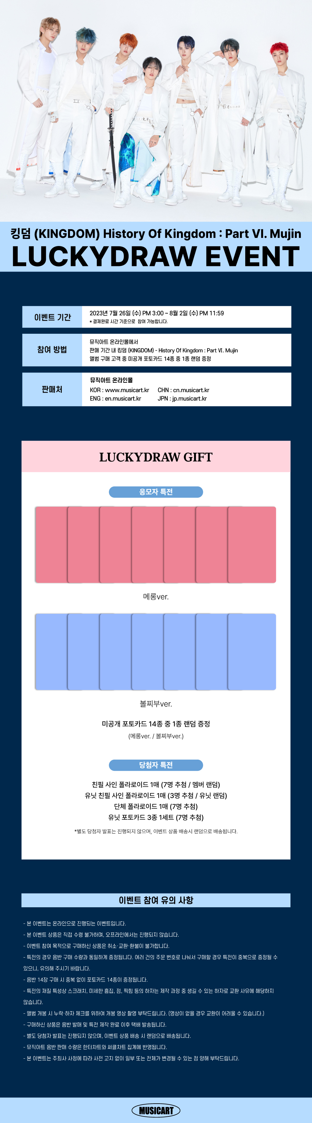 참여 방법 : 뮤직아트 온라인몰에서 판매 기간 내 킹덤 (KINGDOM) - History Of Kingdom : Part Ⅵ. Mujin 앨범 1장 구매 시 LUCKYDRAW 1회 참여