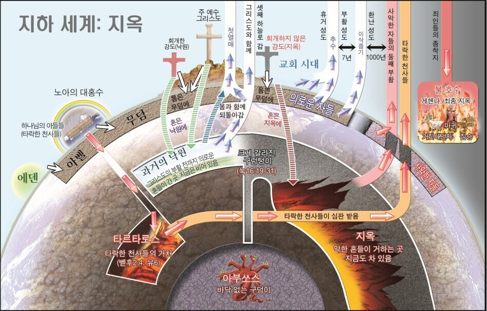 * 감옥에 있는 영들에게 가사 선포 하셨는데 ---> '감옥'은 지하 감옥입니다. 지옥을 가르킵니다. 땅의 중심부입니다. 지옥은 아브라함의 품이 있는 따뜻한 장소와 뜨거운 장소로 나눌수 있습니다. (눅16:23) 천주교에서는 지옥과 천국의 중간단계인 연옥이라는 장소를 가르치는데 거짓 교리입니다.