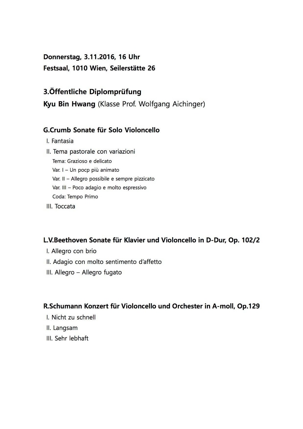 황규빈 파비아나(첼로) 졸업 연주회 작성시간16.10.29|조회수145 목록 댓글 0 글자크기 작게가 글자크기 크게가 - 11.3. 목 16:00- Festsaal, 1010 Wien, Seilerstätte 26 다음검색 현재 게시글 추가 기능 열기 북마크 신고 센터로 신고 댓글 댓글 0 댓글쓰기 답글쓰기 댓글 리스트