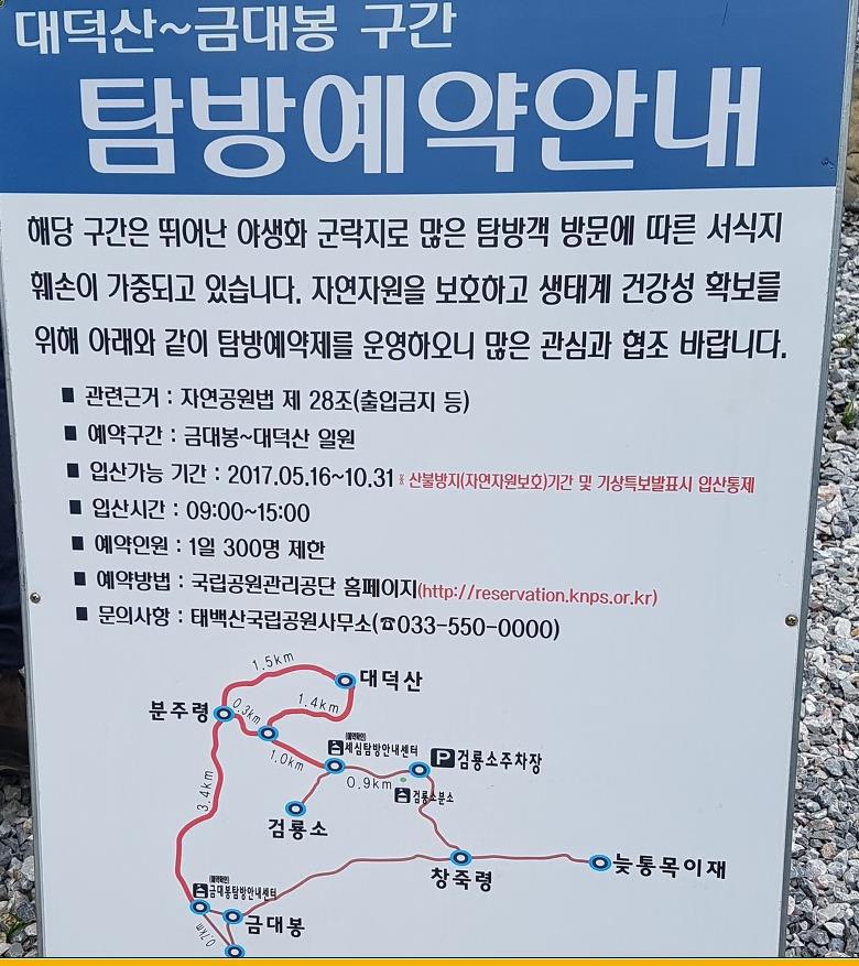 또한 두문동재(1268m)까지 차량으로 올라가기 때문에 힘들지 않고 편안히 고산 능선길을 트레킹 할수 있겠으며 우리나라 3대 화원이기도 한 금대봉 대덕산은 봄부터 가을까지산님들이 한번쯤 걸어보고 싶은 길입니다.