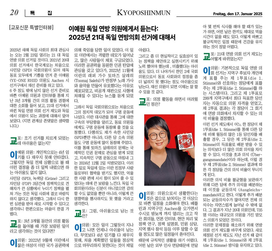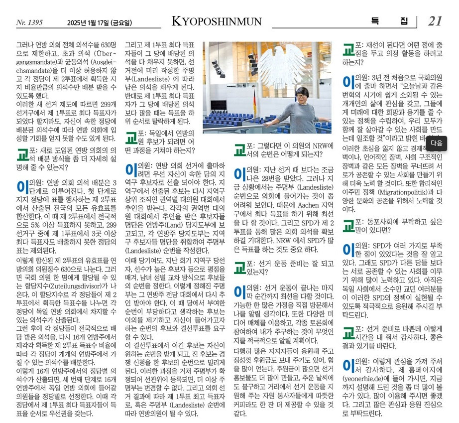 이 예원 독일 연방 의원에게서 듣는다. 자료출처:교포신문 작성자새롬|작성시간25.02.12|조회수21 목록 댓글 0 글자크기 작게가 글자크기 크게가 이 예원 독일 연방 의원에게서 듣는다. 자료출처:교포신문* 편집자주: 독일 연방선거법에 준한 안내성격입니다. 클뤽하시면 조금더 크게 보실 수 있습니다. 다음검색 현재 게시글 추가 기능 열기 북마크 공유하기 신고 센터로 신고 댓글 댓글 0 댓글쓰기 답글쓰기 댓글 리스트
