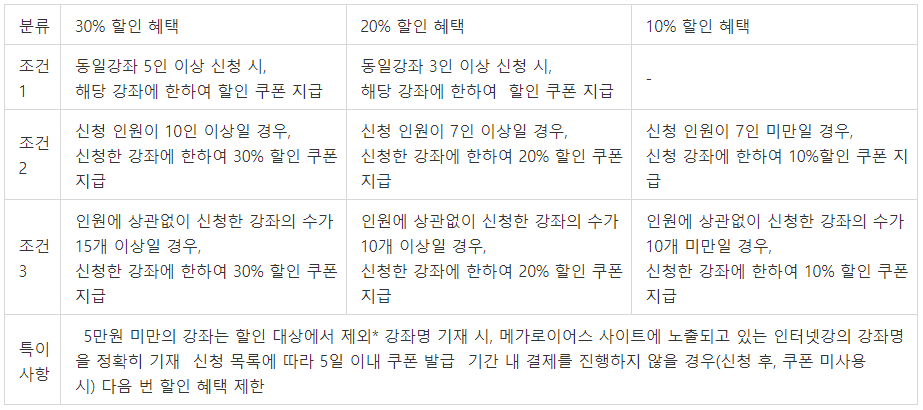 | 안녕하세요. 대외협력국입니다 :) 카페공지가 늦어 기한을 연장합니다. <강의 할인 조건> o 메가로이어스의 경우 아래표 조건 중 최소한 한 개 이상 만족하게 되면 충족여부에 따라 10~30%의 할인쿠폰이 차등지급됩니다. <강의신청서 링크> https://forms.gle/zgQbxDjEm8JRRVGv9 신청기간 3월 23일 12시 ~ 3월 30일 13시까지 (할인 쿠폰 발급은 신청마감으로부터 영업일 기준 약 2~3일 소요 예정) (링크연결이 바로안되시는분은 크롬으로 접속하시고 링크주소 복사하시면 됩니다.) <학원측 전달사항> 1) 쿠폰지급일 관련 쿠폰지급일은 학원 측의 신청 접수일 기준 2~3일 내에 지급될 예정이라고 합니다. 2) 담당자 전화번호 강의신청 중 문제가 있을 경우, 메가로이어스 아래 번호로 연락주시면 빠르게 처리 가능합니다. 채윤석 팀장 : 02-3489-8528 3) 신청시 학년기재 필수 학원 측 지침에 따라 졸업생 분들에게는 할인적용이 불가합니다. 4) 패키지 형태로 제공되는 강좌(예: 종합반 패키지)들은 할인 혜택 적용 대상이 아닙니다. 강좌신청 시 번거로우시더라도 강좌별 신청부탁드립니다(쿠폰이 발급됐음에도 적용이 불가할 경우 기존에 할인 적용이 되고 있는 강좌인지 확인 바랍니다). <여타 문의 시> 학생회 메일 또는 플러스친구로 문의주시면 감사하겠습니다 :) |