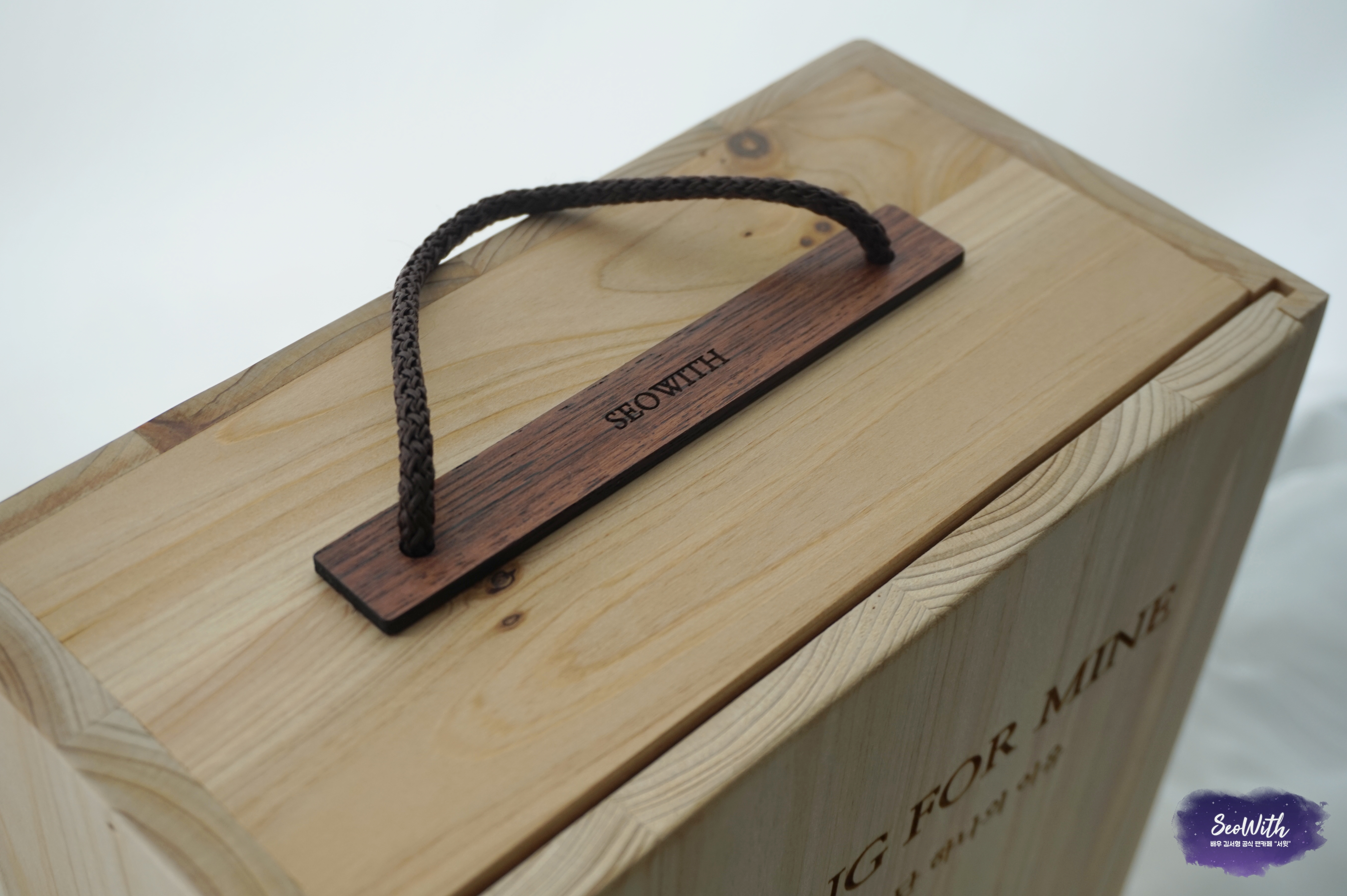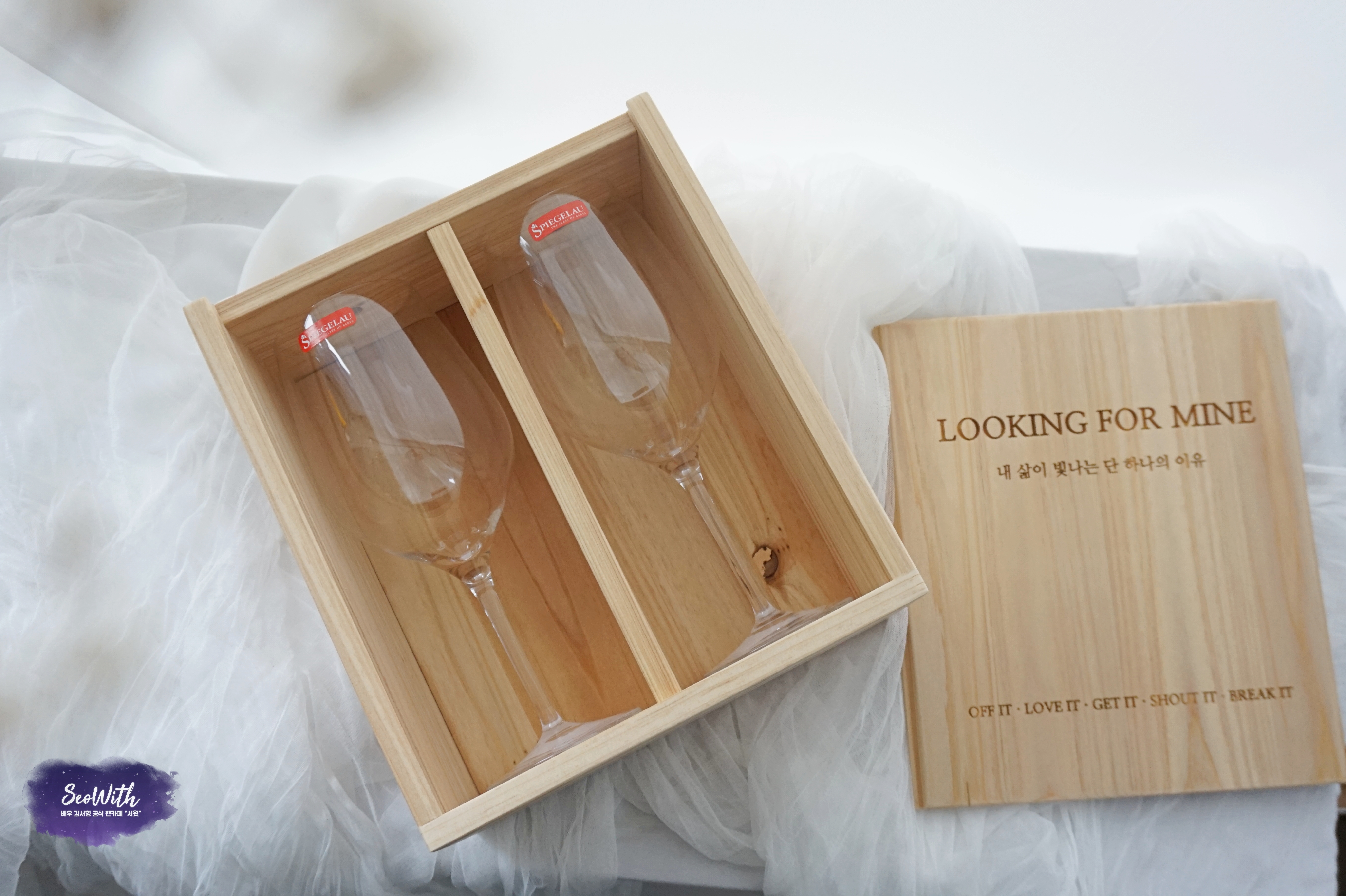 각인와인잔이 담긴 우드케이스를 포장 완료한 모습입니다.