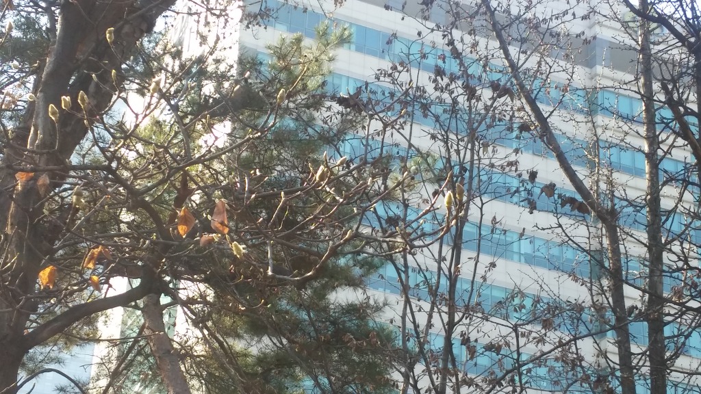 왼쪽에 잎들도 떨어지고 군데군데 한 두개 씩 잎밖에 안남아서 모든 잎을 손으로 셀 수 있을 정도의 모습이었다. 나무 줄기가 건조하고 추운날씨게 마르고 갈라져있는 모습을 볼 수 있었다. 그리고 새로운 모습을 발견했는데 가지 끝쪽에 솜털같은게 조그맣게 생긴 모습을 볼 수 있었다.