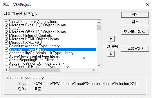 5. VBA 메뉴의 [ 도구 ] → [ 참조 ] 에서 [ Selenium Type Library ] 체크 후 [ 확인 ]