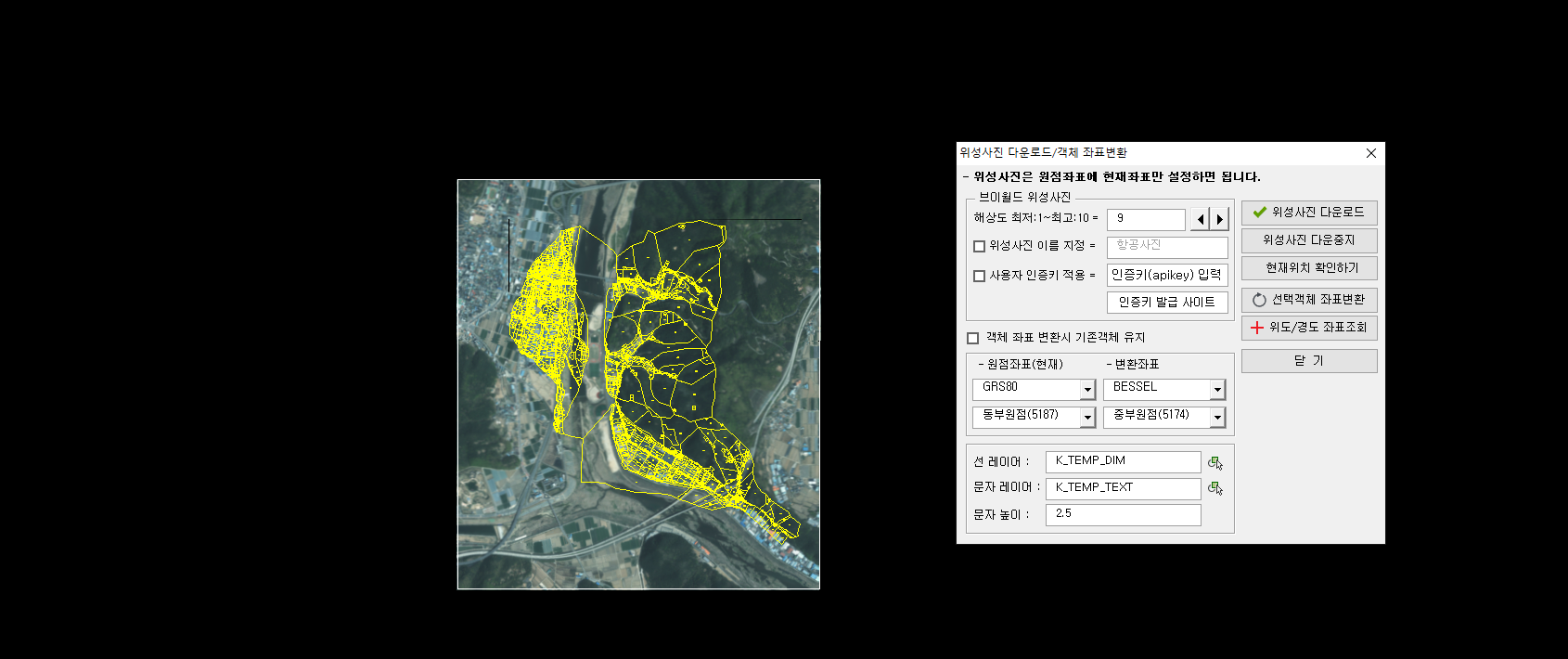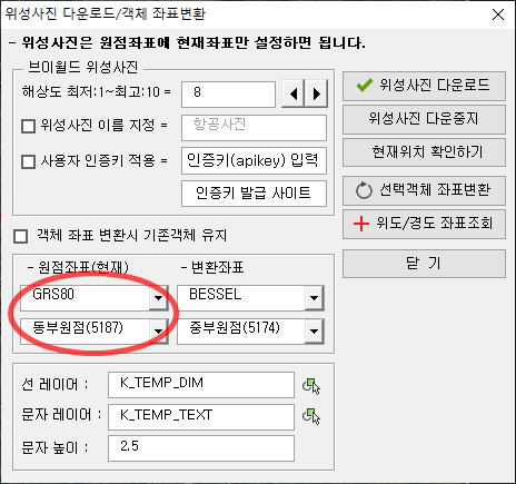 (단 위성사진을 받을때 베셀로 선택하면 grs80으로 좌표 변환후 위성사진을 다운합니다.)