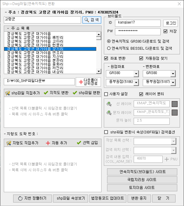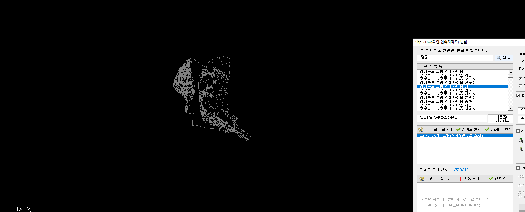 4.지적도 변환을 클릭하면 연속지적도가 작성됩니다.