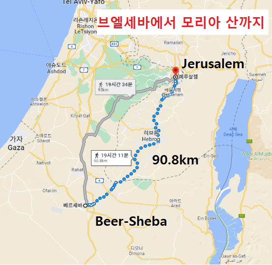 아브라함이 있었던 브엘세바에서 예루살렘에 있는 모리아 산까지 거리는 도보로 90km 정도 된다(아래 구글지도 참조). 제 삼일에야 여기에 도착했다. 시간이 짧으면 순간적인 감정으로 해치울 수도 있겠지만, 무려 사흘이나 되는 시간은 오만 가지 생각을 다 하게 할 수 있는 시간이다.
