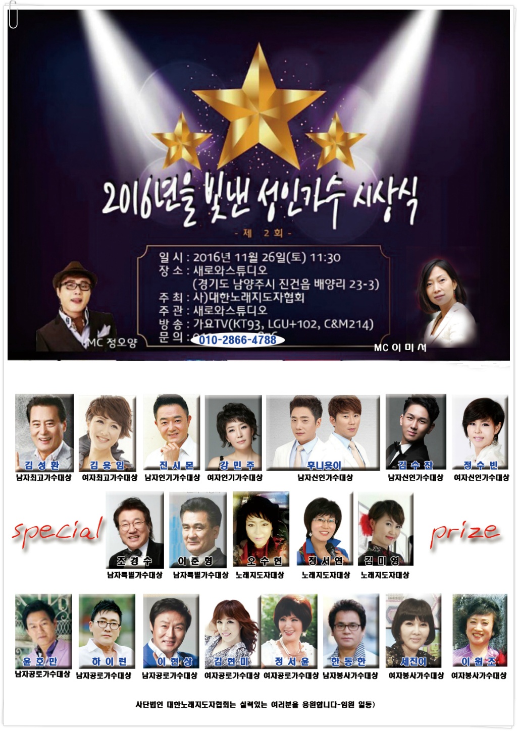 금번 11월 26일 토요일에는 2016년을 마감하는 제3회 카오시 성인가수 시상식 겸 송년회가 열립니다.