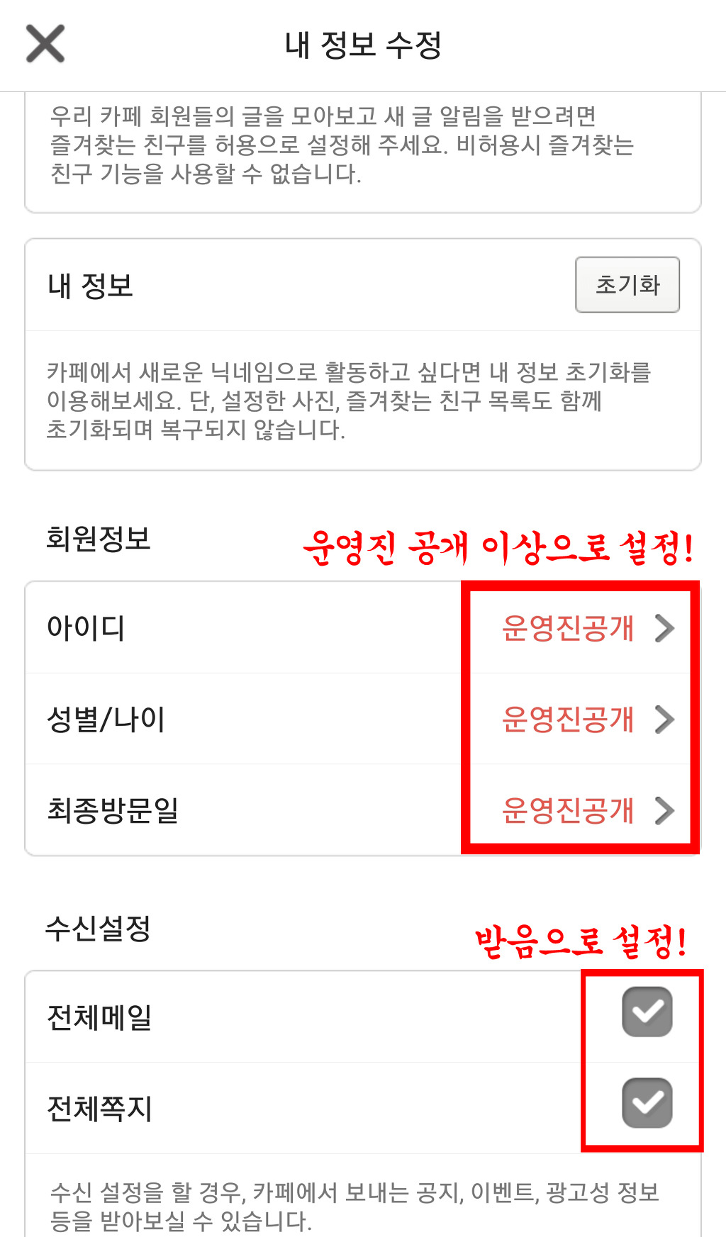 Ⅱ 회원정보 운영진 공개 이상 설정 및 전체 메일, 쪽지 받음 설정을 하지 않을 시 강등 사유가 됩니다.