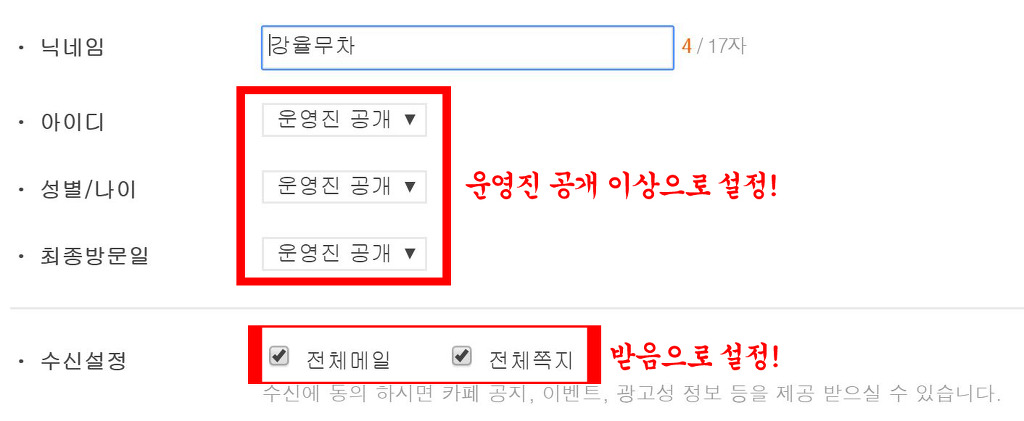 2) 강율무차는 회원정보를 운영진 이상 및 전체 메일, 전체 쪽지 받음으로 설정합니다.