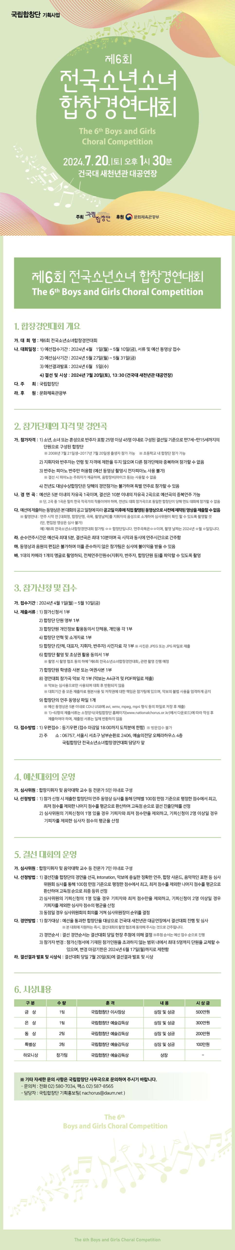 [국립합창단] 제6회 전국소년소녀합창경연대회 작성자국립합창단 홍보마케팅팀|작성시간24.03.27|조회수53 목록 댓글 0 글자크기 작게가 글자크기 크게가 안녕하세요, 국립합창단입니다.<2024년 제6회 전국소년소녀합창경연대회> 를 개최합니다.많은 관심과 참여 부탁드립니다 💗↓ 아래 이미지를 클릭하시면 국립합창단 홈페이지로 이동합니다. 다음검색 현재 게시글 추가 기능 열기 북마크 공유하기 신고 센터로 신고 댓글 댓글 0 댓글쓰기 답글쓰기 댓글 리스트