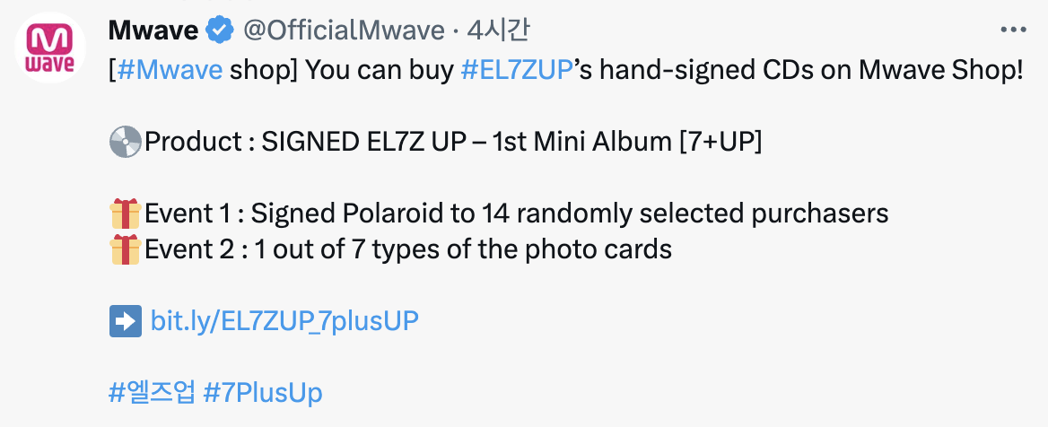 230920 MWave 트위터 (Mwave shop 엘즈업 사인 시디 판매, 23.09.20 ~ 10.10 18:00 (KST)) 작성자빵빠레마왕|작성시간23.09.20|조회수525 목록 댓글 0 글자크기 작게가 글자크기 크게가 https://shop.mwave.me/kr/568560.htmlEL7Z UP - 미니 1집 [7+UP] shop.mwave.me bit.ly/EL7ZUP_7plusUPEL7Z UP - 1st Mini Album [7+UP] shop.mwave.me 다음검색 현재 게시글 추가 기능 열기 북마크 공유하기 신고 센터로 신고 댓글 댓글 0 댓글쓰기 답글쓰기 댓글 리스트