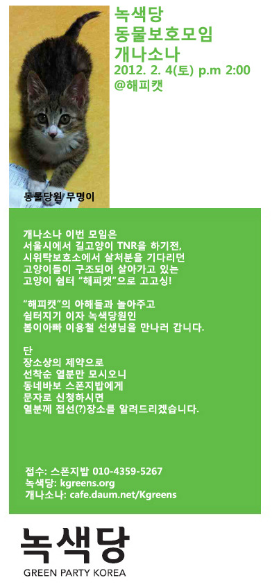 개나소나 해피캣 고고싱 야옹작전 작성자sponge bob|작성시간12.01.27|조회수101 목록 댓글 2 글자크기 작게가 글자크기 크게가 다음검색 현재 게시글 추가 기능 열기 북마크 공유하기 신고 센터로 신고 댓글 댓글 2 댓글쓰기 답글쓰기 댓글 리스트 작성자봄이아빠 | 작성시간 12.02.03 해피캣주소 : 서울 금천구 독산동 159-1 삼영빌딩 402호 입니다. 지도 검색하시면 금방 찾으실 거에요. 답댓글 작성자eric | 작성시간 12.02.07 앗 봄이아빠님 여기 계시는군요 ㅎㅎㅎ노원구 에릭 입니다. 여기서 뵈니 더 반갑군요. 댓글 전체보기