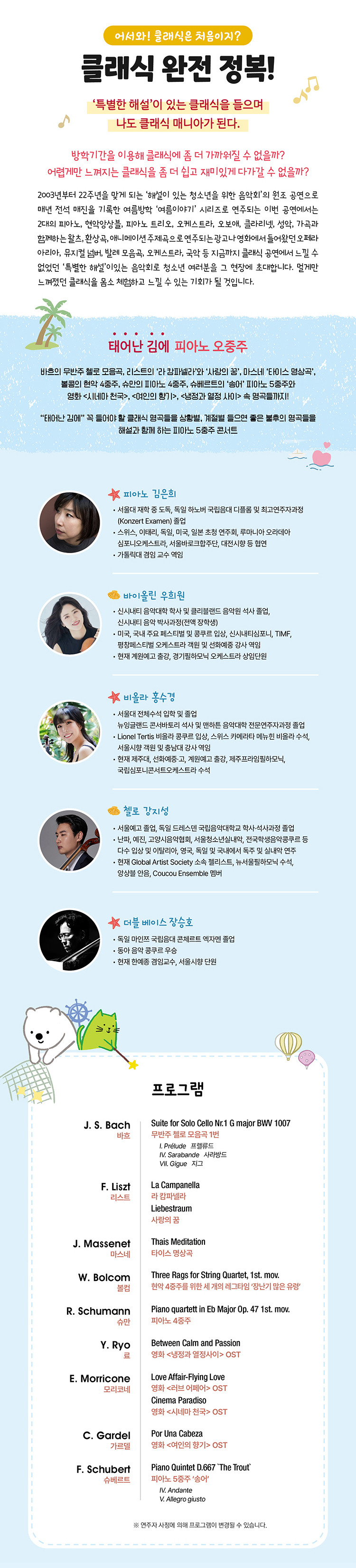 바흐의 무반주 첼로 모음곡, 리스트의 ‘라 캄파넬라’와 ‘사랑의 꿈’, 마스네 ‘타이스 명상곡’, 볼콤의 스트링 콰르텟, 그리고 슈만의 피아노 사중주, 슈베르트의 ‘송어’ 오중주와 영화 <시네마 천국>, <여인의 향기>, <냉정과 열정 사이> 속 명곡들까지! “태어난 김에” 꼭 들어야 할 클래식 명곡들을 상황별, 계절별 들으면 좋은 불후의 명곡들을 해설과 함께 하는 피아노 5중주 콘서트