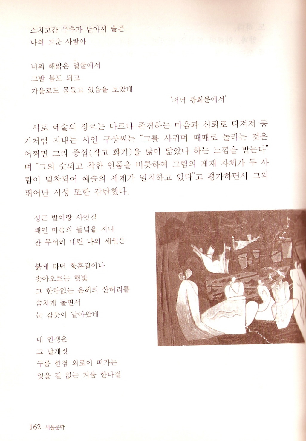 서로 예술의 장르는 다르나 존경하는 마음과 신뢰로 다져져 동기처럼 지내는 시임 구상 씨는 “그를 사귀며 놀라는 것은 어쩌면 그의 중섭(작고 화가)을 많이 닮았나하는 느낌을 받는다”며 “그의 숫되고 착한 인품을 비롯하여 그림의 재재 자체가 두 사람이 밀착되어 예술의 세계가 일치하고 있다”고 평가하면서 그의 뛰어난 시성을 또한 감탄했다.