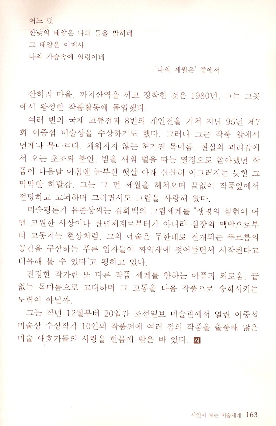 진정한 작가란 또 다름 작품 세계를 향하는 아픔과 외로움, 끝없는 목마름으로 고대하며 그 고통을 다음 작품으로 승화시키는 노력이 아닐까.