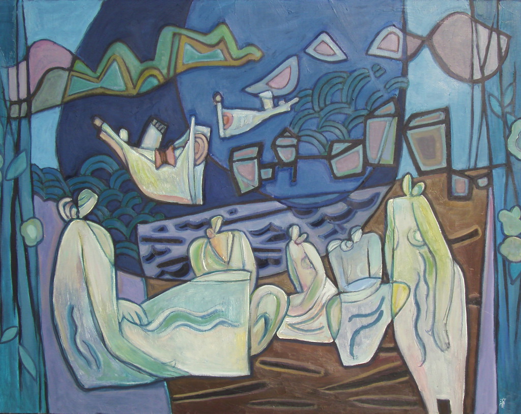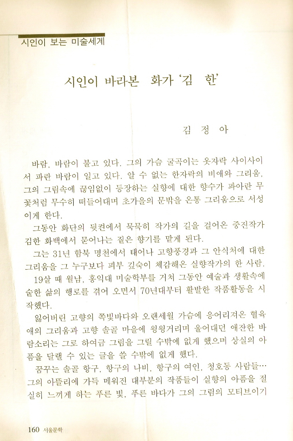 바람. 바람이 불고 있다. 그의 가슴 굴곡 이는 옷자락 사이사이서 파란 바람이 불고 있다. 알 수 없는 한 자락의 비애와 그리움, 그의 그림 속에 끊임없이 등장하는 실향에 대한 향수가 파아란 무꽃처럼 무수히 떠들어대며 초가을의 문밖을 온통 그리움으로 서성이게 한다.