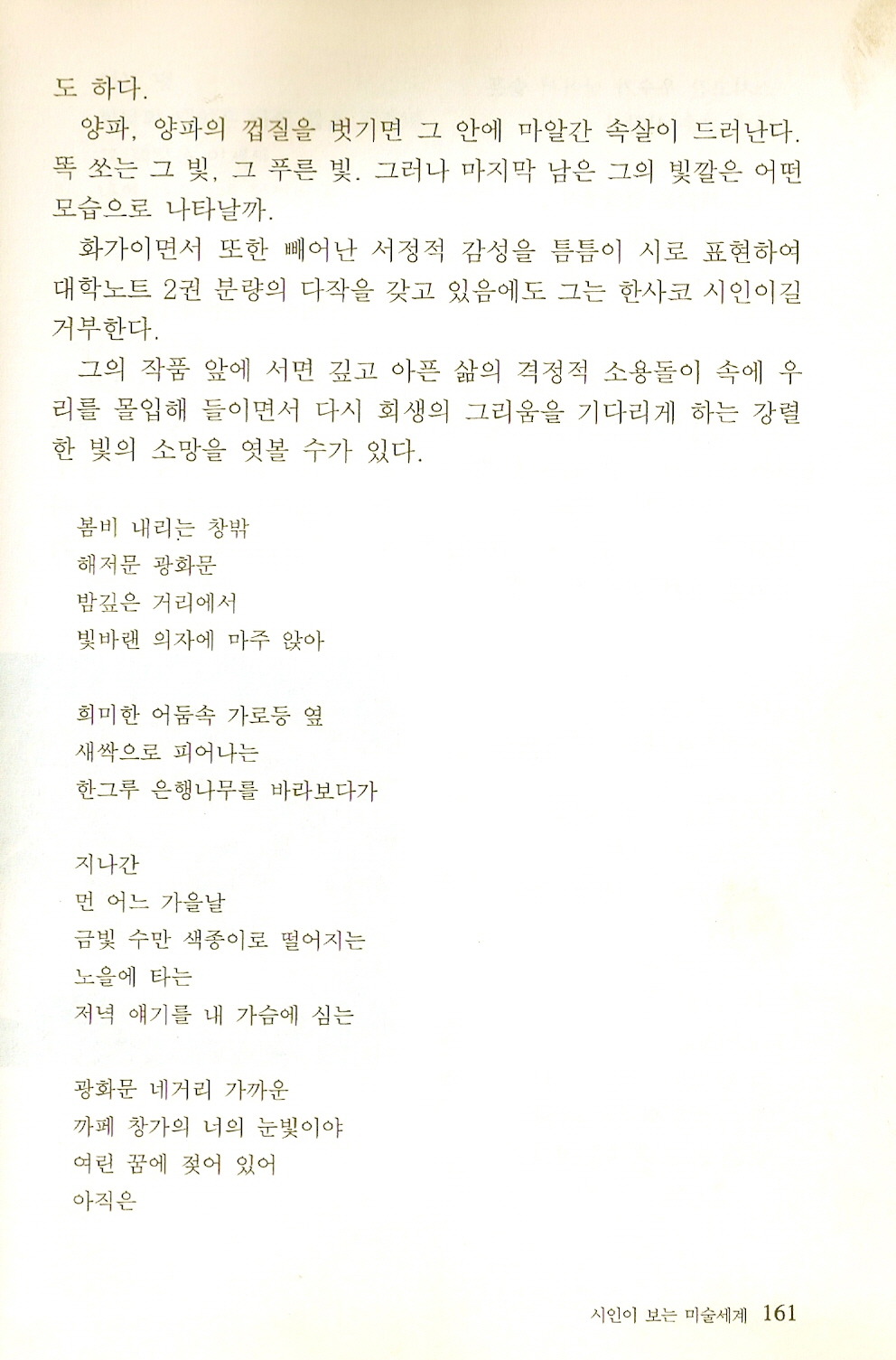 그의 작품 앞에 서면 깊고 아픈 삶의 격정적 소용돌이 속에 우리를 몰입해 들이면서 다시 회생의 그리움을 기다리게 하는 강렬한 빛의 소망을 엿볼 수가 있다.