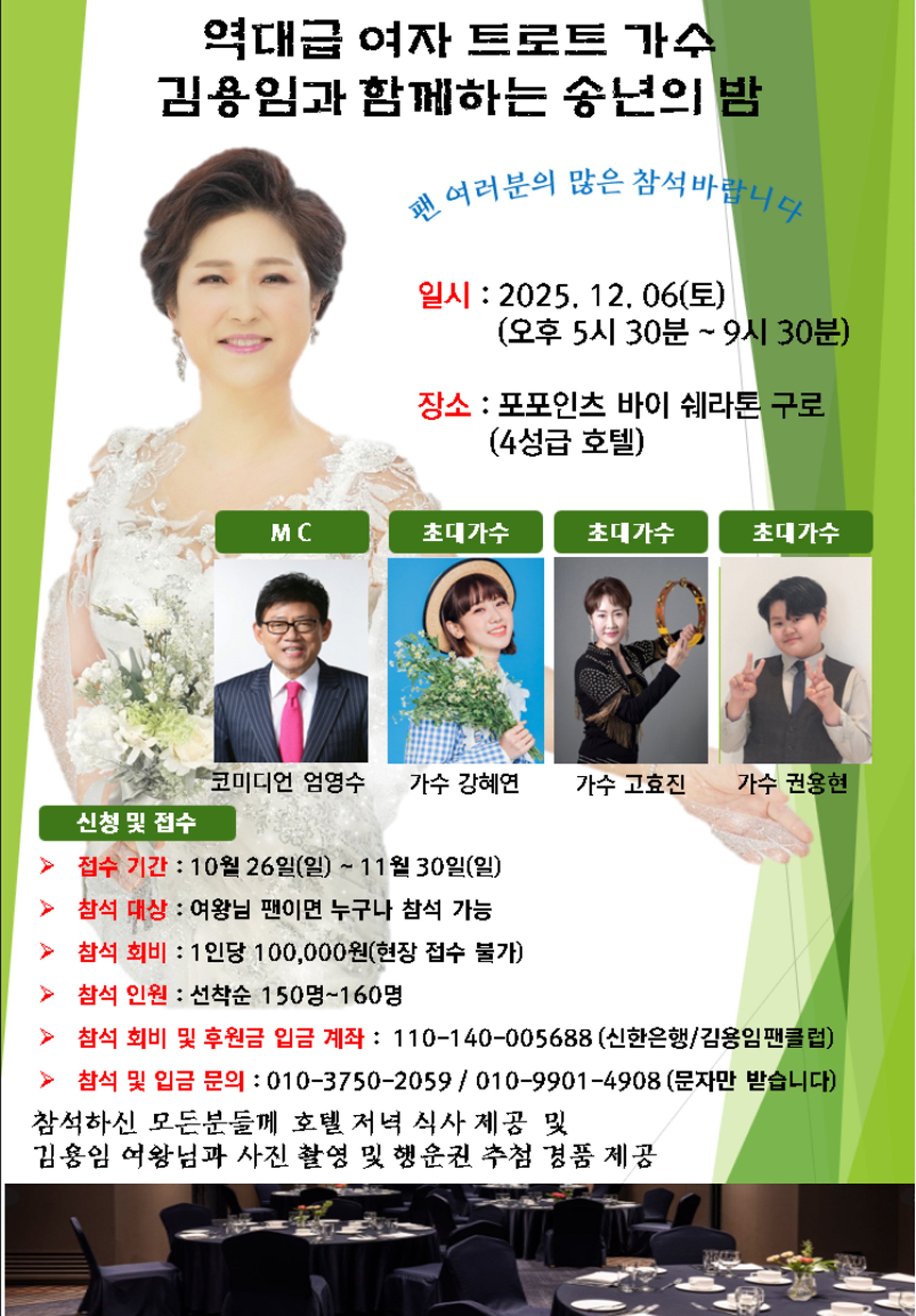 역대급여자 트로트 가수 김용임과 함께하는 송년의 밤 작성자21c-park(박귀식)|작성시간25.11.27|조회수149 목록 댓글 1 글자크기 작게가 글자크기 크게가 서울에 사시는 분들은 많은 참여 바라겠습니다. 다음검색 현재 게시글 추가 기능 열기 북마크 공유하기 신고 센터로 신고 댓글 댓글 1 댓글쓰기 답글쓰기 댓글 리스트 작성자sunny | 작성시간 25.11.28 참석 못 해 아쉽네요 😢 즐거운 시간 되세요~ 댓글 전체보기