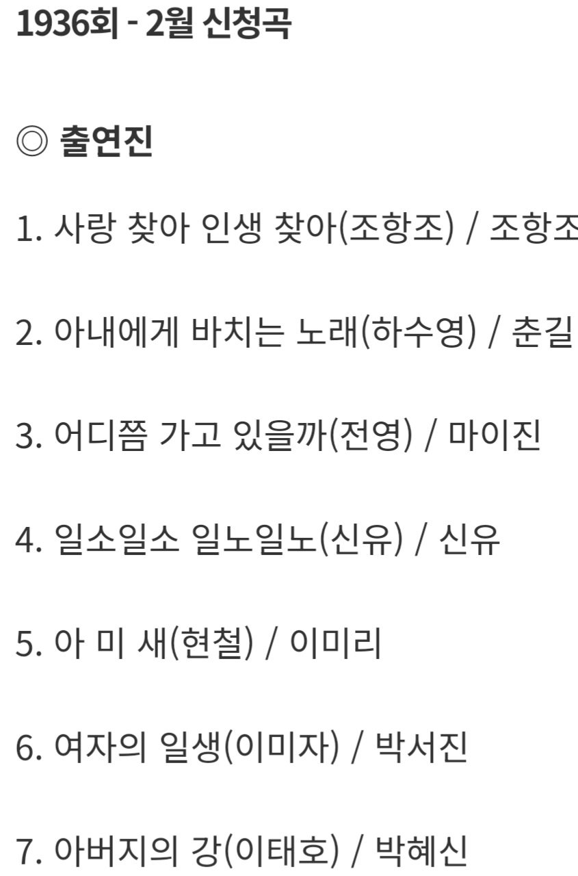 가요무대 출연 작성자해피해피|작성시간26.02.20|조회수36 목록 댓글 2 글자크기 작게가 글자크기 크게가 담주 월요일 방송되는 1936회 2월 신청곡 편에 출연해 오늘이 젊은 날 부르십니다 다음검색 현재 게시글 추가 기능 열기 북마크 공유하기 신고 센터로 신고 댓글 댓글 2 댓글쓰기 답글쓰기 댓글 리스트 작성자대숲 | 작성시간 26.03.02 감사합니다. 답댓글 작성자해피해피 작성자 본인 여부 작성자 | 작성시간 26.03.02 감사합니다 댓글 전체보기