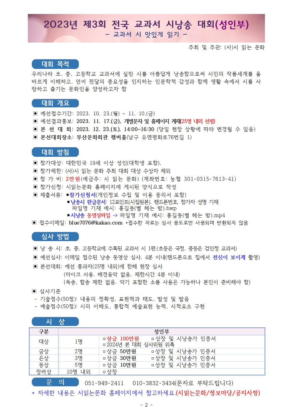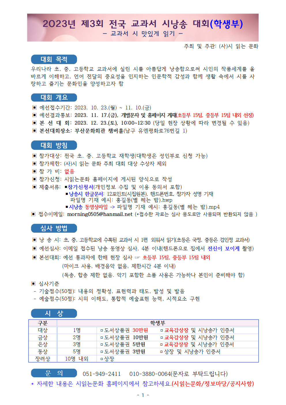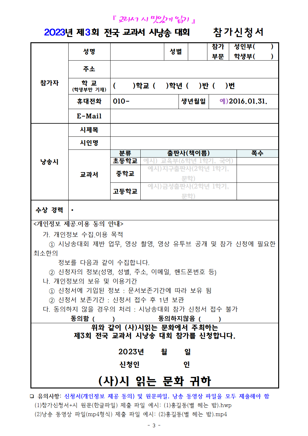 제3회 전국 교과서시낭송대회 안내(학생부)(성인부) 작성자푸른강물|작성시간23.09.25|조회수619 목록 댓글 0 글자크기 작게가 글자크기 크게가 제3회 전국교과서시낭송대회(요강.신청서).hwp1.05MB 첨부파일에 신청서와 시원문 서식 파일이 있으니 다운 받으세요(*^__^*) 첨부파일첨부된 파일이 4개 있습니다. png 파일 제3회 전국교과서시낭송대회(요강.신청서)001.png 다운로드 png 파일 제3회 전국교과서시낭송대회(요강.신청서)002.png 다운로드 png 파일 제3회 전국교과서시낭송대회(요강.신청서)003.png 다운로드 hwp 파일 제3회 전국교과서시낭송대회(요강.신청서).hwp 다운로드 다음검색 현재 게시글 추가 기능 열기 북마크 공유하기 신고 센터로 신고 댓글 댓글 0 댓글쓰기 답글쓰기 댓글 리스트
