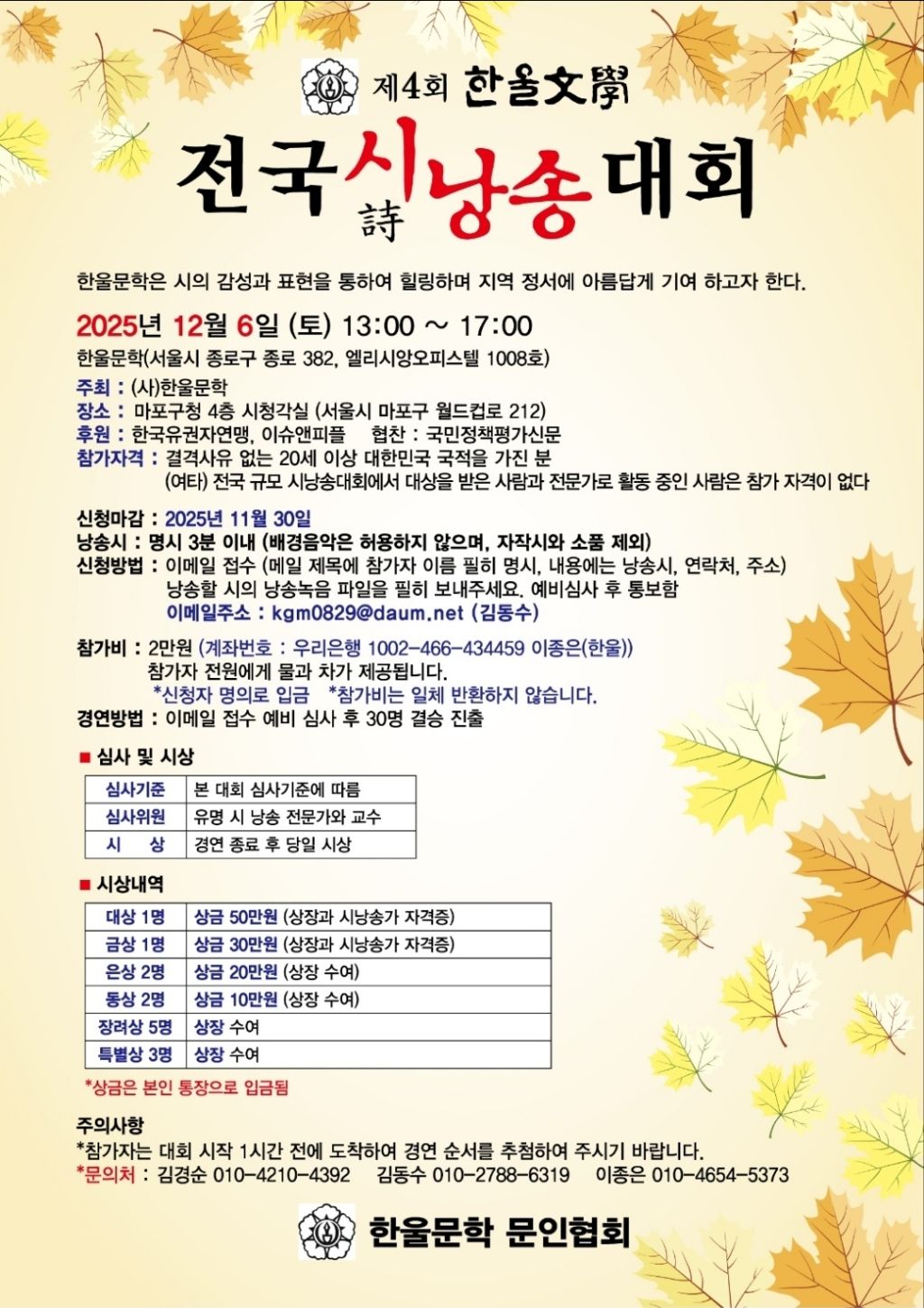 제4회 한울문학 전국시낭송대회 개최 관련 안내 드립니다.