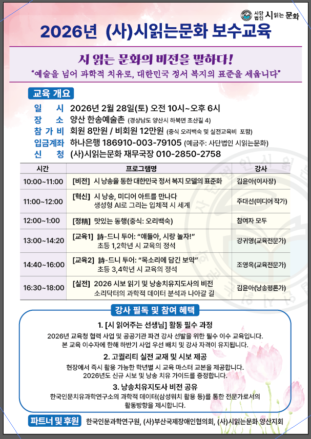 2026년 보수교육 안내입니다. 작성자시인의 정원|작성시간26.02.02|조회수40 목록 댓글 0 글자크기 작게가 글자크기 크게가 다음검색 현재 게시글 추가 기능 열기 북마크 공유하기 신고 센터로 신고 댓글 댓글 0 댓글쓰기 답글쓰기 댓글 리스트