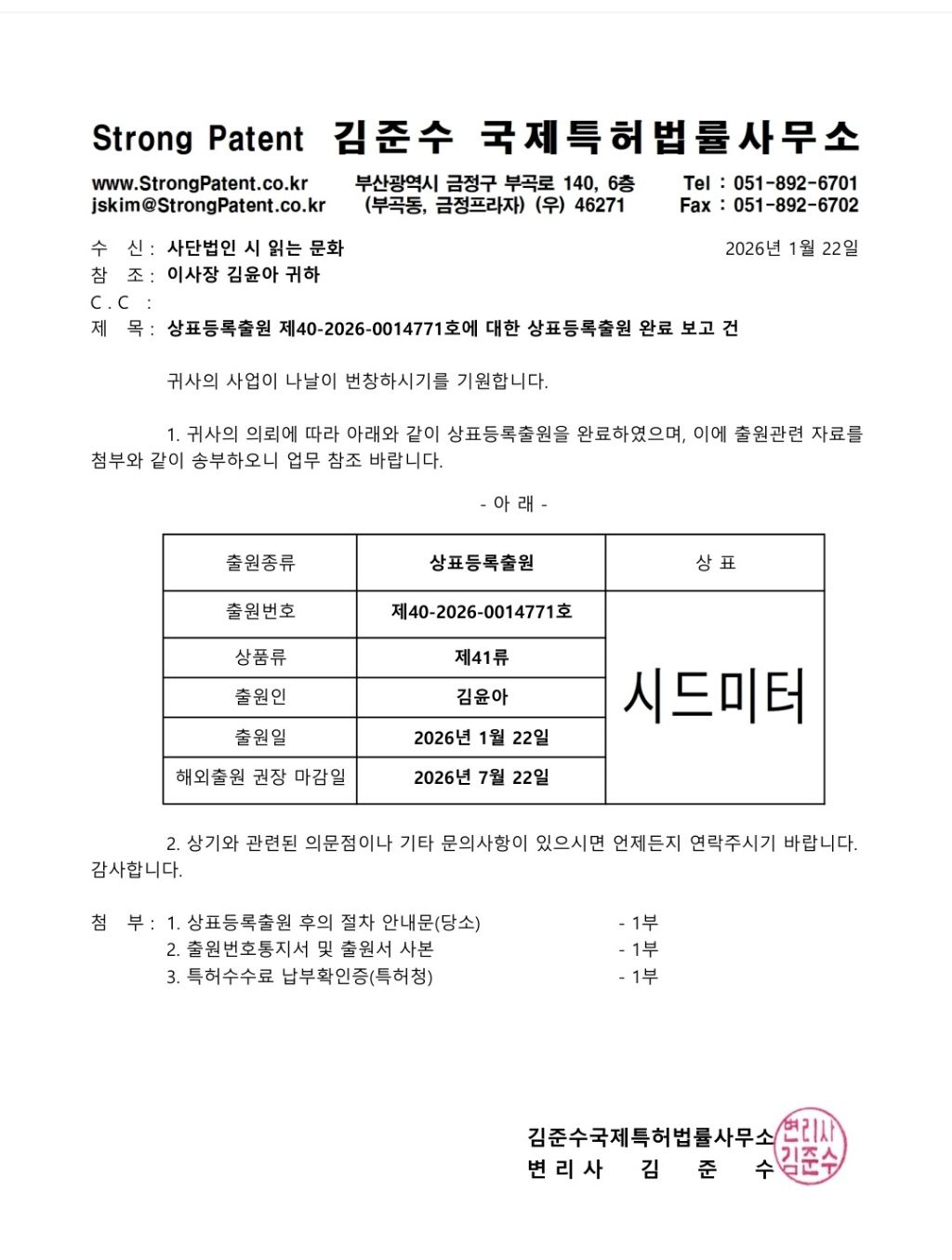 (사)시읽는문화에서 [시읽어주는선생님]과 [시를 읽으면 상처도 꽃이 된다]에 이어 세번째 특허 등록 소식입니다.