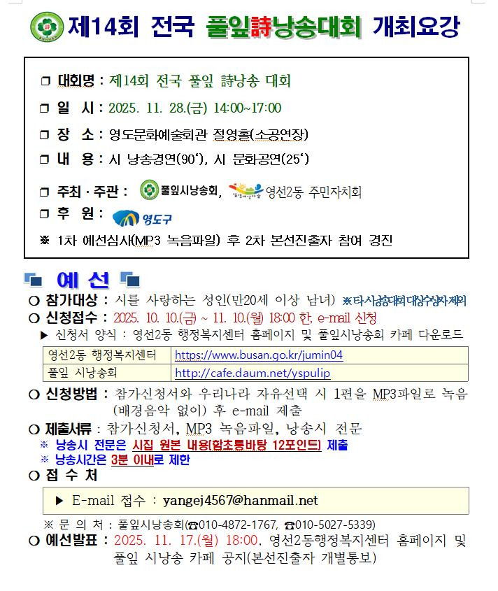 제14회 전국 풀잎 시낭송 대회 (접수 11/10까지, 본선11/28), 대상 상금 50만원/총상금 160만원 작성자평안지우|작성시간25.11.03|조회수67 목록 댓글 0 글자크기 작게가 글자크기 크게가 2025년 11월 현재 아직 접수 가능한 대회입니다. 관심 있으신분들 힘내어 도전해 보시면 좋을거 같습니다^^ 제14회 전국 풀잎詩낭송대회 개최요강 (1).hwp950.50KB제14회 전국 풀잎詩낭송대회 참가신청서(예선).hwp66.00KB 첨부파일첨부된 파일이 4개 있습니다. jpg 파일 풀잎.jpg 다운로드 hwp 파일 제14회 전국 풀잎詩낭송대회 개최요강 (1).hwp 다운로드 hwp 파일 제14회 전국 풀잎詩낭송대회 참가신청서(예선).hwp 다운로드 png 파일 KakaoTalk_20251002_210430828_01_20251012_170844_357.png 다운로드 다음검색 현재 게시글 추가 기능 열기 북마크 공유하기 신고 센터로 신고 댓글 댓글 0 댓글쓰기 답글쓰기 댓글 리스트