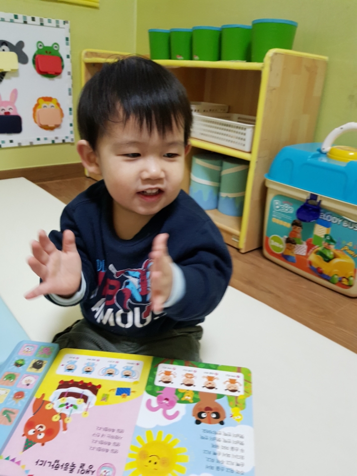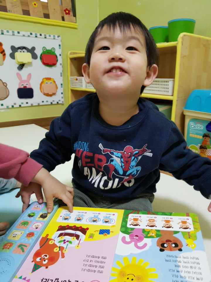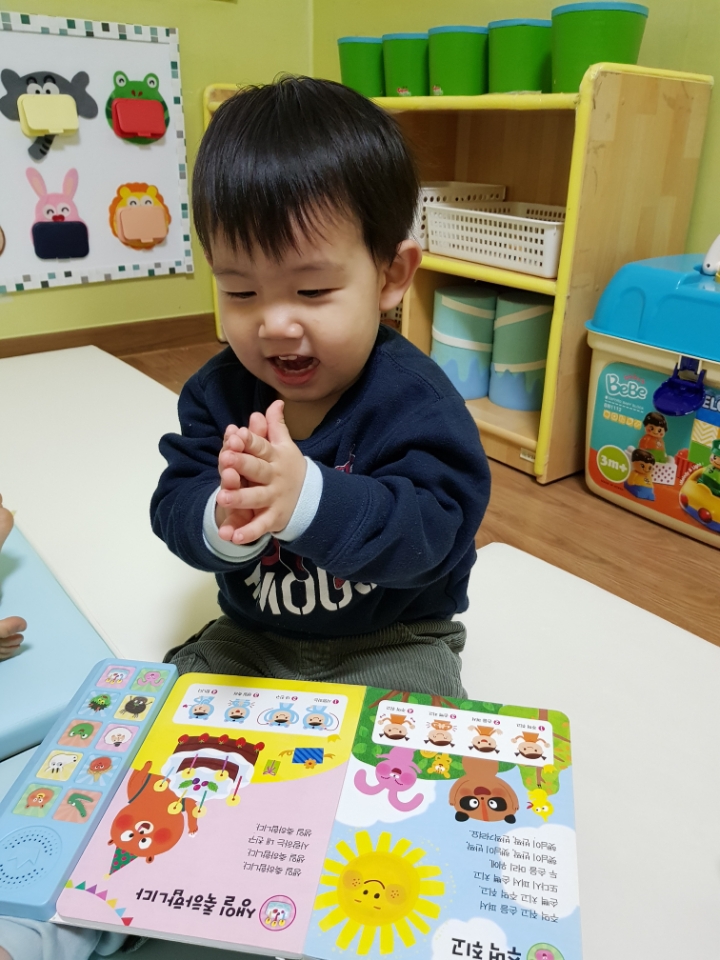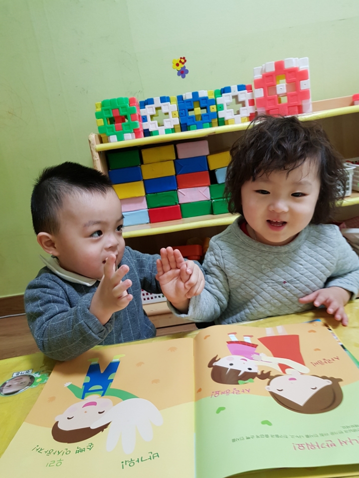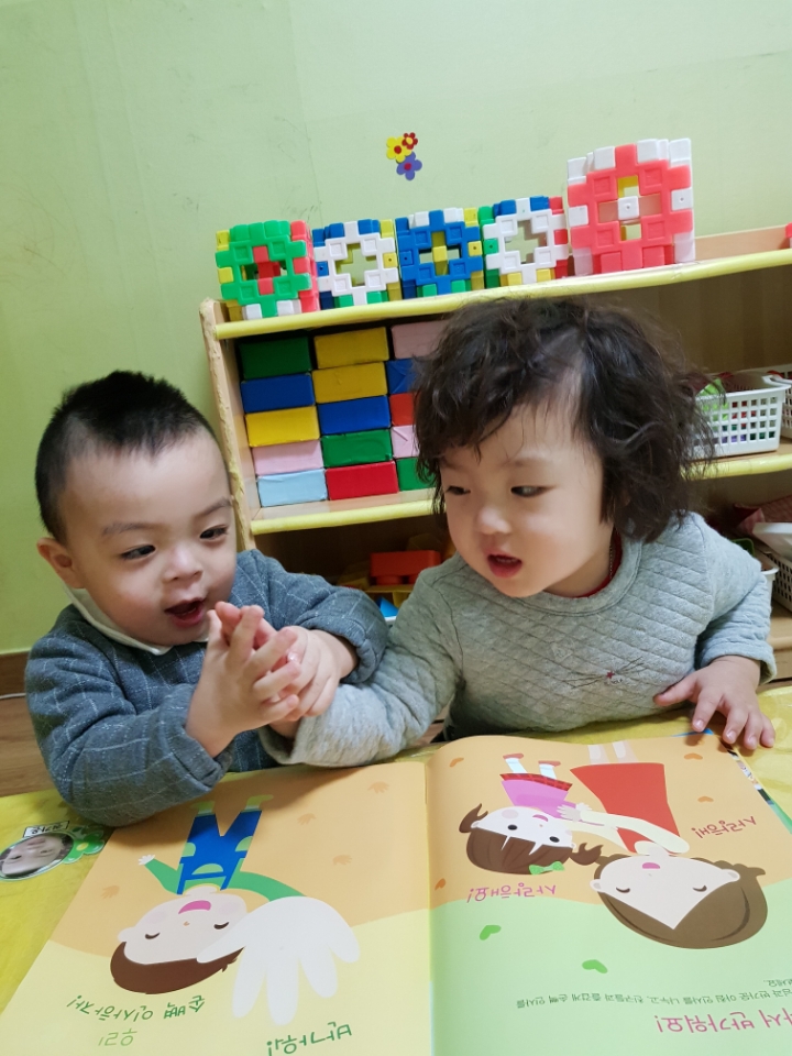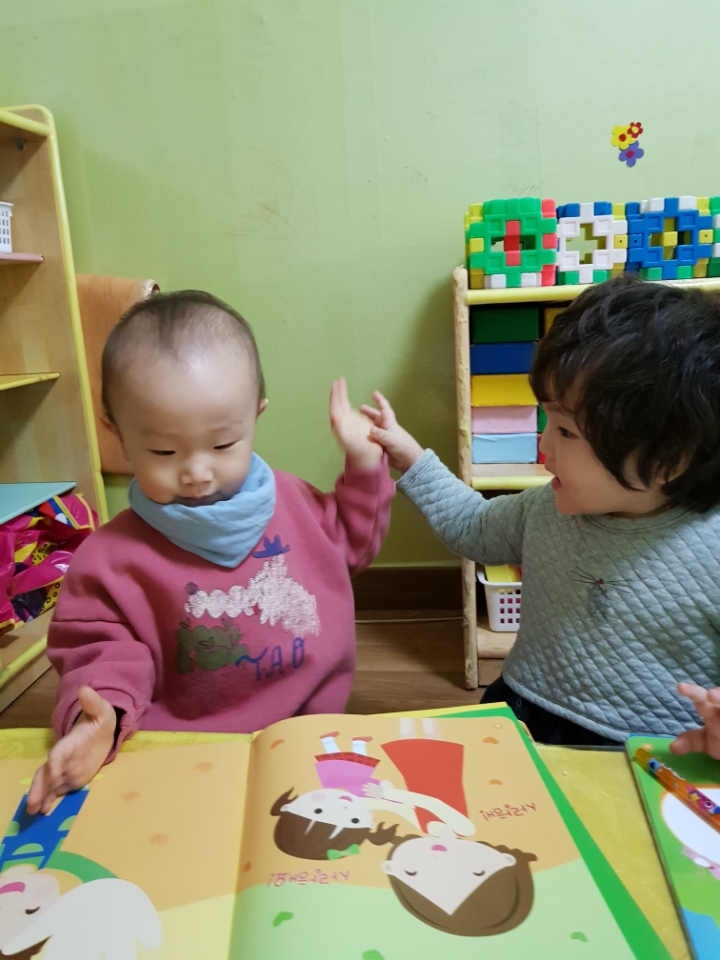 교재 위 손바닥 그림에 직접 손을 펴서 대보기도 하고 친구와 손바닥을 마주치며 인사나누기의 정겨운 모습을 보였습니다
