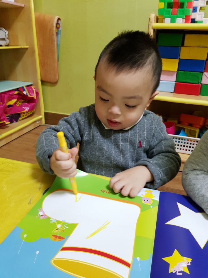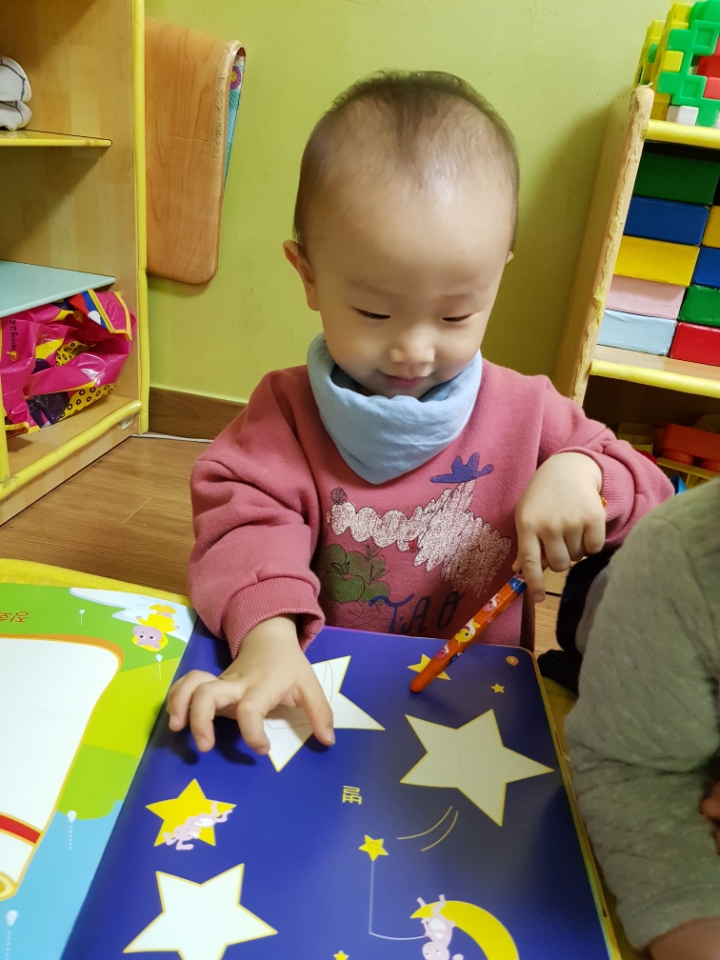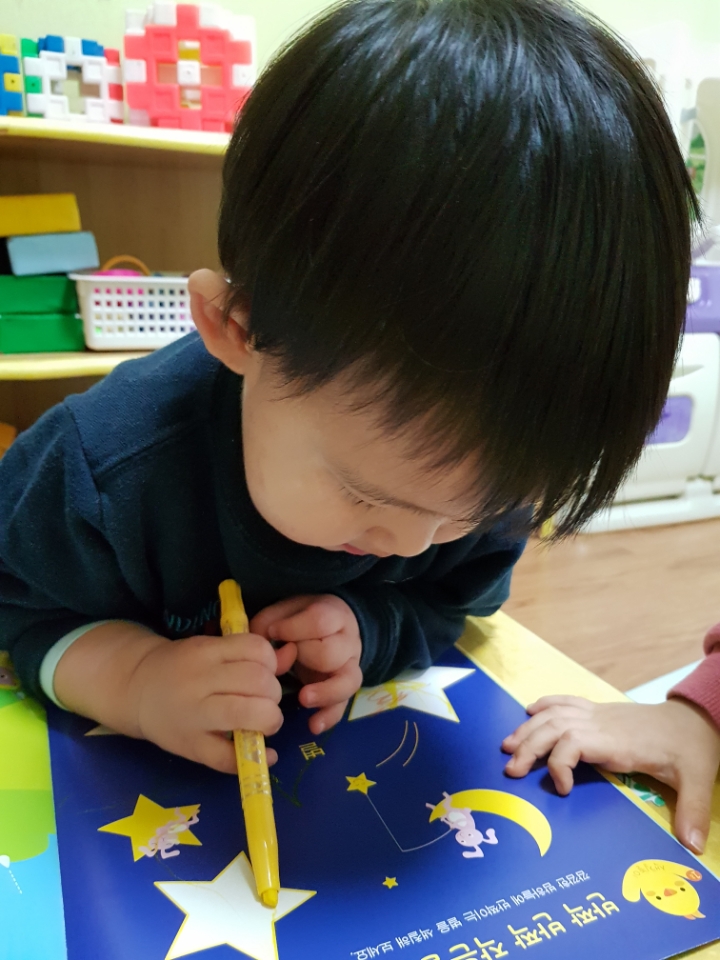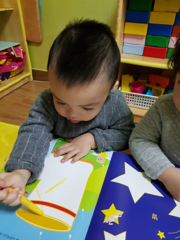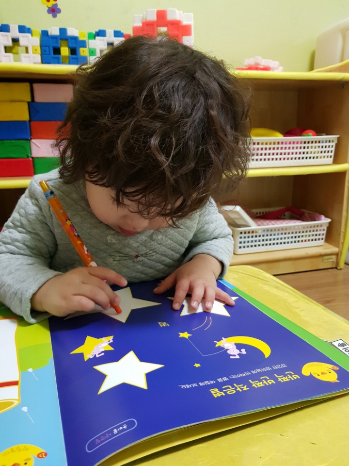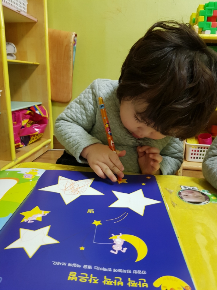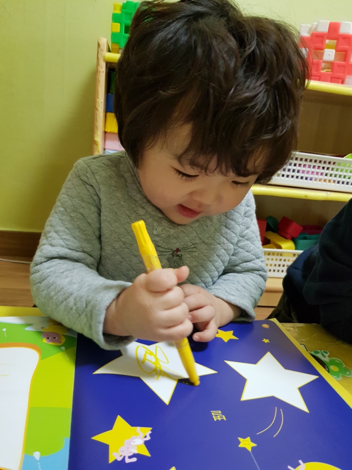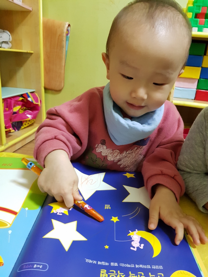 다함께 '반짝 반짝 작은별~~' 하고 노래를 부르며 크기가 다른 별모양 그림에 색칠을 하였습니다