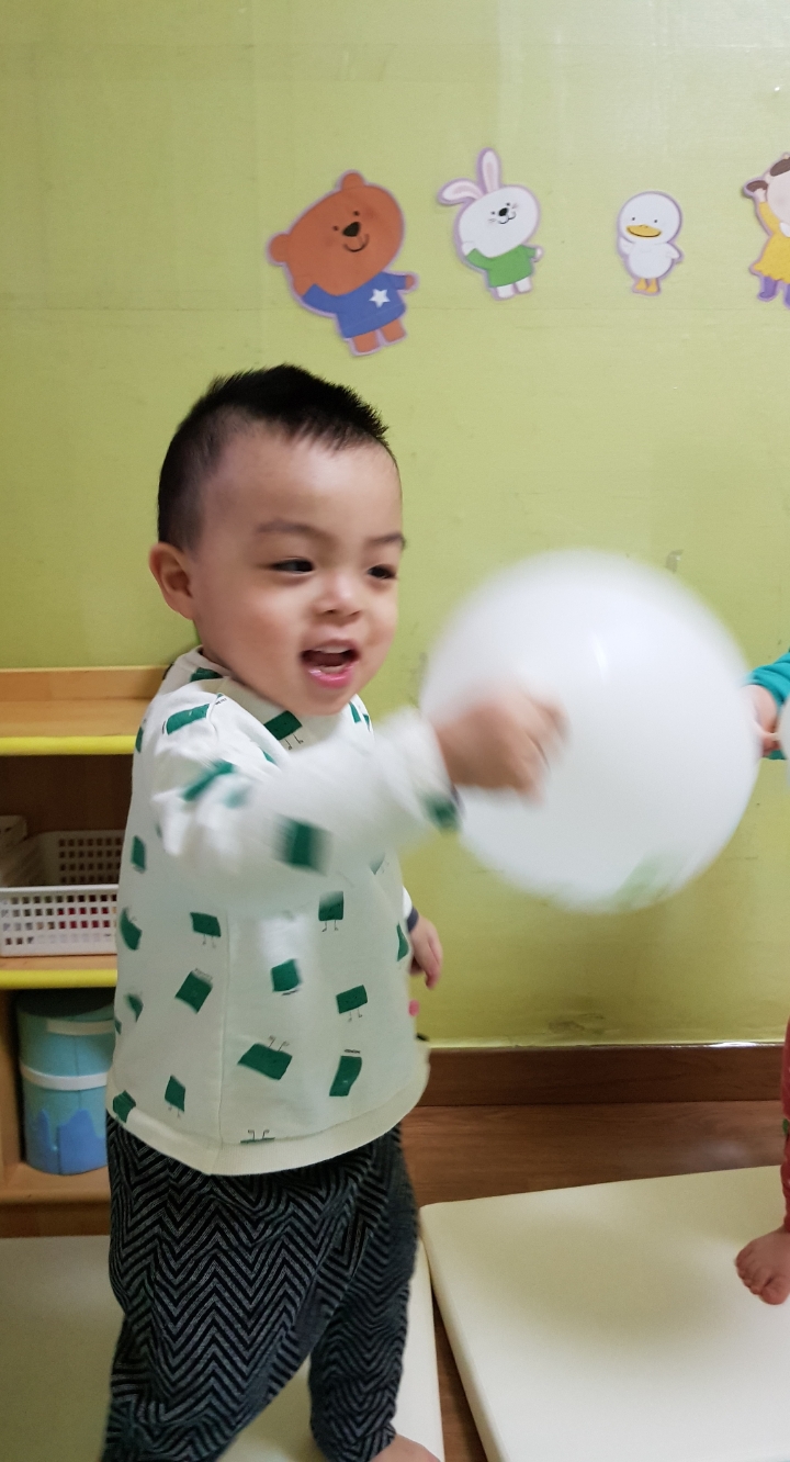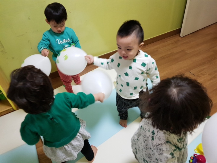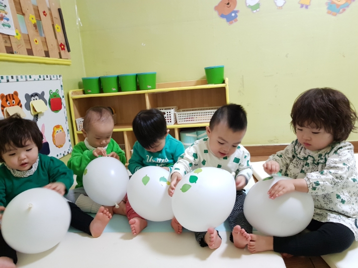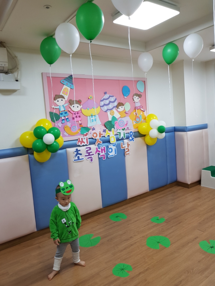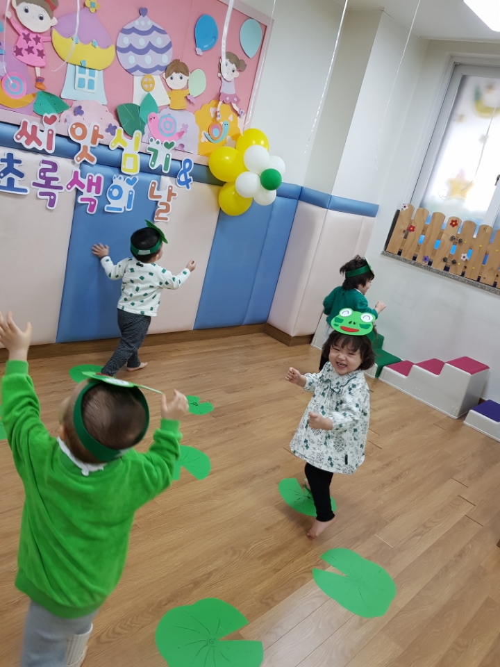*직접 초록 스티커를 붙인 풍선을 들고 '씨! 씨! 씨를 뿌리고~~' 동요 소리에 신나게 신체 놀이를 즐긴 오늘은 신나는 '초록데이' 였습니다