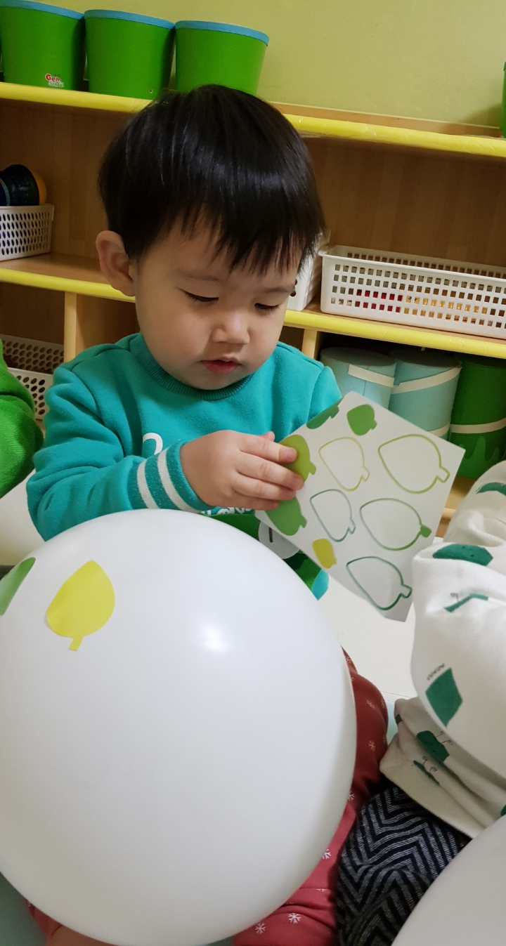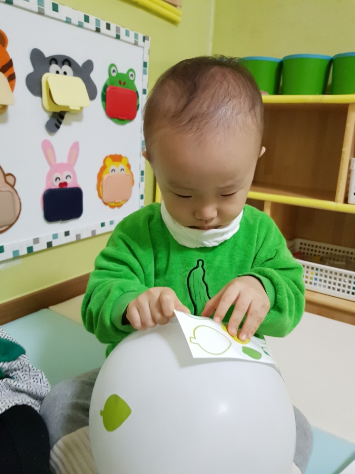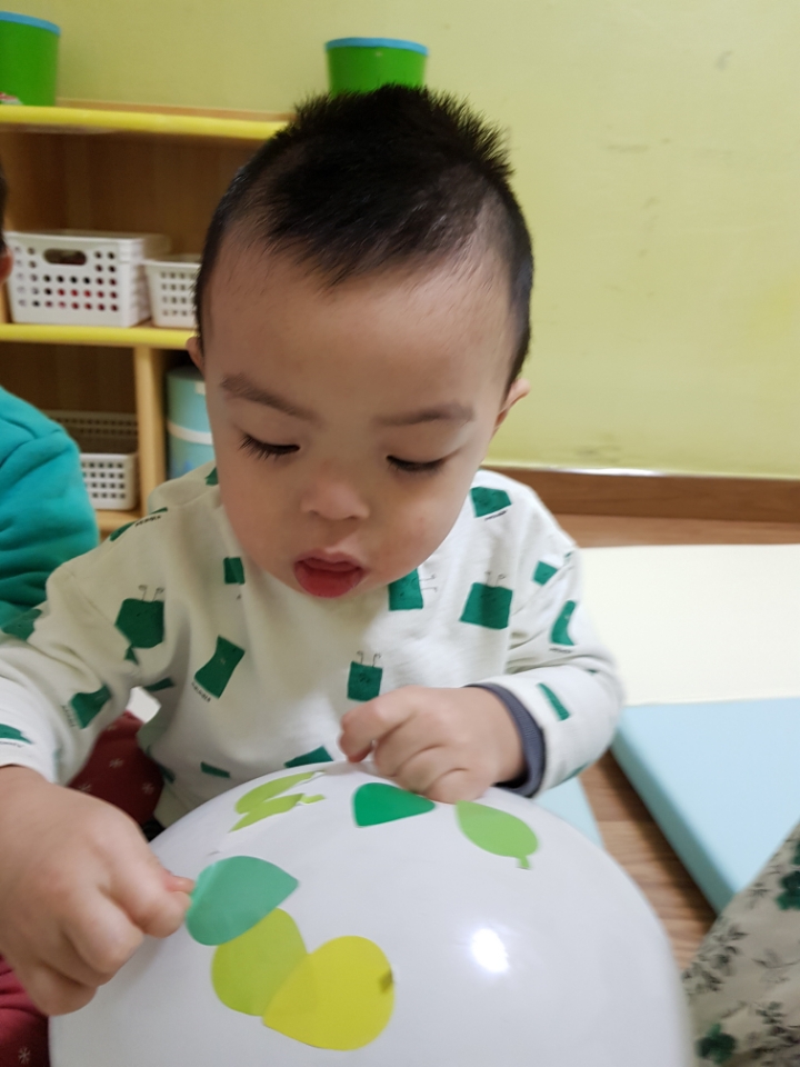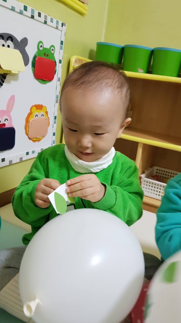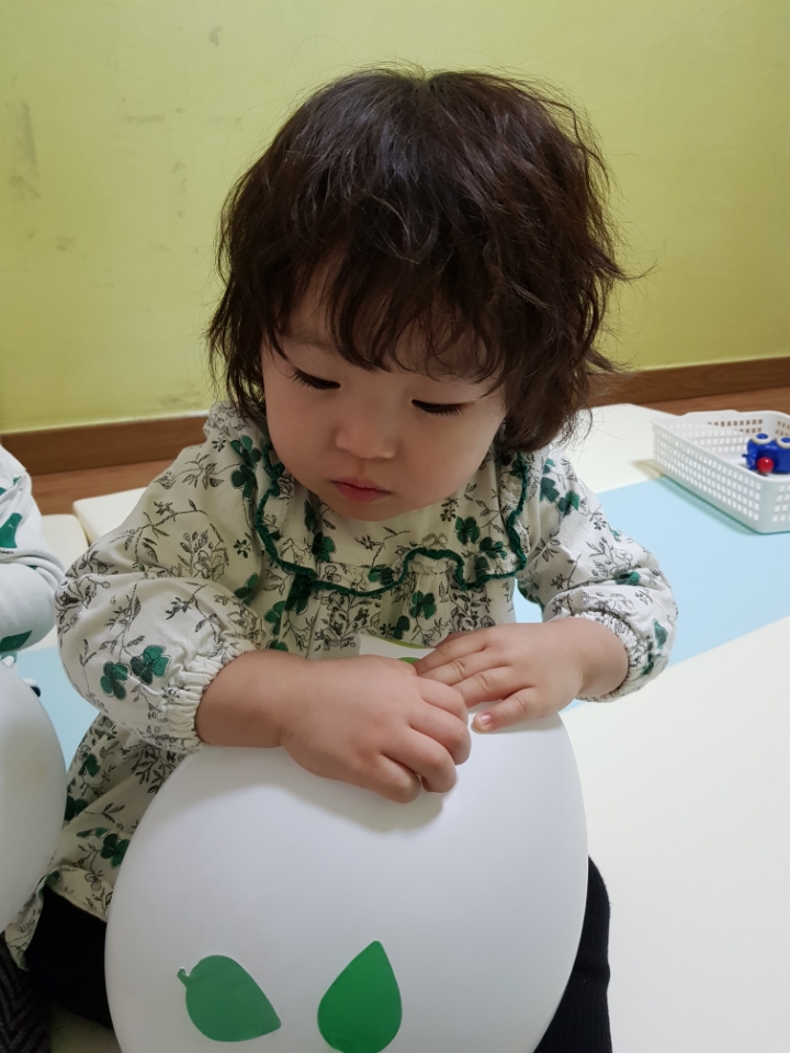 *꽃씨를 뿌려 직접 물주기도 한 후 풍선 위에 초록 스티커 붙이기를 해 보았습니다
