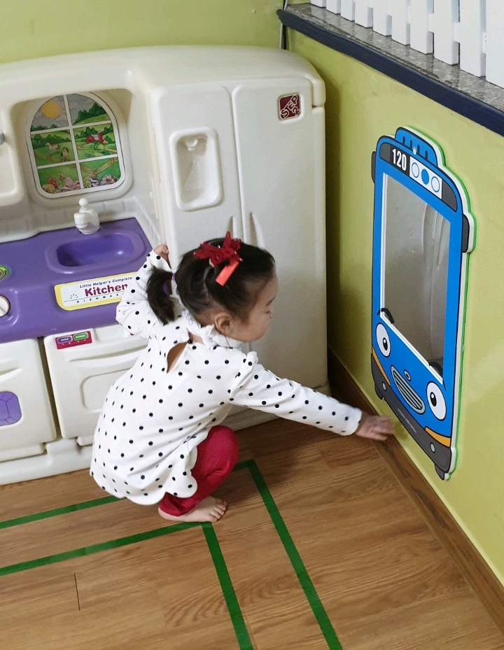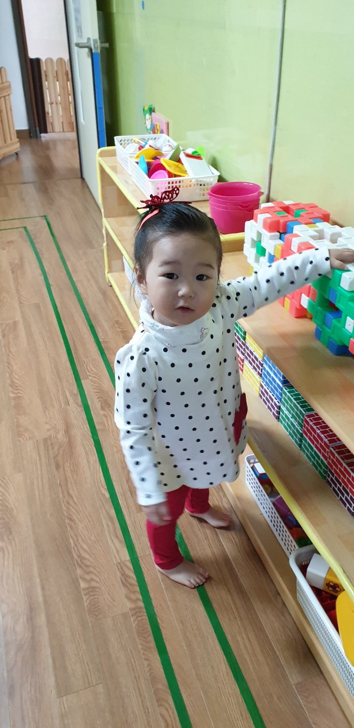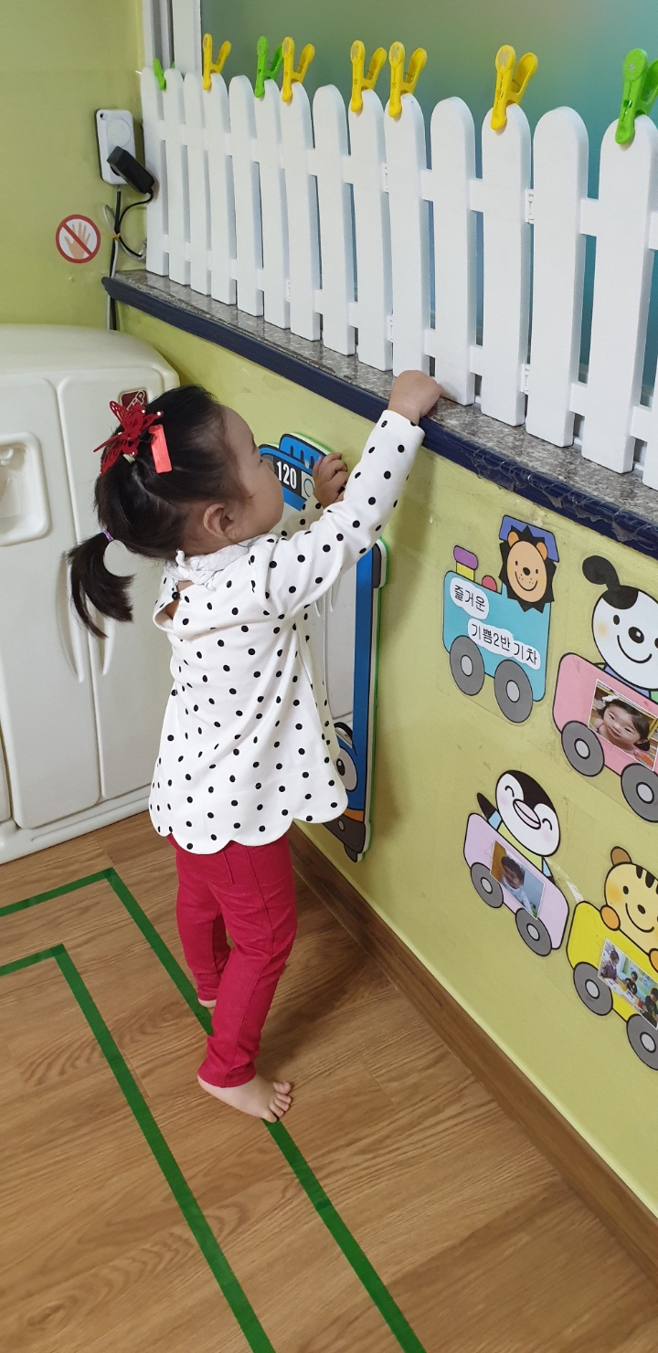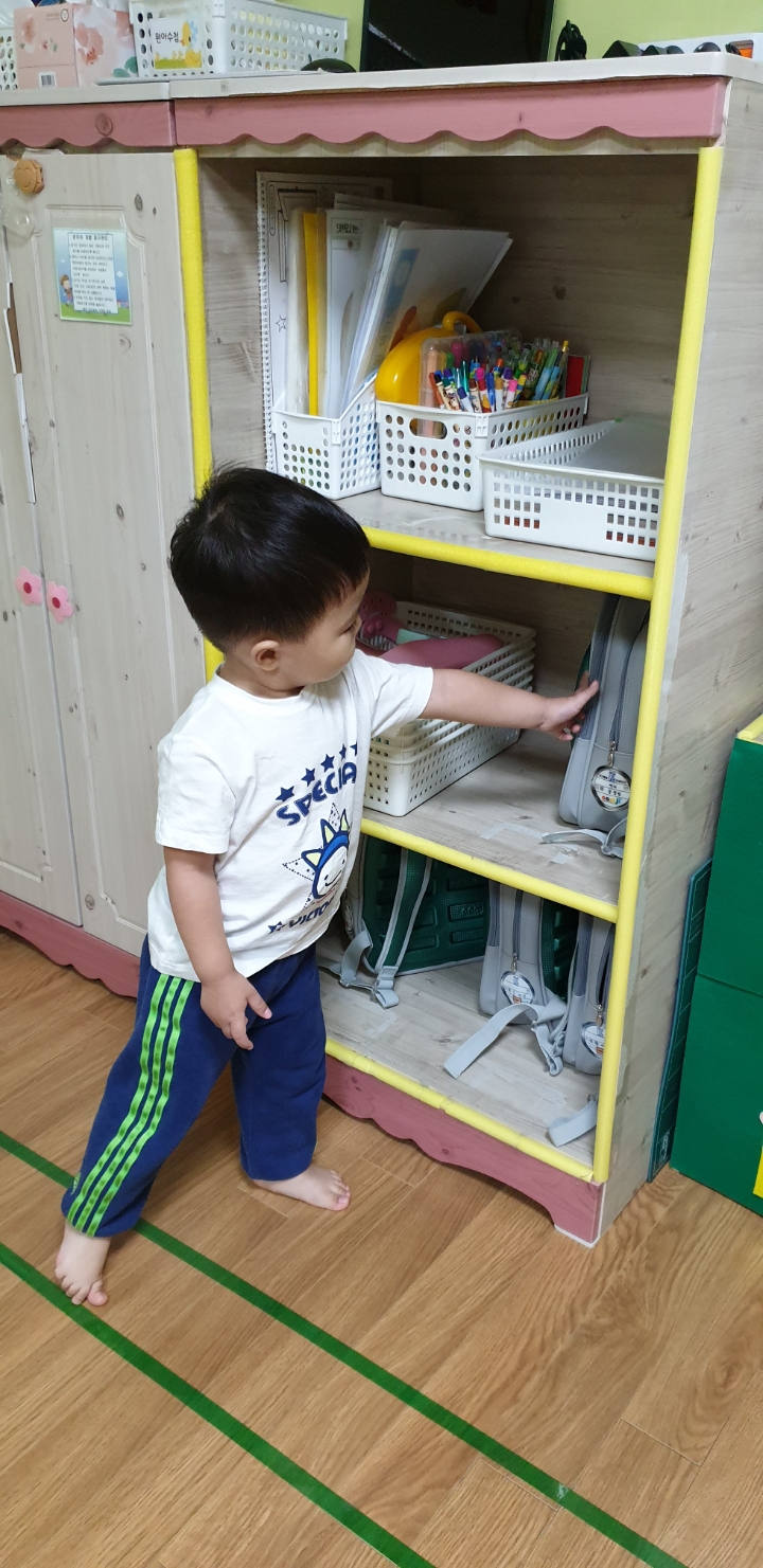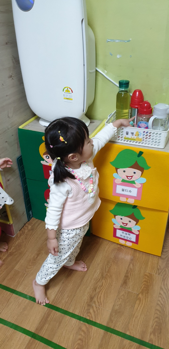 보육실 바닥에 두 개의 선을 붙여주고 선을 따라 걸어가며 이불장, 가방, 공기청청기, 휴지통, 변기, 문, 영아들 물병 등등을 찾아보고 살펴 보았어요.