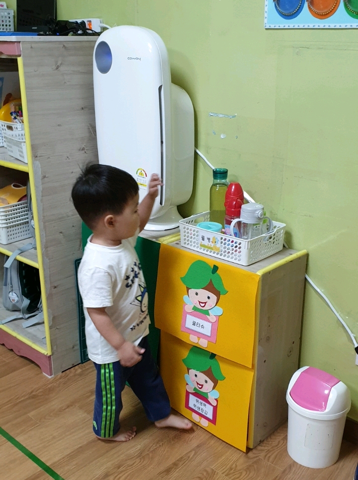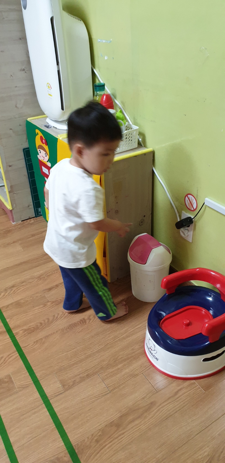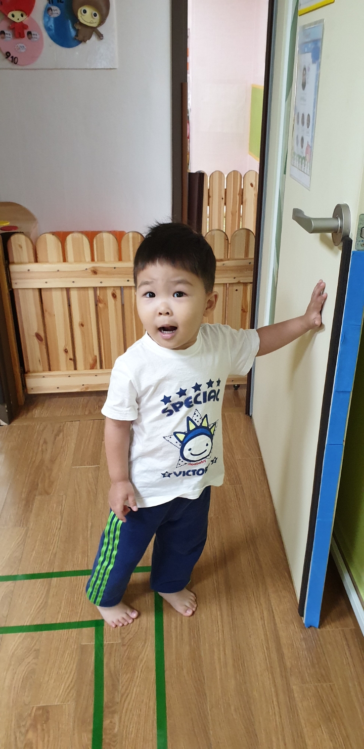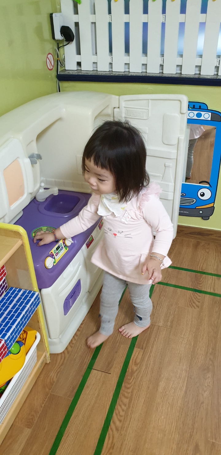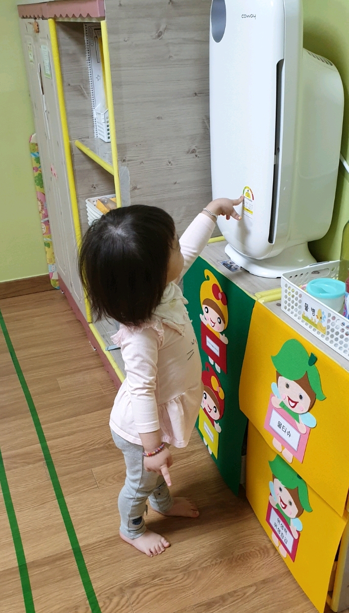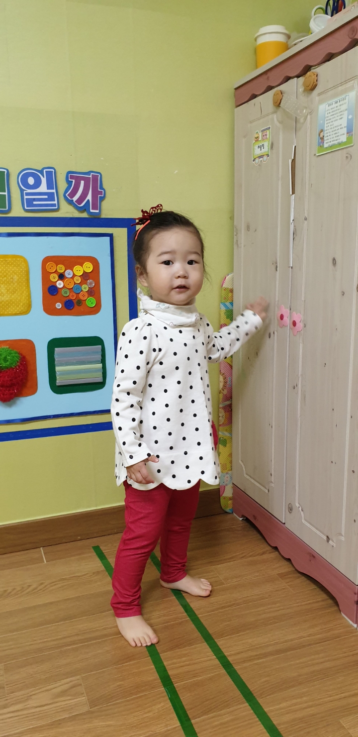 보육실 바닥에 두 개의 선을 붙여주고 선을 따라 걸어가며 이불장, 가방, 공기청청기, 휴지통, 변기, 문, 영아들 물병 등등을 찾아보고 살펴 보았어요.