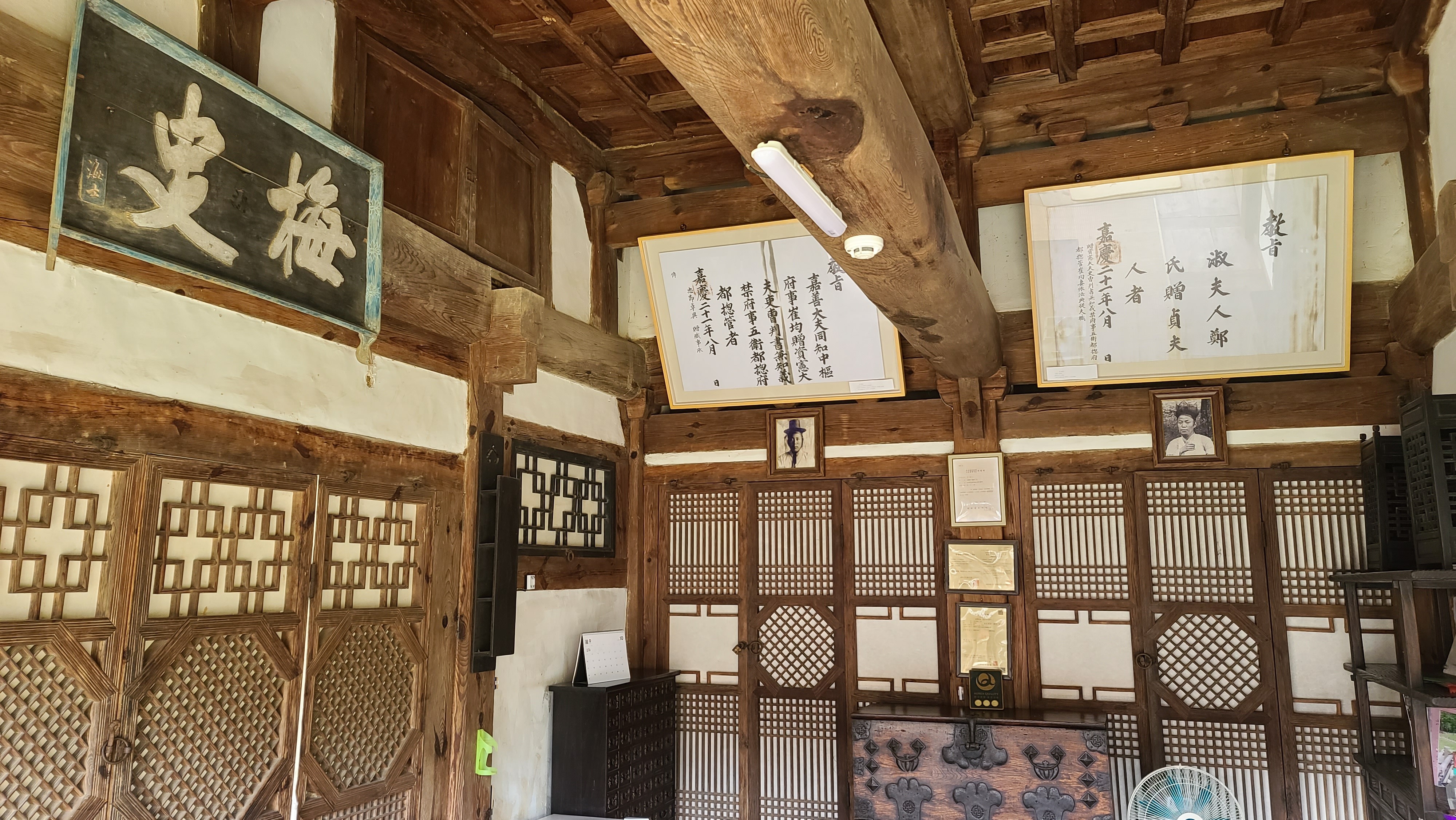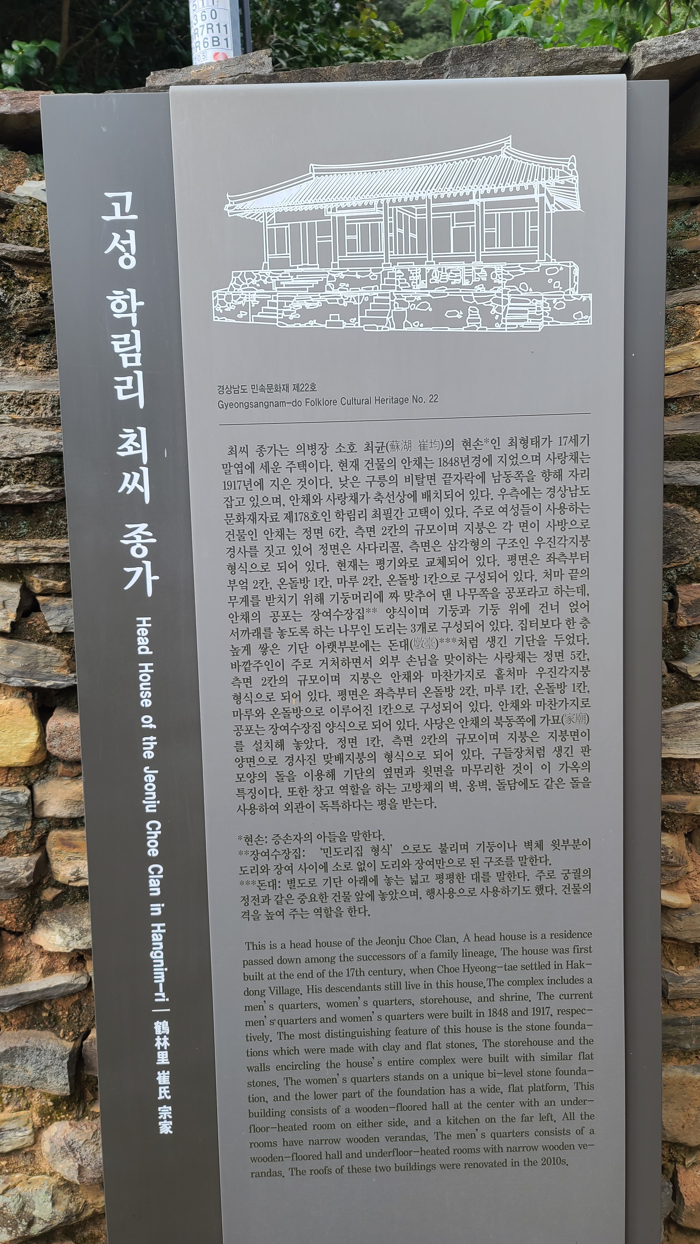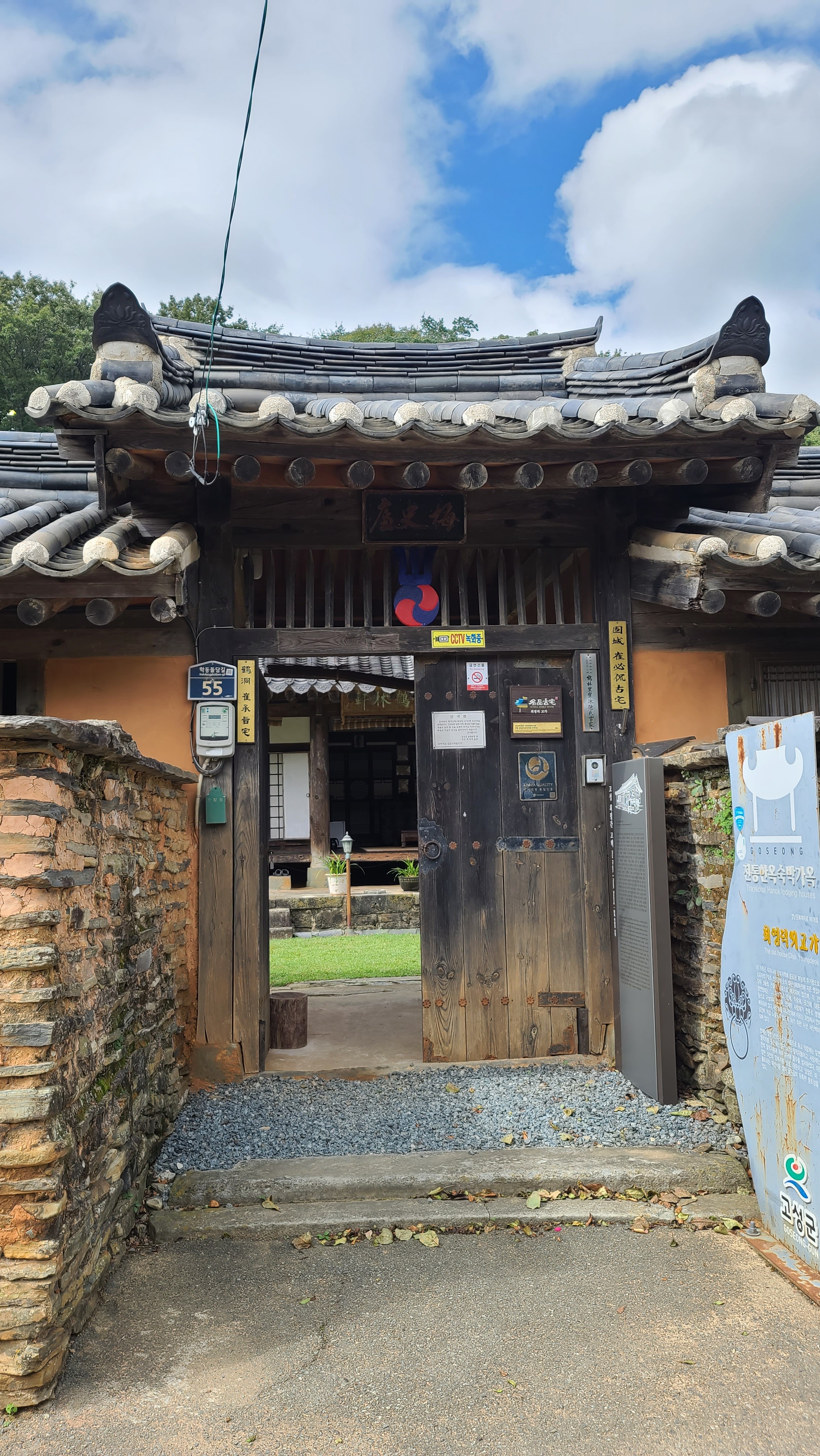 남파랑길 32코스에서 지금까지 자연 경관의 아름다움에 빠졌다면, 학동마을에서부터는 인간의 땀방울이 맺쳐있는 경관의 아름다움과 생활의 오랜 전통가옥의 아름다움을 살피며 감동한다. 학동마을은 전국 제일의 전주 최씨의 집성촌이라고 한다. 학동마을 옛 담장을 쌓은 선인들의 노력과 정성에 감탄한다. 고적한 분위기의 돌담길을 걸어 전주 최씨의 고택들을 살피며 인간 삶의 흔적을 들여다 보는 일은 남파랑길을 걷는 즐거움을 배가시킨다. 학동마을은 최형태公이 1670년경에 들어와 전주 최씨 세거지로 개창되었는데, 입향조 최형태公의 5세손 최필간公이 1809년경 분가하여 건립하였다는 최영덕씨 고가(=고성 최필간 고택=학동 최승지댁)가 학동마을 고택의 중심이 된다. 안내지를 읽어 보면 최필간公의 손자 매사(梅史) 최태순公이 학동마을 전주 최씨 가문을 부흥시키는 중심 역할을 한 것 같다. 고택 사랑채 현판은 학림헌, 대청마루 들보에 여러 '敎旨'를 표구한 것을 비롯하여 사진 등이 걸려 있는데, '梅史' 편액이 돋보였다.