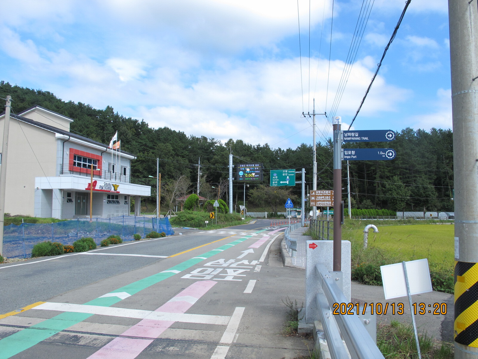 학동마을의 전통 한옥과 옛 담장, 돌담길을 걸어나오면 탁 트인 들녘과 목적지 임포항이 지척에 보인다. 남파랑길은 임포항으로 곧바로 나아가지 않고 오른쪽 금단마을의 하일초등학교를 거쳐 금단마을 입구 고성음악고등학교로 나온다. 금단마을 입구에서 남파랑길은 들녘길을 걸어 임포마을을 지나 임포항으로 나아간다. 학림리 학동마을이 전통마을의 묵향을 풍기는 수묵화 풍경이라면, 임포항으로 이어지는 임포마을은 다방, 횟집, 식당가, 현대 다층주택, 폐가 등 우리의 현재적 삶의 애환이 고스란히 드러나는 유채화 같다는 생각이 들었다.