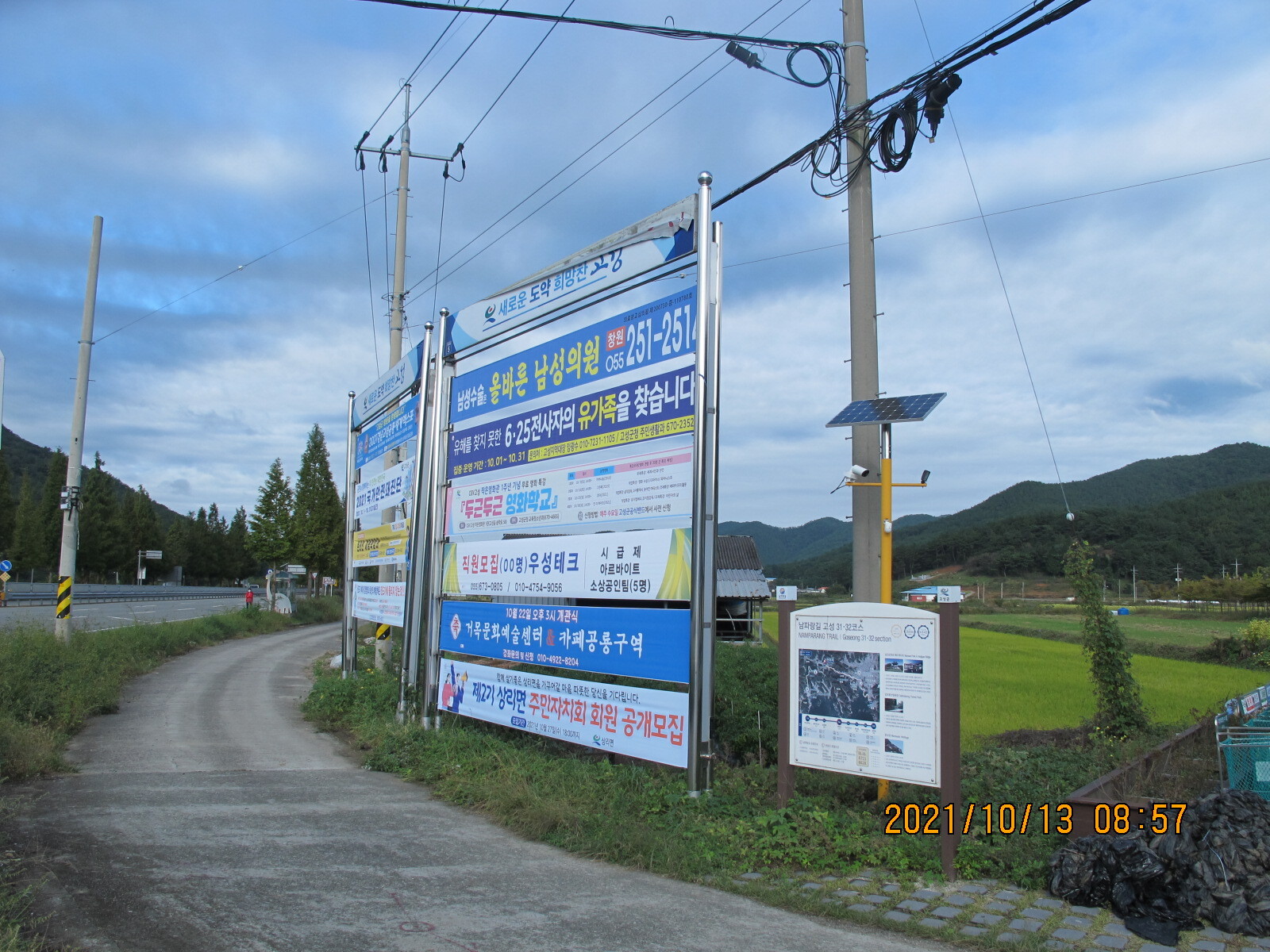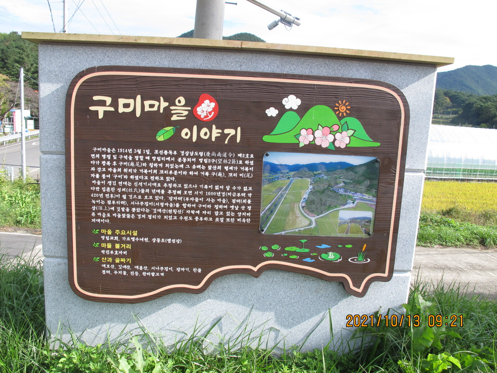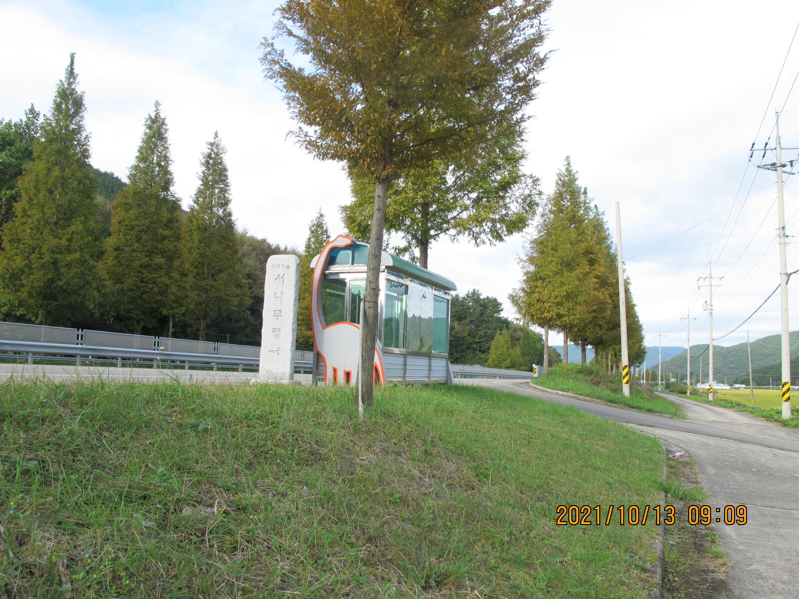 부포사거리에서 32코스 시작지점을 출발한다. 가을날 오전 9시의 햇볕이 좋다. 남파랑길은 사천·진주 방향 국도 33번 상정대로 옆 농로를 따라 이어진다. 오른쪽 황금들판 저편의 마을이 구미마을, 상동천이 마을 앞을 흐르고 있다. 상정대로 구미 버스정류장 옆에 구미마을 '서니무정' 표석이 세워져 있다. '서니무정'이 무슨 뜻일까? 건너편 구미마을을 바라보니 무성한 정자목 한 그루가 보인다. 아하, 저 나무가 서니무인가 보다. 그 아래 정자를 '서니무정'이라 이르는 것이겠지. 이렇게 추정하며 바삐 길을 걸었다. 구미마을 망림교회 입구에서 농로는 상정대로와 만난다. 상정대로 횡단보도 앞에 구미마을 설명안내판이 세워져 있어 설명글을 읽어보니 '서니무정'은 '서나무징이'를 이르며 '서정마을'을 가리키는 것임을 알았다. '서니무정'은 정자를 뜻하는 것이 아니라 부락을 이르며 구미마을은 장자터·점터·서나무징이 등 세 부락으로 구성되어 있음도 알았다.