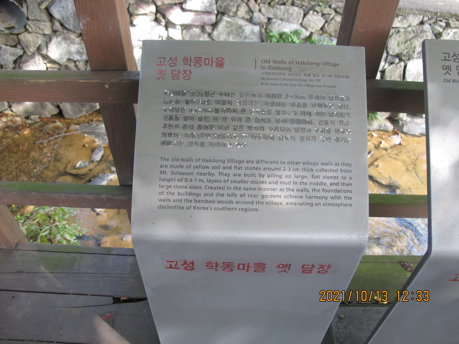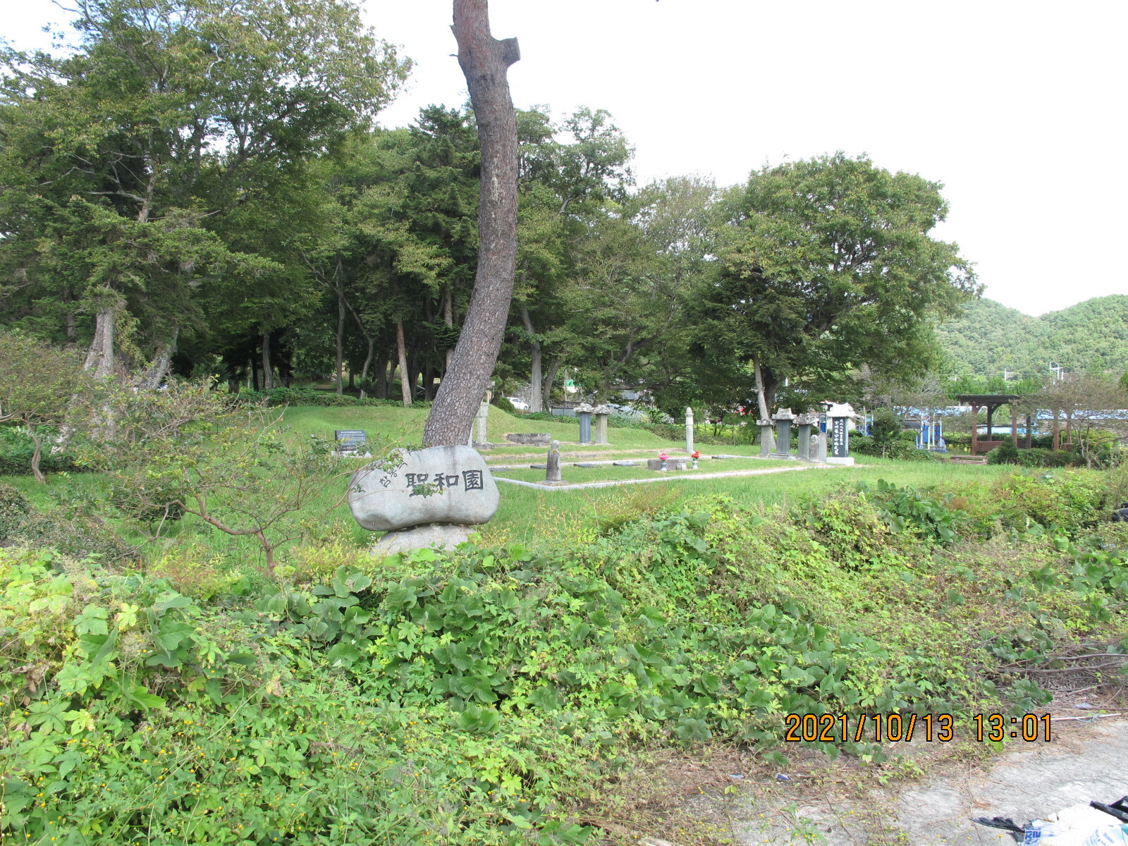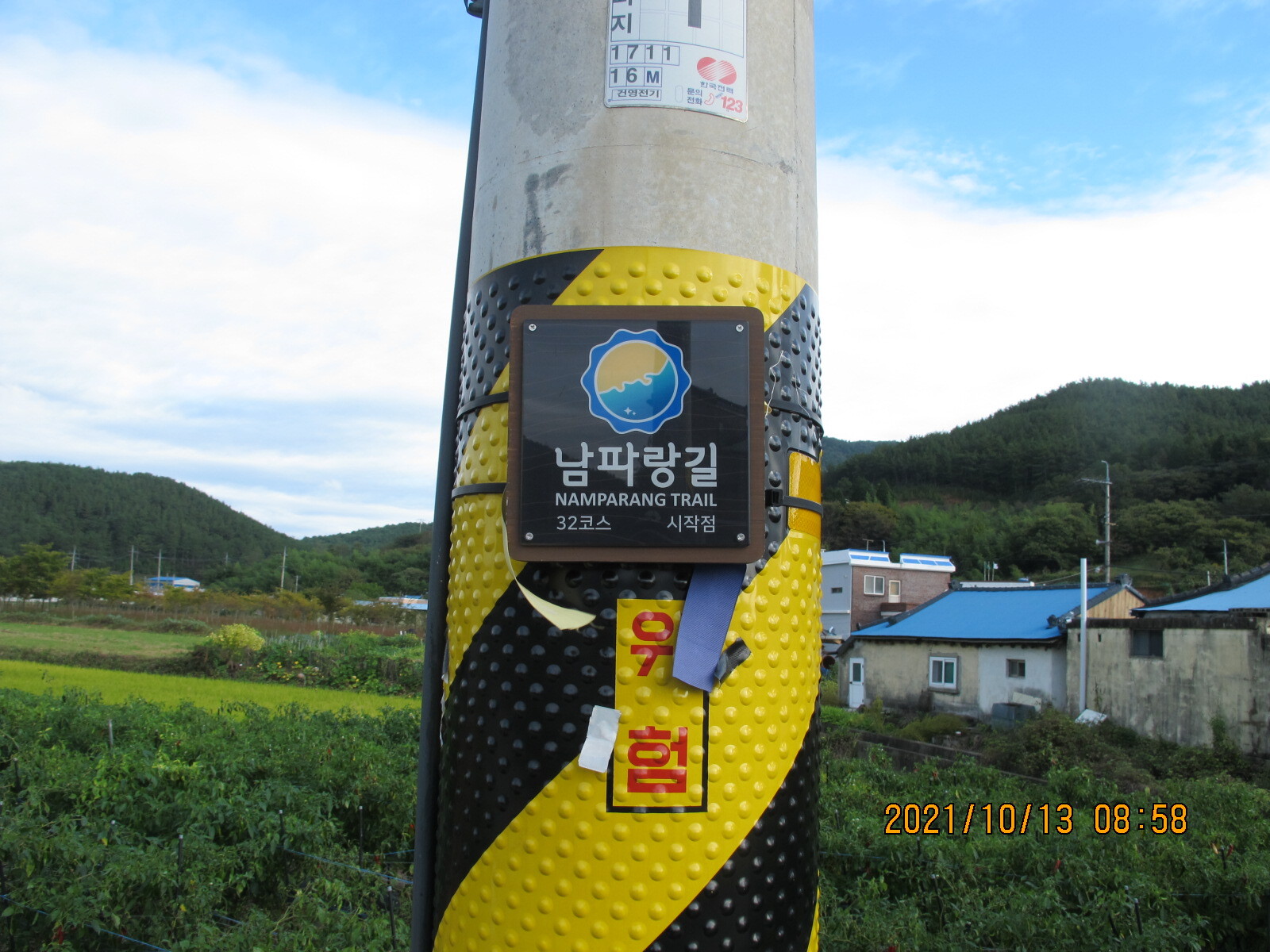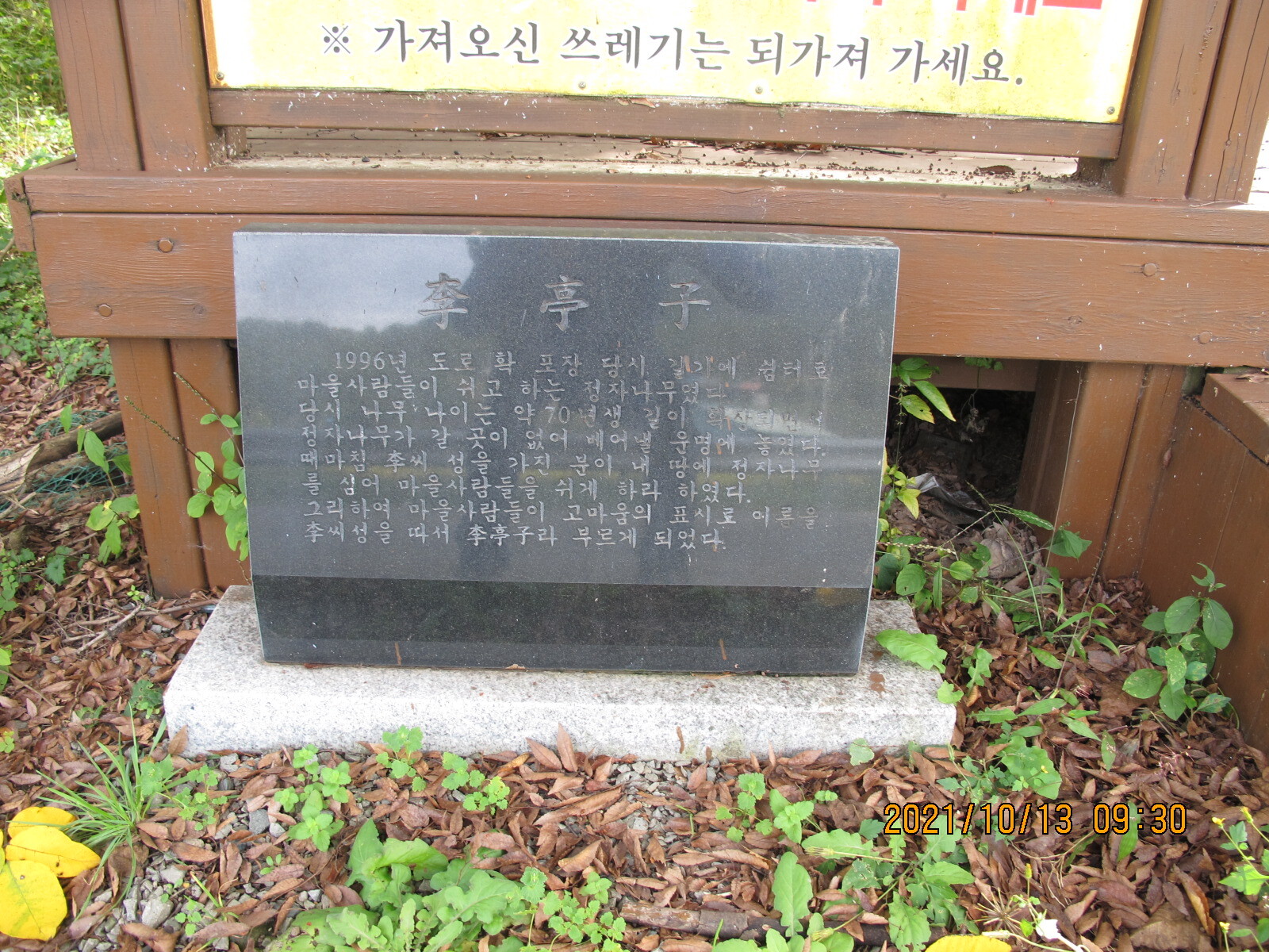 부포사거리에서 32코스 시작지점을 출발한다. 가을날 오전 9시의 햇볕이 좋다. 남파랑길은 사천·진주 방향 국도 33번 상정대로 옆 농로를 따라 이어진다. 오른쪽 황금들판 저편의 마을이 구미마을, 상동천이 마을 앞을 흐르고 있다. 상정대로 구미 버스정류장 옆에 구미마을 '서니무정' 표석이 세워져 있다. '서니무정'이 무슨 뜻일까? 건너편 구미마을을 바라보니 무성한 정자목 한 그루가 보인다. 아하, 저 나무가 서니무인가 보다. 그 아래 정자를 '서니무정'이라 이르는 것이겠지. 이렇게 추정하며 바삐 길을 걸었다. 구미마을 망림교회 입구에서 농로는 상정대로와 만난다. 상정대로 횡단보도 앞에 구미마을 설명안내판이 세워져 있어 설명글을 읽어보니 '서니무정'은 '서나무징이'를 이르며 '서정마을'을 가리키는 것임을 알았다. '서니무정'은 정자를 뜻하는 것이 아니라 부락을 이르며 구미마을은 장자터·점터·서나무징이 등 세 부락으로 구성되어 있음도 알았다.