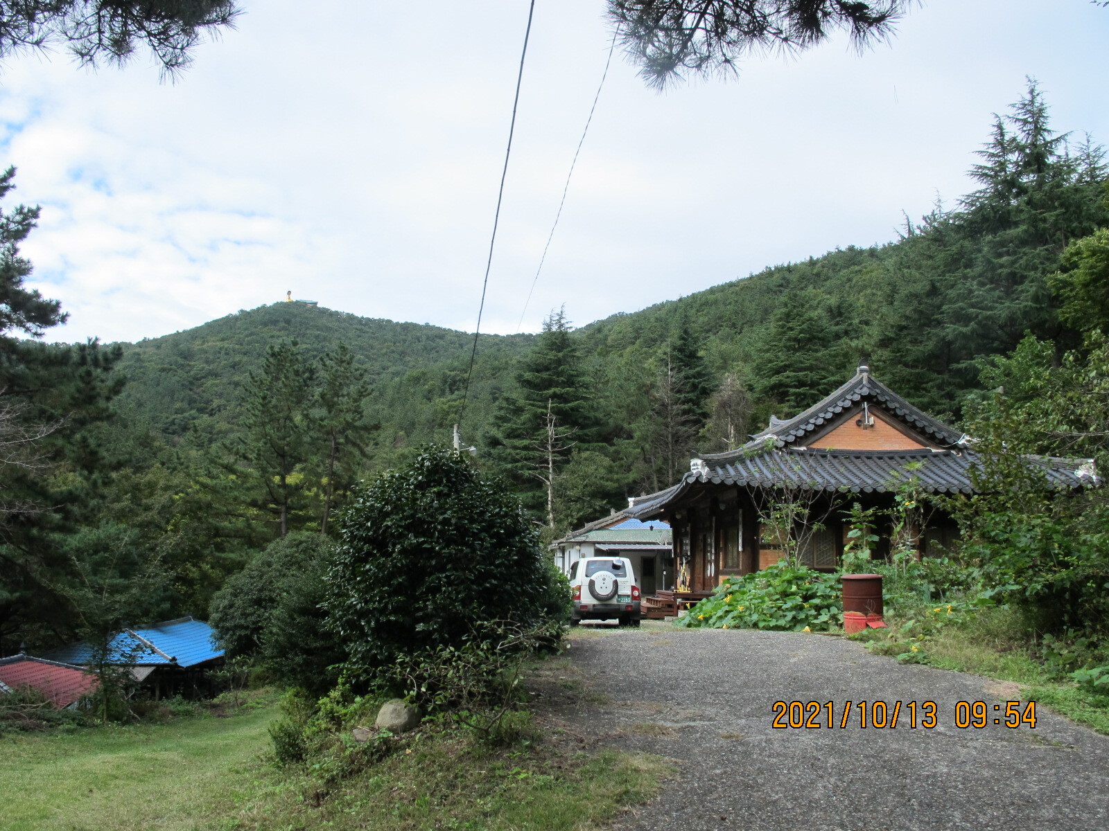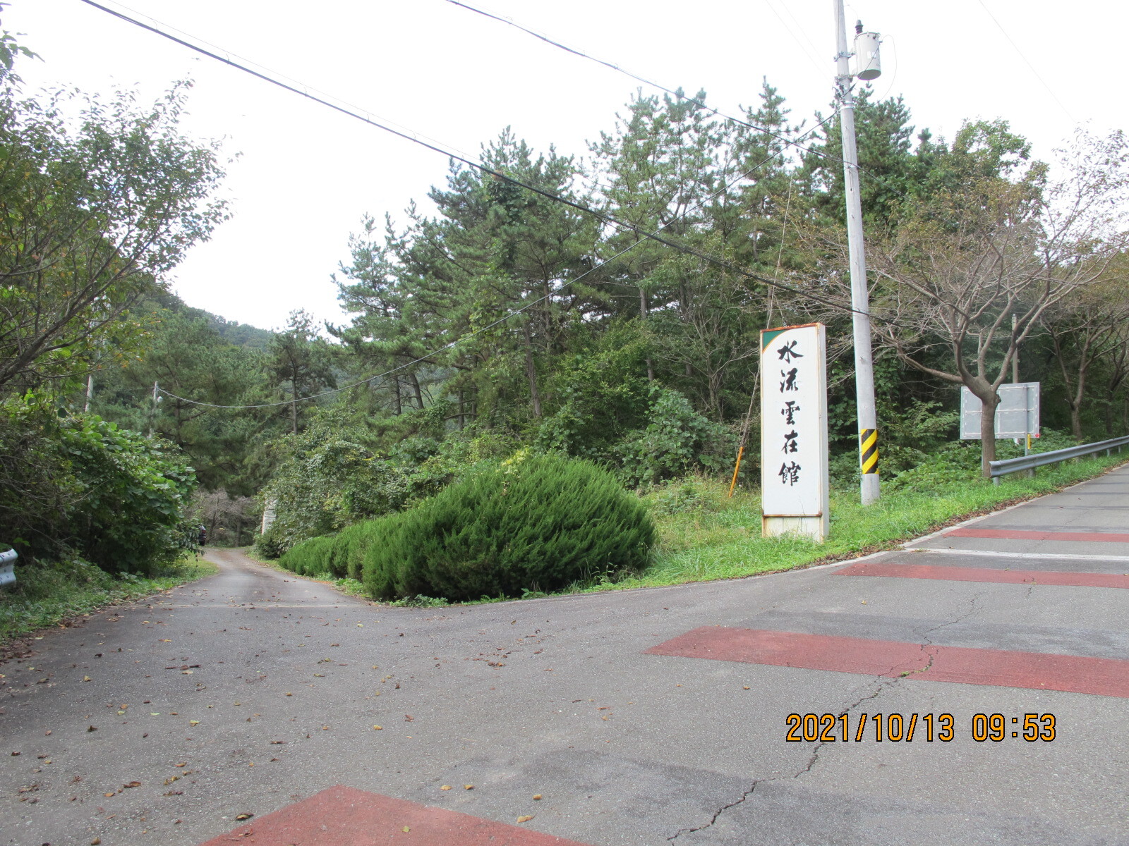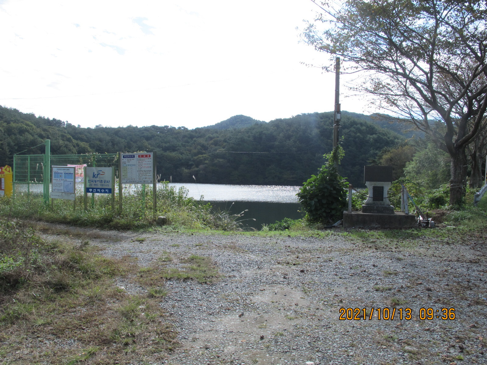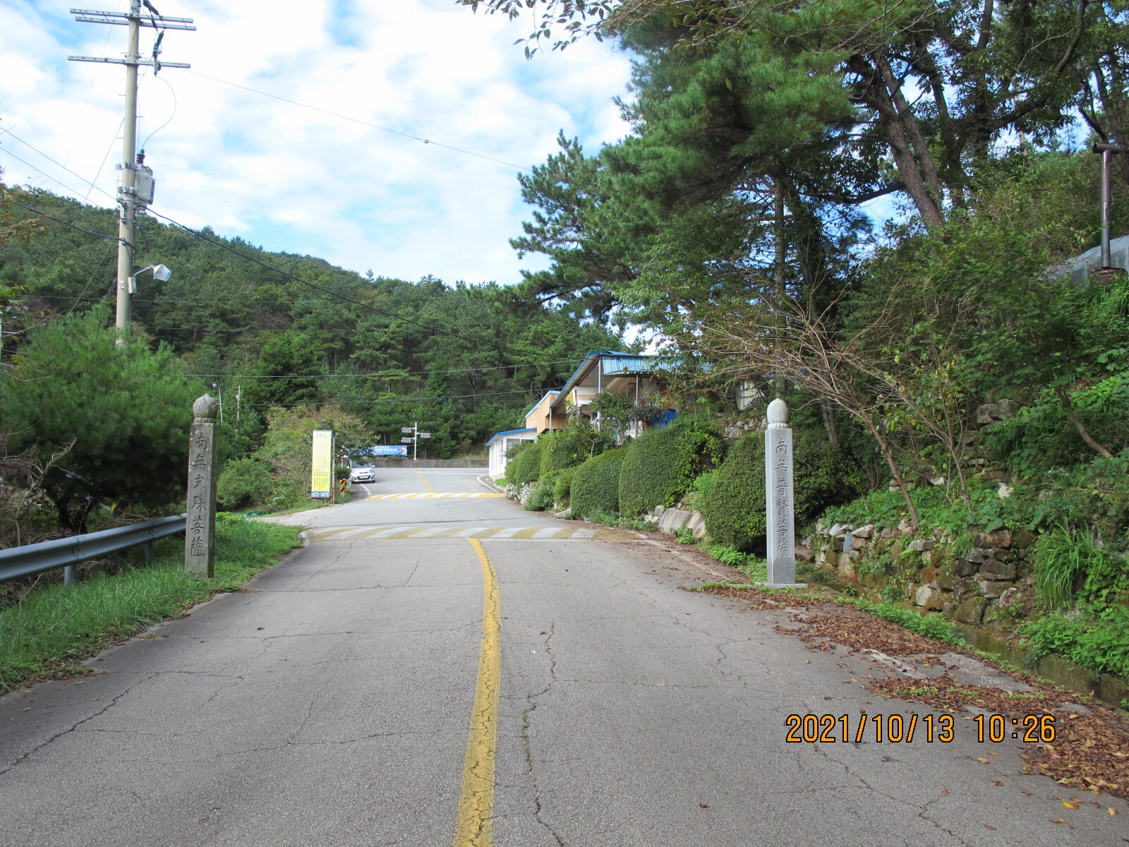 상정대로 횡단보도를 건너 선동마을로 들어선다. 앞쪽에 떡 버티고 서있는 산이 무이산, 이제부터 남파랑길 32코스는 무이산과 수태산 자락의 임도를 따라가는 지루한 길로 이어진다. 선동경로회관을 지나면 무선저수지, 조금 더 올라가면 문수식당 옆 무이산 등산로 입구다. 임도를 계속 따라가면 왼쪽에 호반모텔, 더 올라가면 '수류운재관'이라는 입간판이 세워져 있는데 가정집인지 음식점인지 구분할 수가 없다. 안쪽으로 들어가 보니 입구에 석장승 한 쌍이 세워져 있고, 그 안쪽에 일반 가정집이 있으며, 그 아래 계곡에도 주거시설이 있었다. 그곳에서 올려보니 수태산 아래 보현암 약사전의 거대한 약사여래금불좌상이 한 눈에 들어왔다. 이 금불좌상은 32코스 끝지점 학림리 하일초등학교와 하일교회에서도 하나의 징표가 되어 보였다.