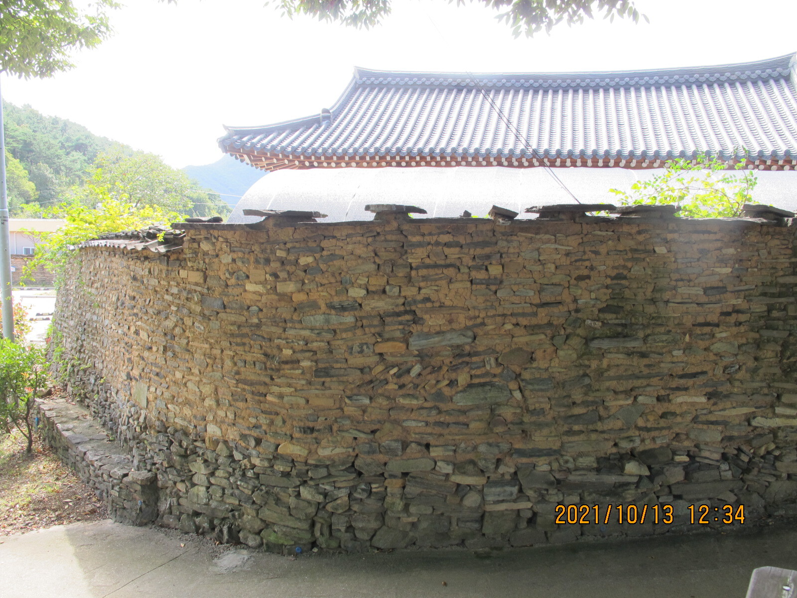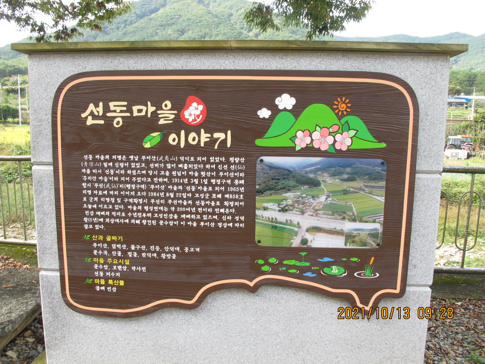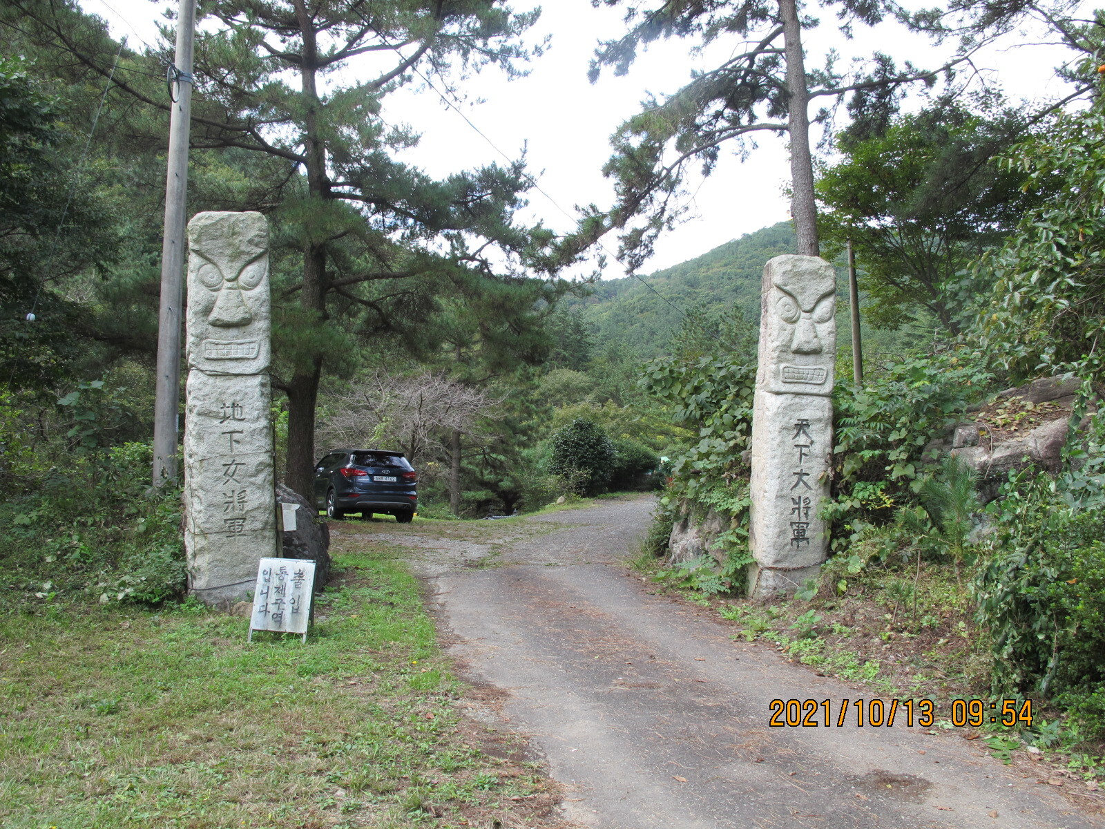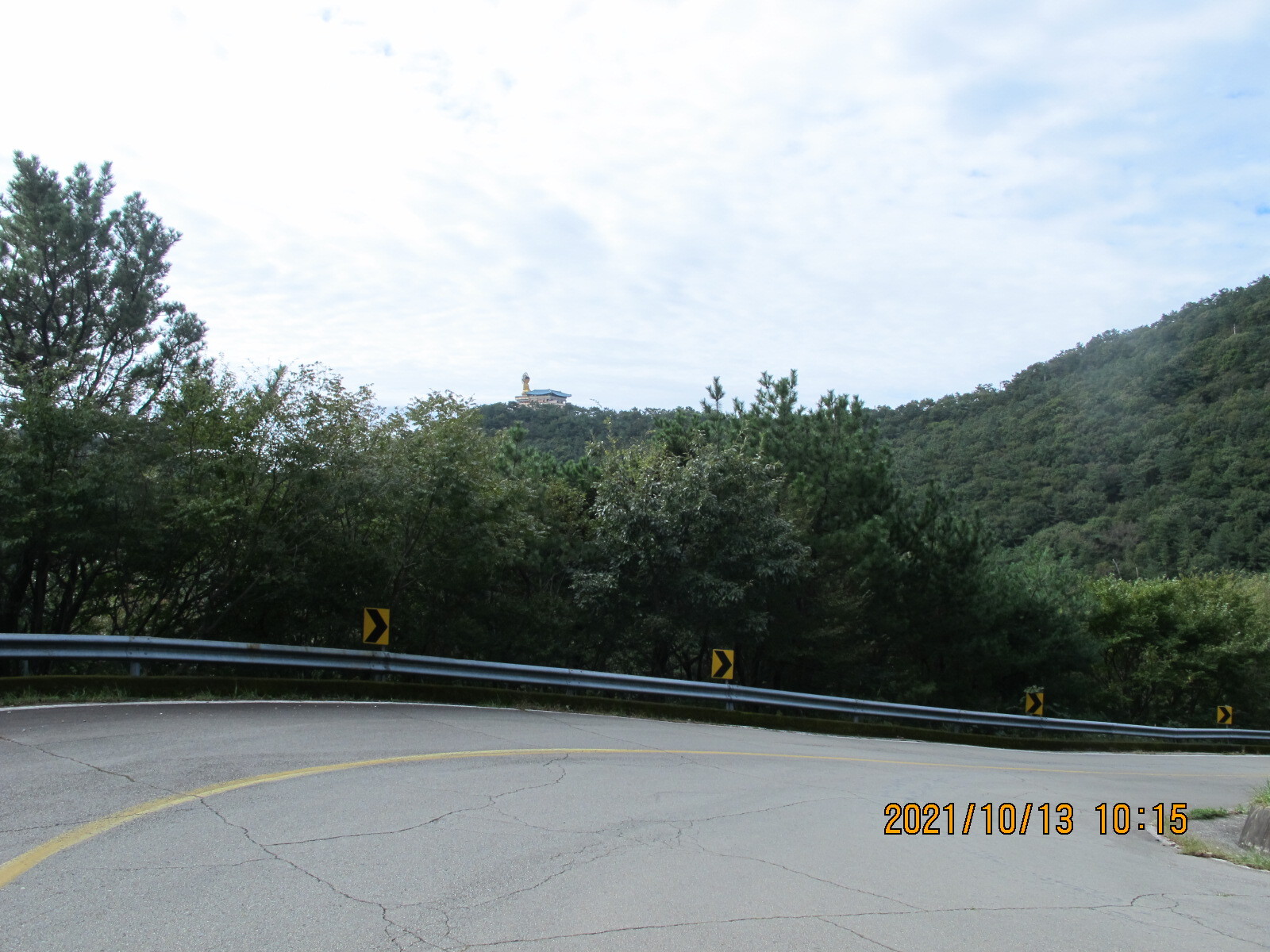 상정대로 횡단보도를 건너 선동마을로 들어선다. 앞쪽에 떡 버티고 서있는 산이 무이산, 이제부터 남파랑길 32코스는 무이산과 수태산 자락의 임도를 따라가는 지루한 길로 이어진다. 선동경로회관을 지나면 무선저수지, 조금 더 올라가면 문수식당 옆 무이산 등산로 입구다. 임도를 계속 따라가면 왼쪽에 호반모텔, 더 올라가면 '수류운재관'이라는 입간판이 세워져 있는데 가정집인지 음식점인지 구분할 수가 없다. 안쪽으로 들어가 보니 입구에 석장승 한 쌍이 세워져 있고, 그 안쪽에 일반 가정집이 있으며, 그 아래 계곡에도 주거시설이 있었다. 그곳에서 올려보니 수태산 아래 보현암 약사전의 거대한 약사여래금불좌상이 한 눈에 들어왔다. 이 금불좌상은 32코스 끝지점 학림리 하일초등학교와 하일교회에서도 하나의 징표가 되어 보였다.