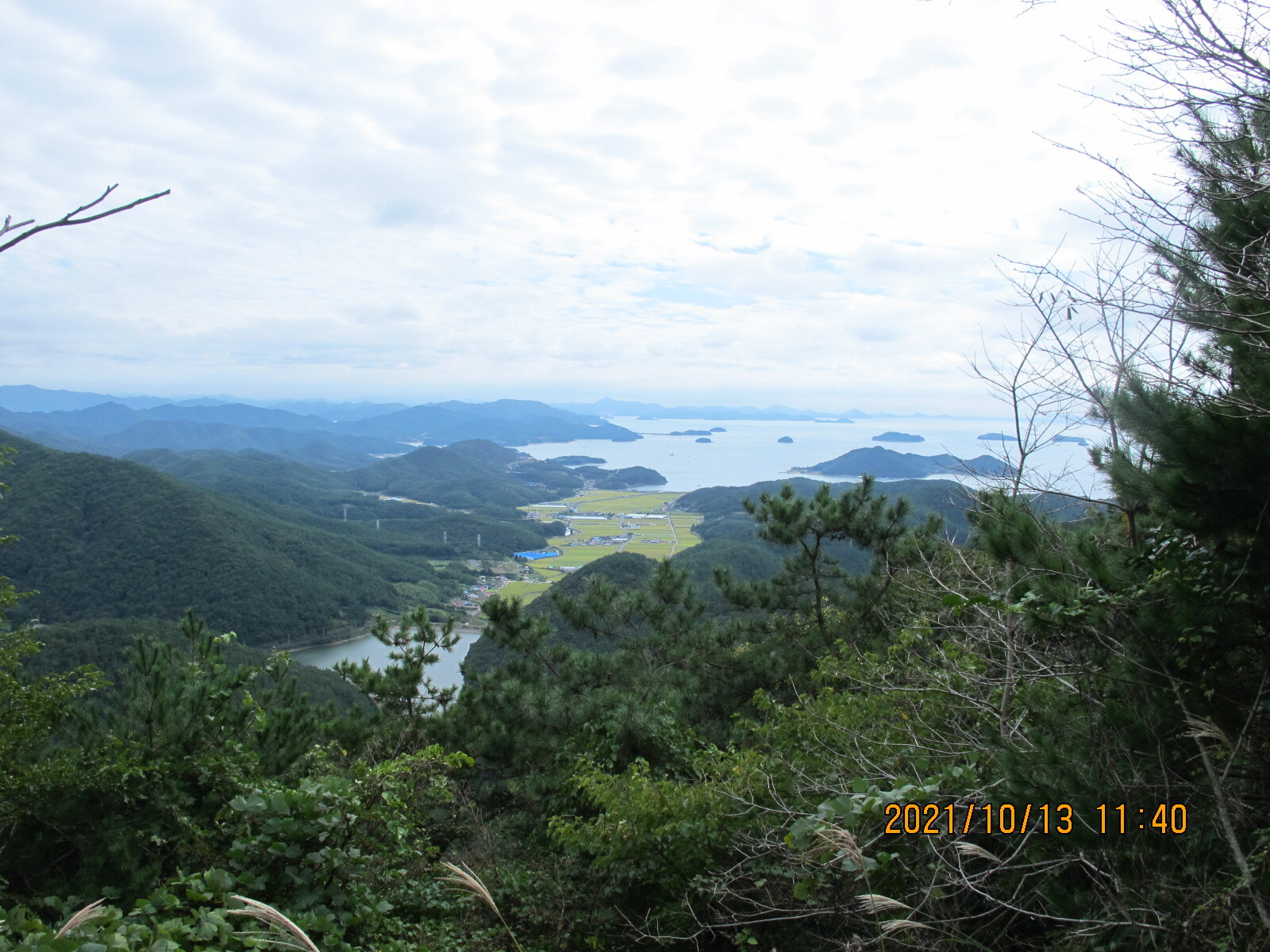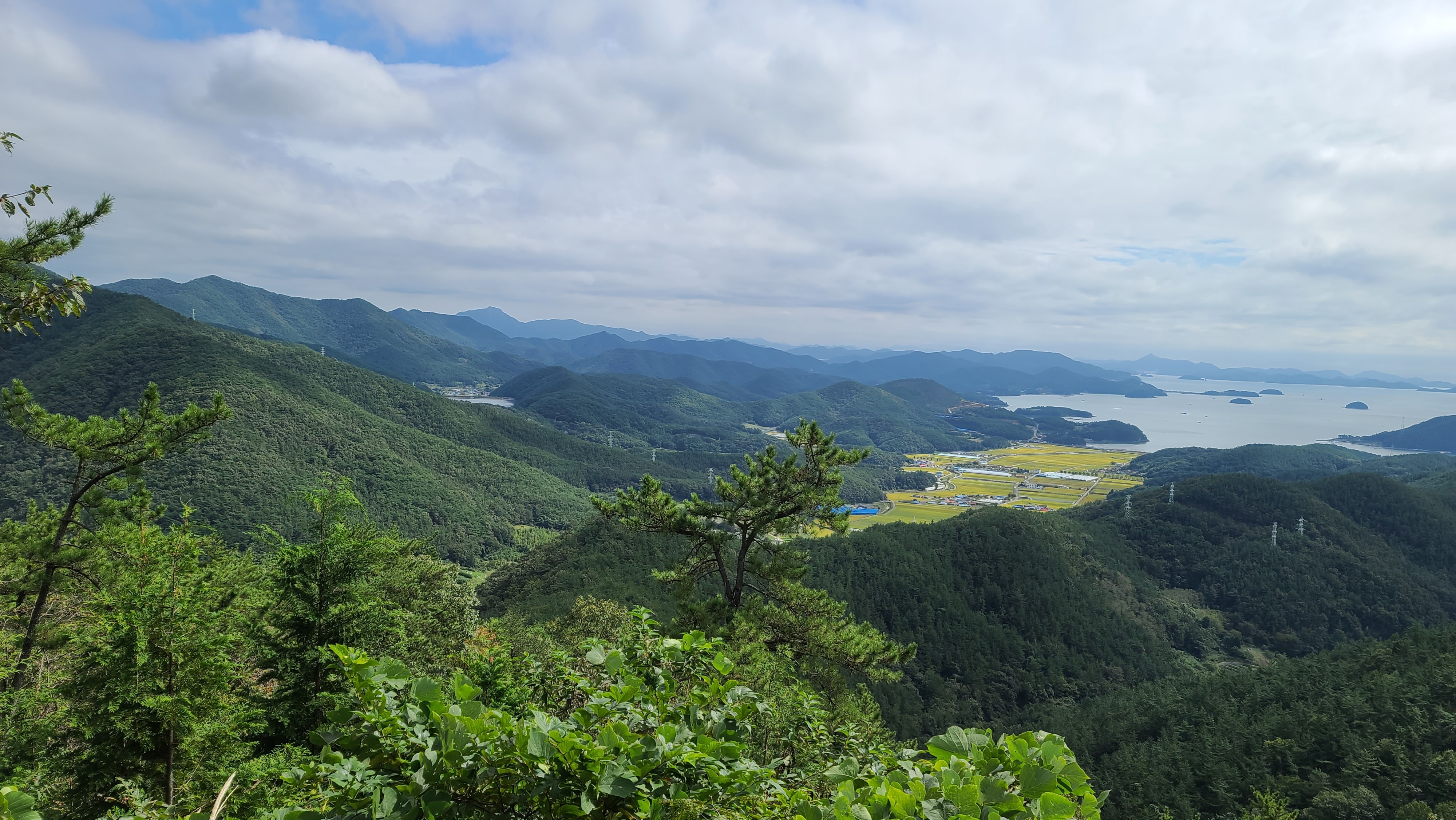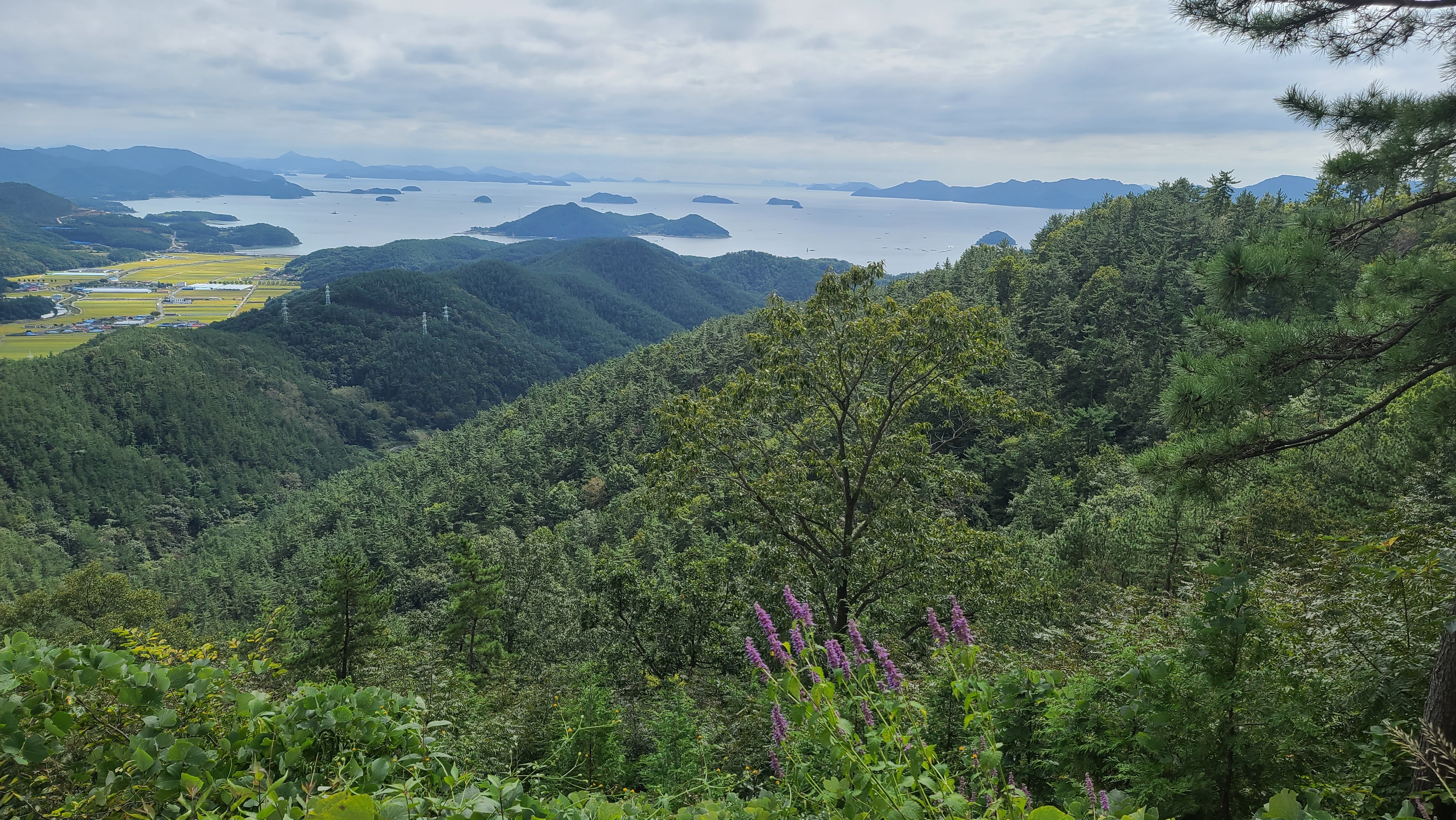 남파랑길 32코스의 어려움은 여기서 모두 끝난다. 이제부터는 다리의 고통을 지우며 눈의 복을 누리는 시간이다. 상리연꽃공원 갈림목과 수태재를 지나면서 왼쪽으로 수태산-보현암 약사전 거대한 약사여래금불좌상-돌구산의 산줄기와 대상물을 살피는 일은 가슴 벅차다. 또 앞쪽으로 자란만과 자란도를 비롯한 섬들이 있는 한려해상경관에 환호하며 넋을 빼앗긴다. 특히 임도의 쉼터정자에서 바라보는 자란만과 멀리 벽방산 풍경을 조망하는 것이 압권이었다.