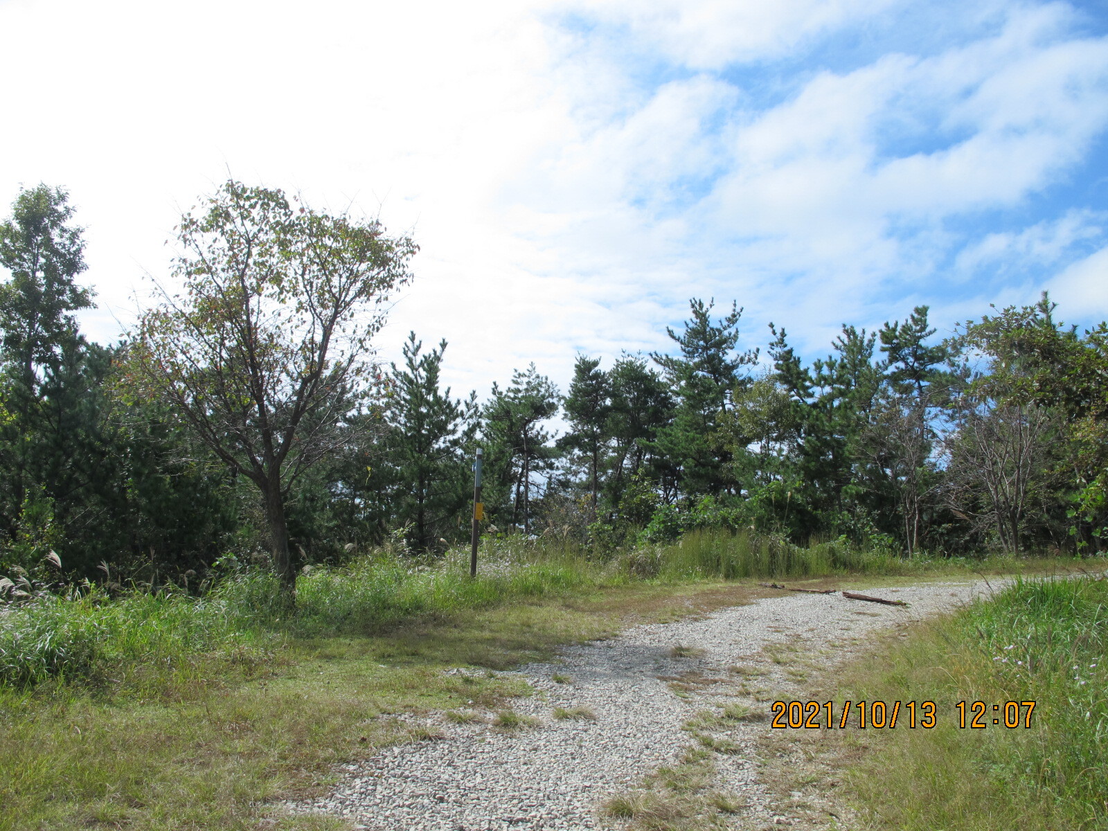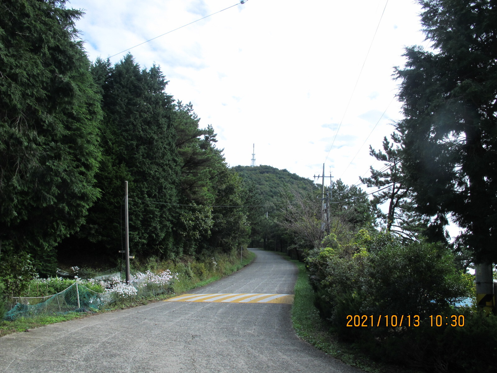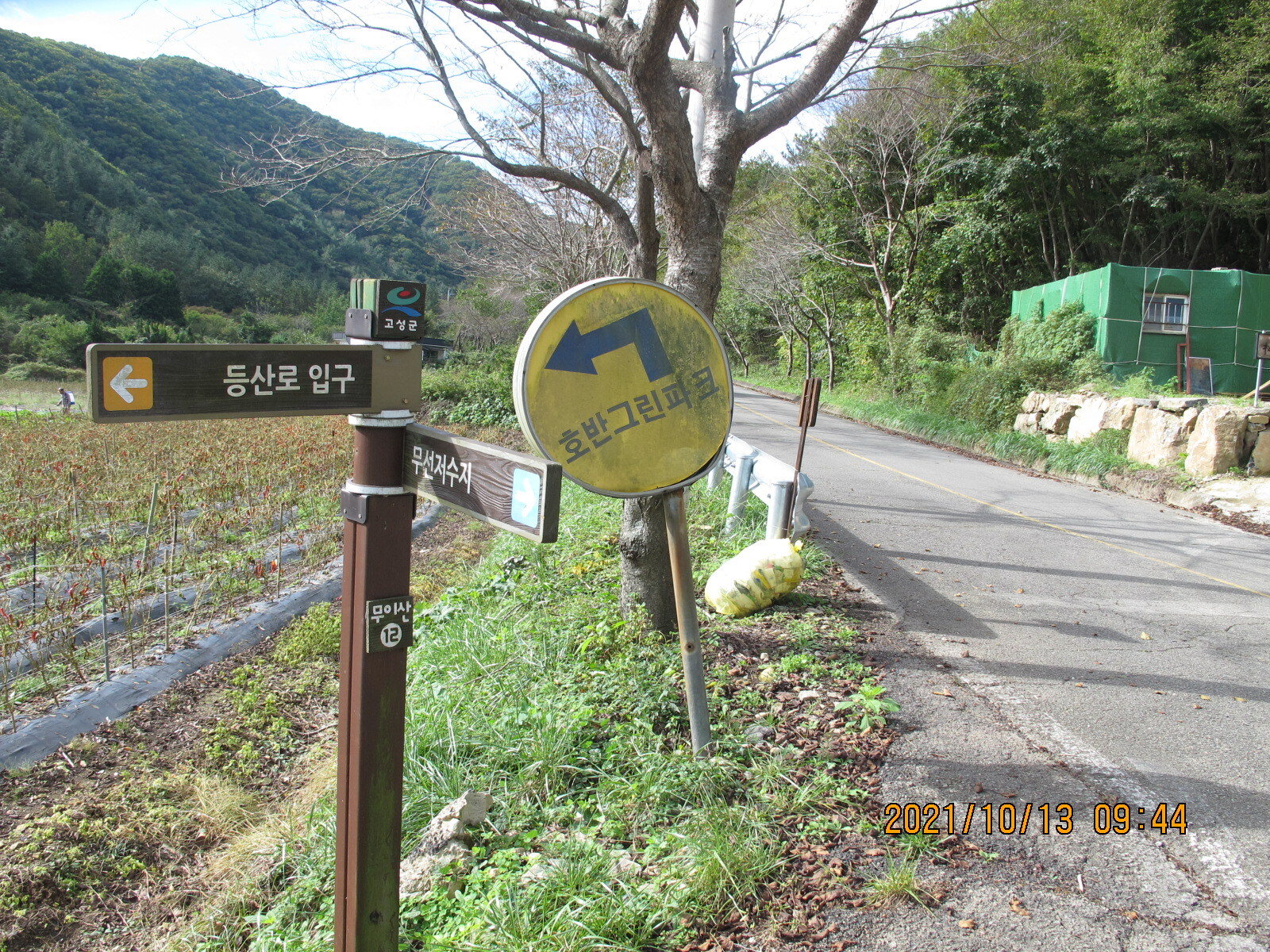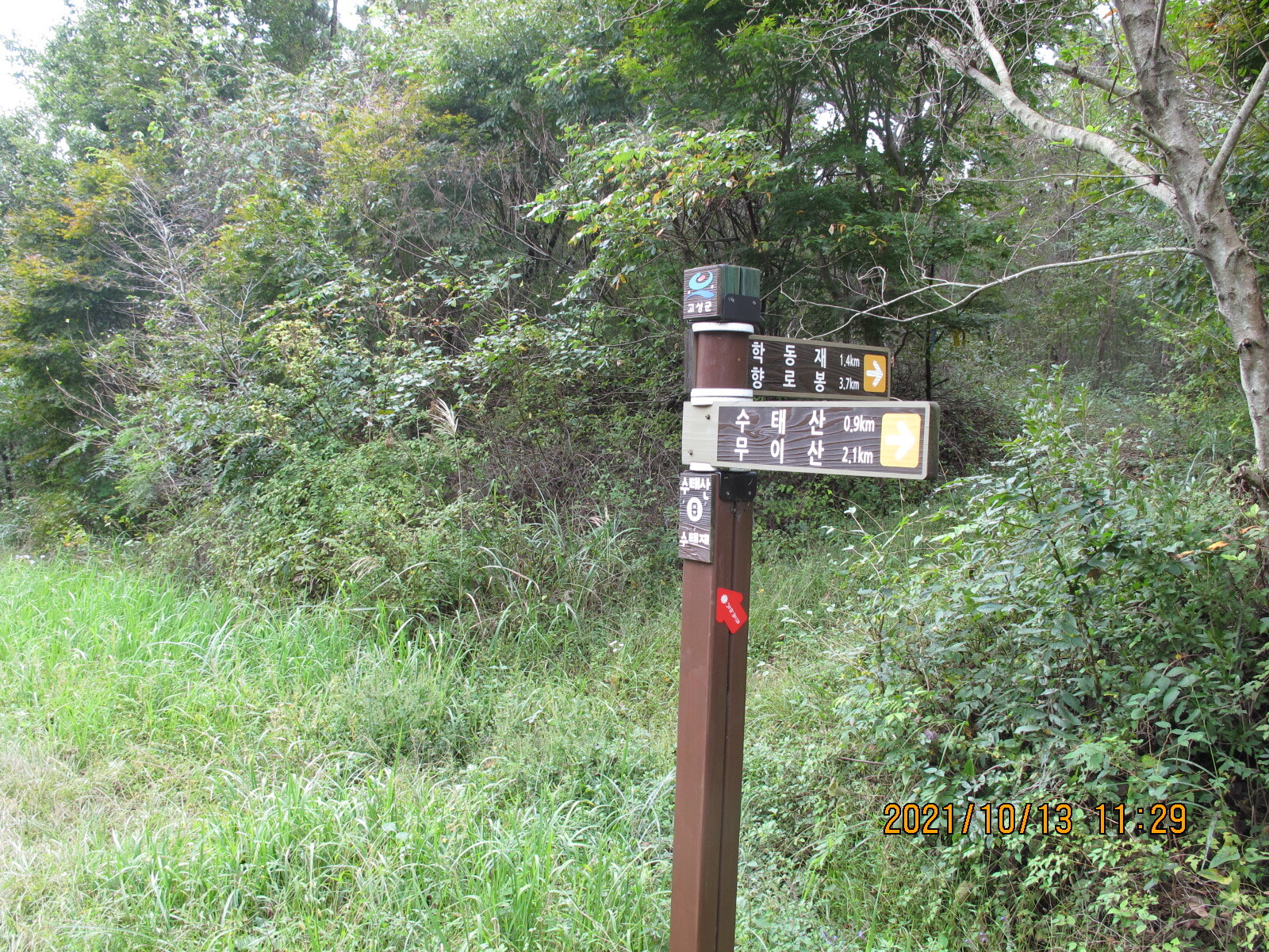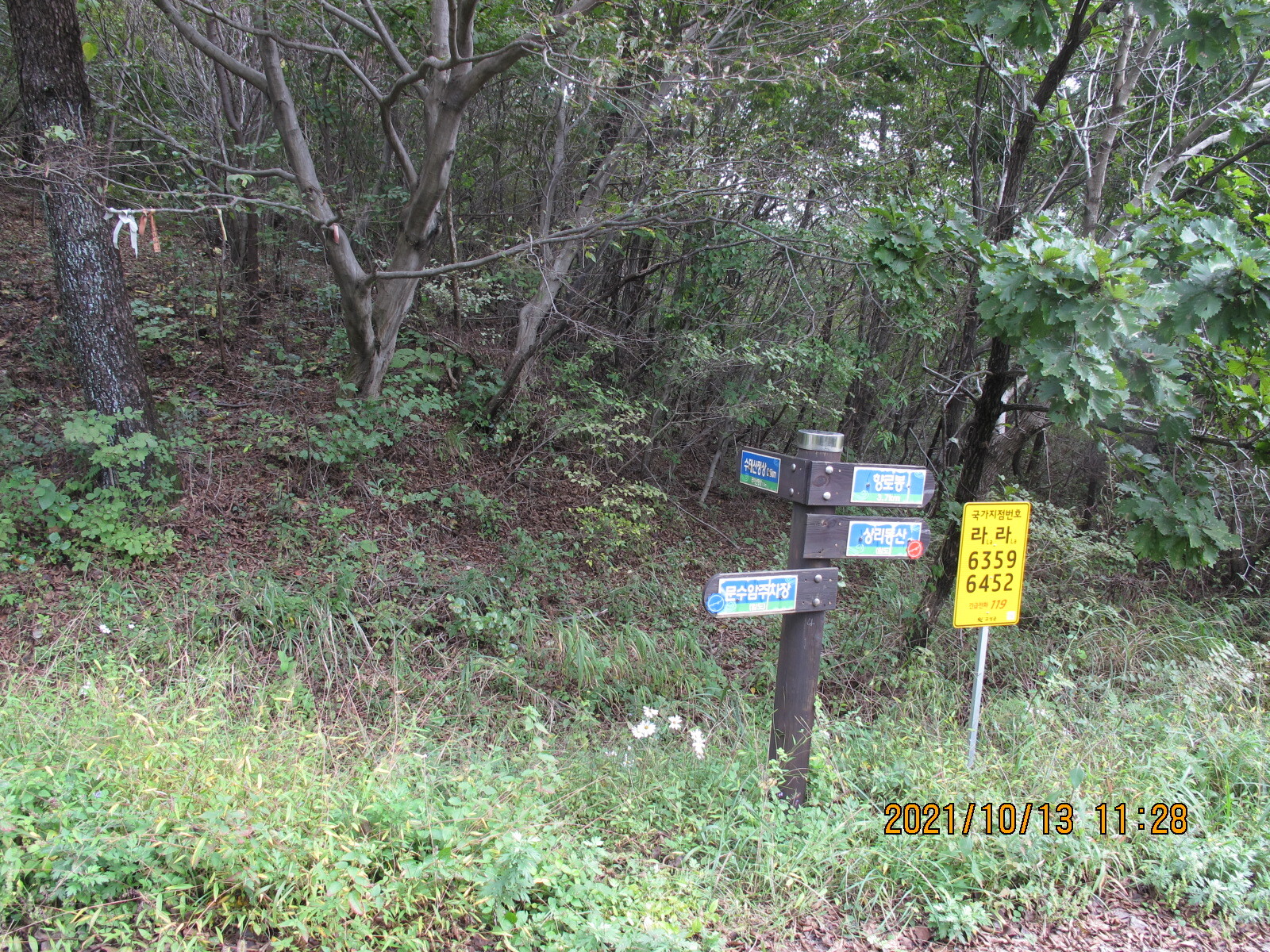 구절초 하얀 꽃들과 꽃향유 자홍색 꽃들을 살피며 임도를 계속 걸어나가면 왼쪽에 '종점까지 6km'가 남아 있음을 알리는 남파랑길 이정목이 세워져 있는 곳에 이른다. 이곳에서 왼쪽으로 꺾어 고성군 하일면 학림리 방향으로 내려간다. 학동마을로 내려가는 길에서 바라보는 우뚝 솟은 좌이산이 이정표가 된다.