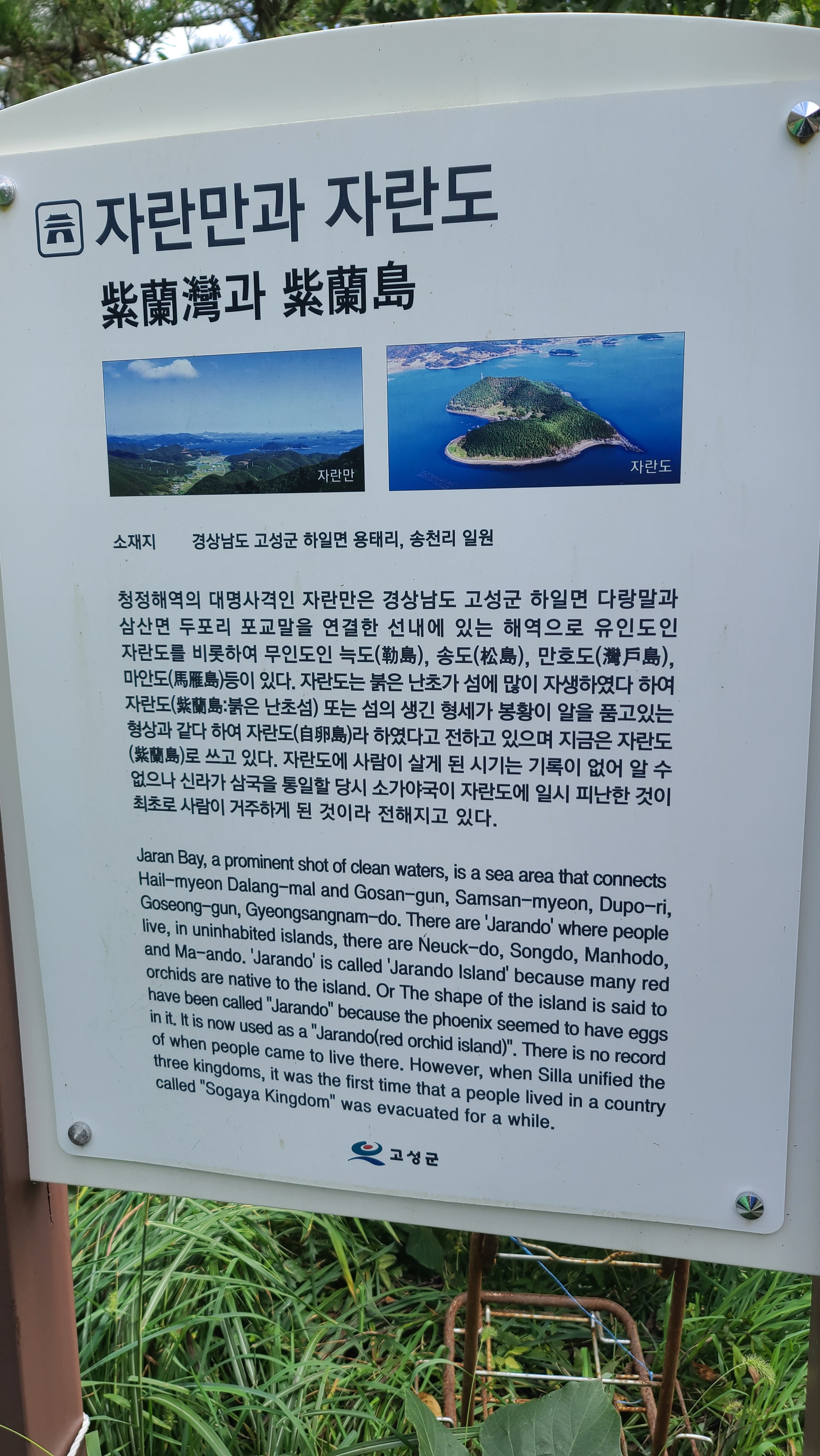왼쪽 뒤 끝에 벽방산, 오른쪽에 자란만이 리아스식 해안을 형성하고 있다.