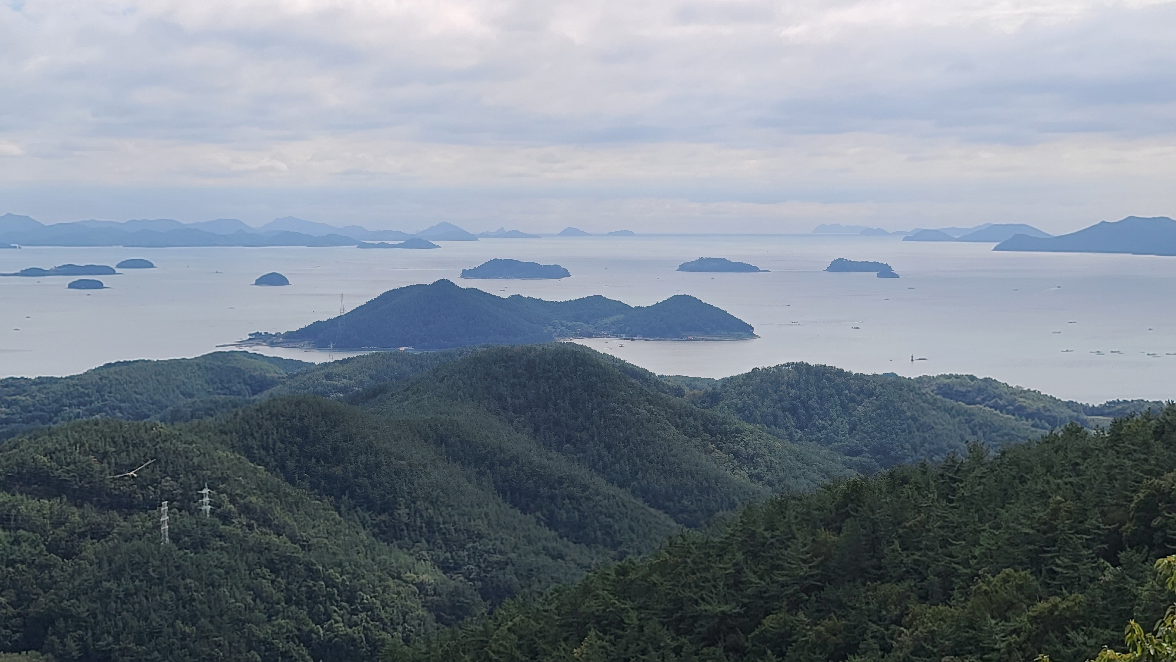 자란도와 자란만 풍경이 미세먼지 속에 흐릿하다. 오른쪽에 사량도가 왼쪽으로 길게 뻗어나와 있다.