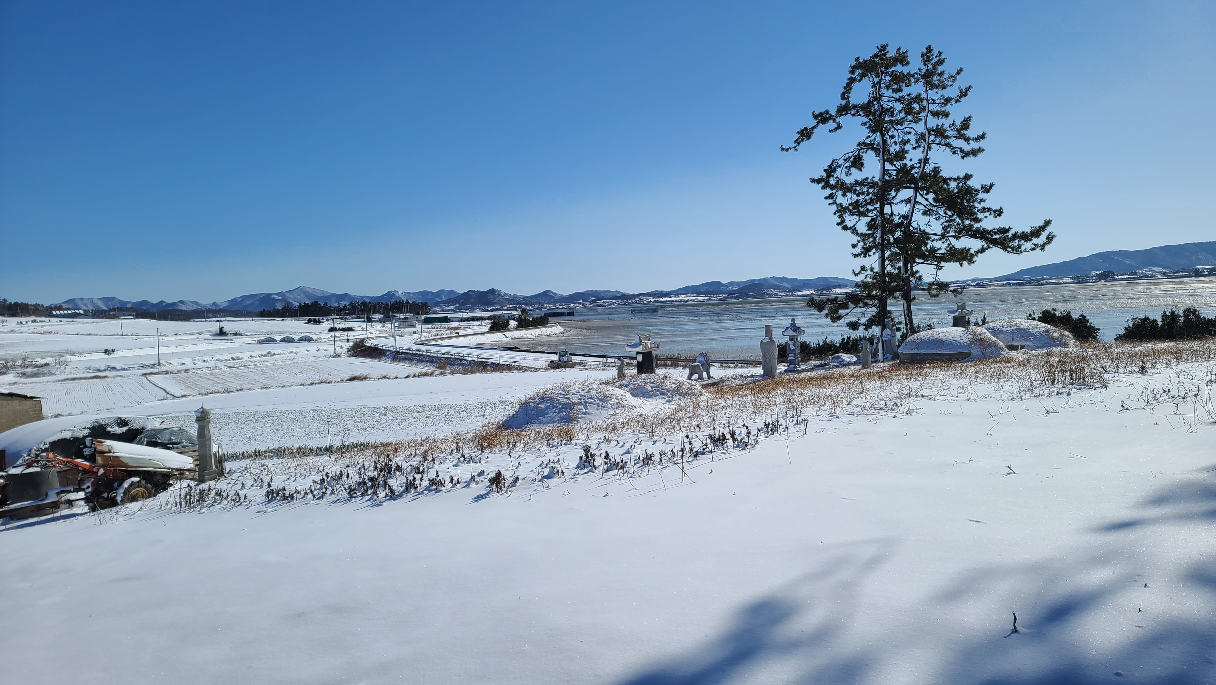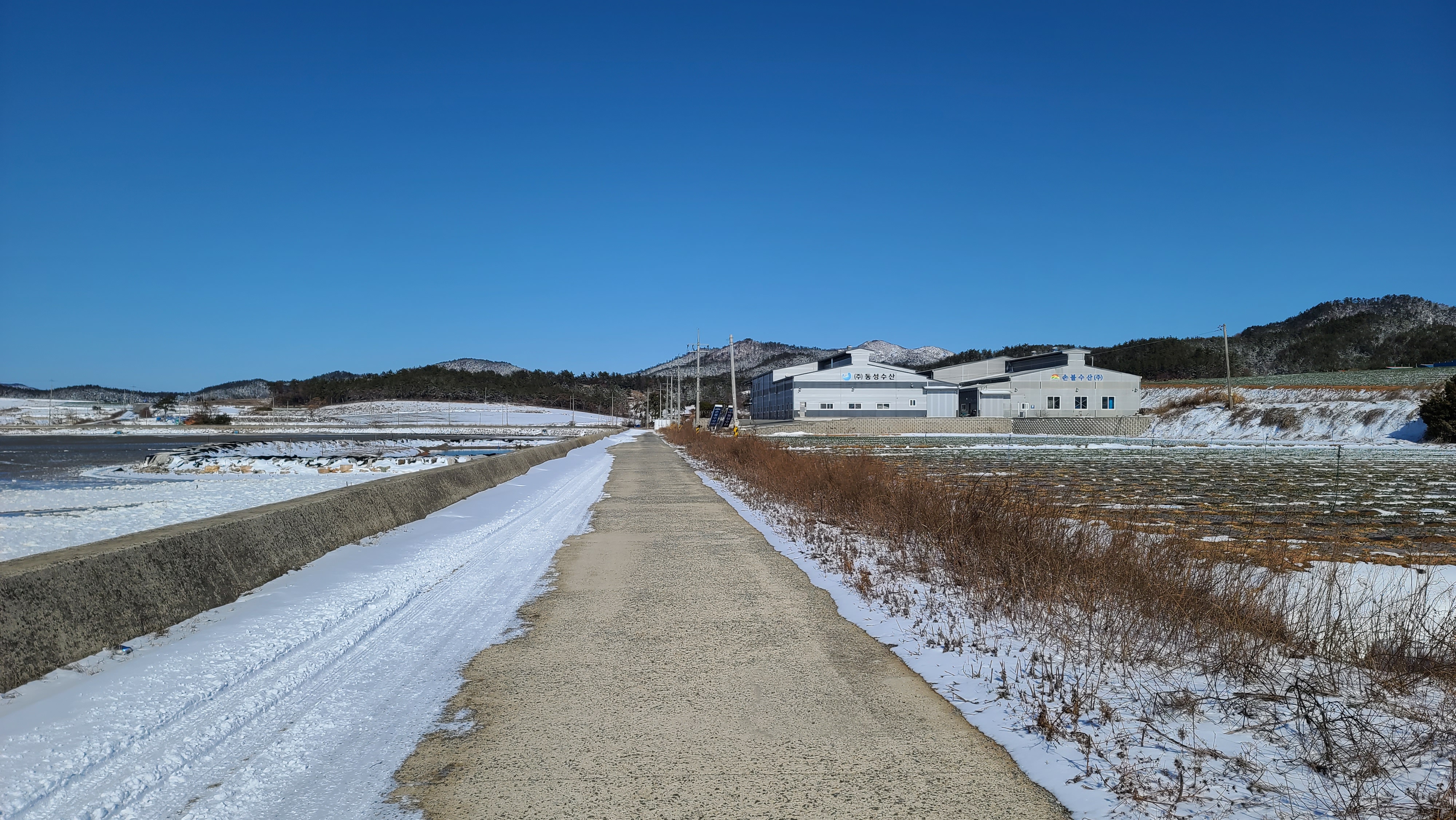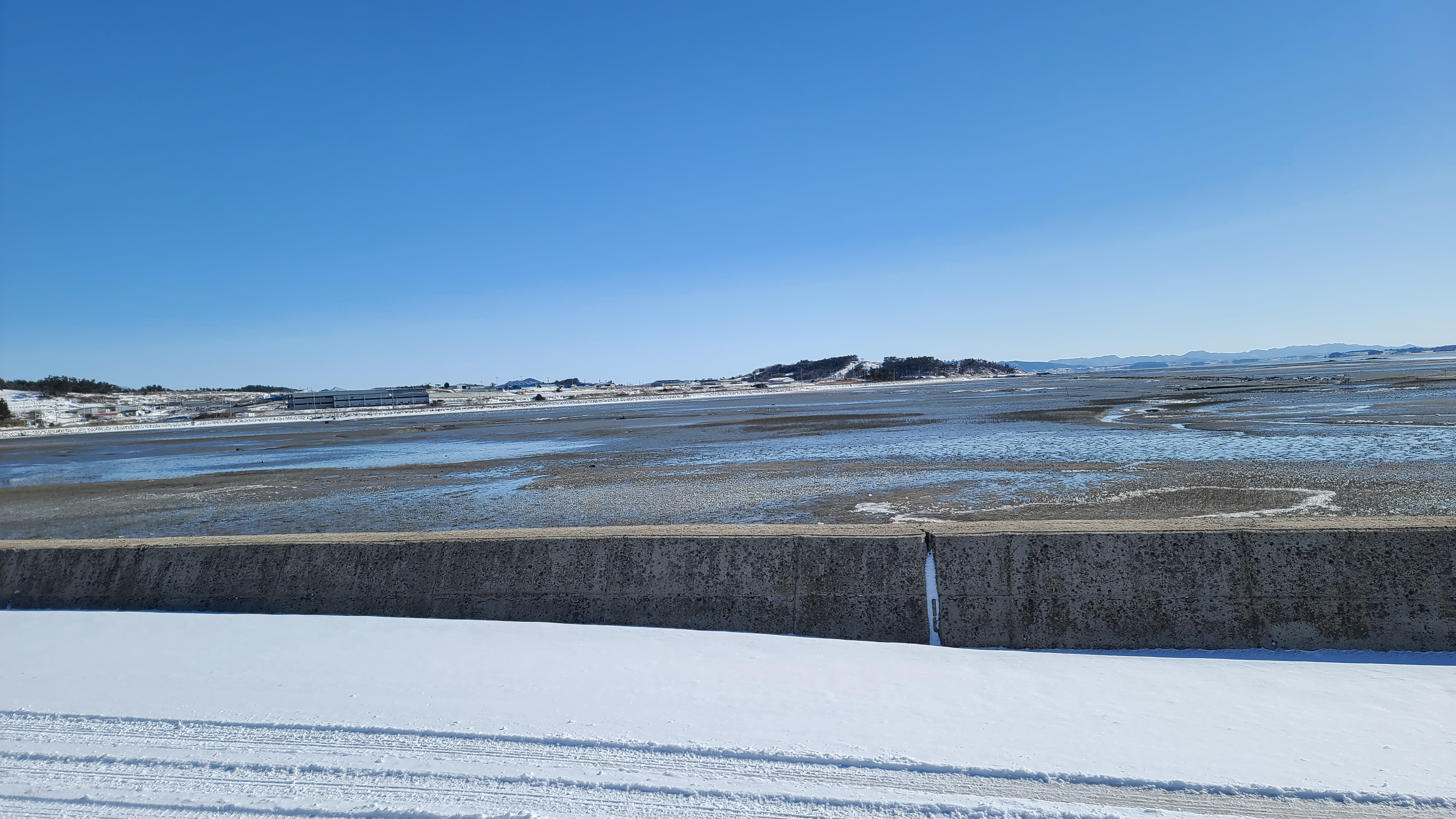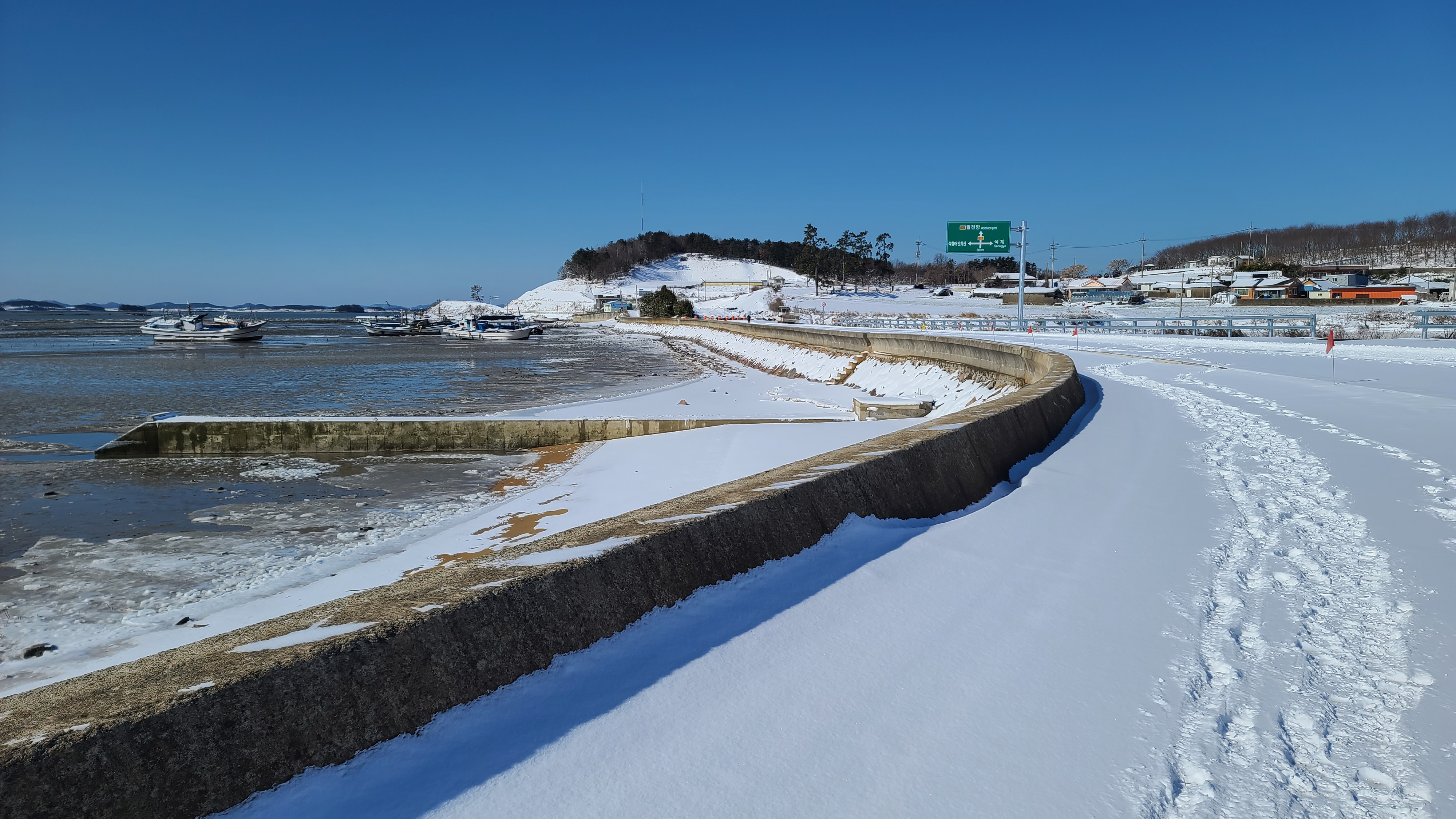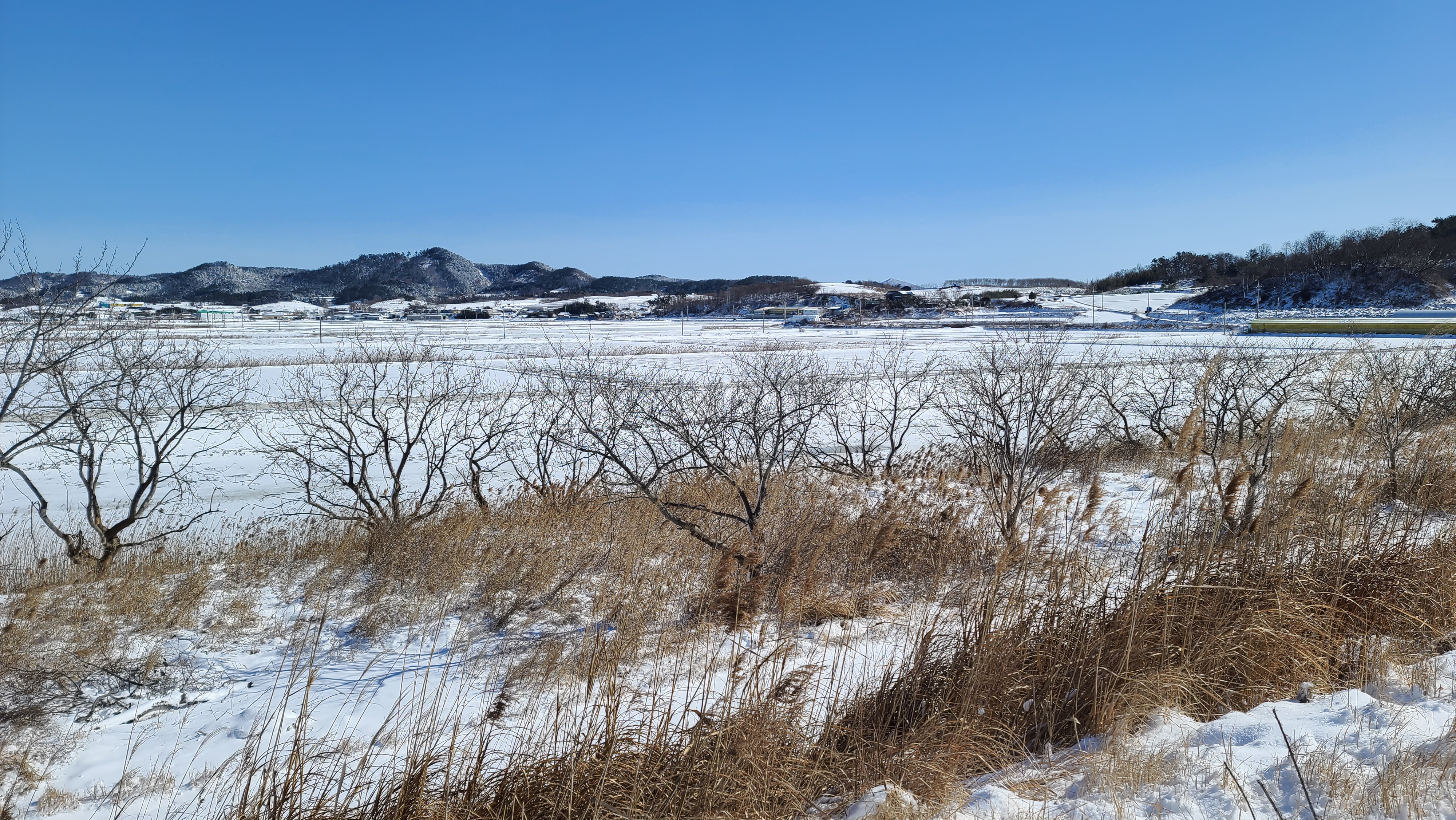 함해만 동쪽을 흐르는 산세는 높지 않고 나즈막한 산들이 이어지며, 해안과 산줄기 사이에 들녘이 펼쳐져 있다. 탐방하는 날은 운이 좋았는지, 눈 쌓인 산줄기와 눈 덮인 들녘이 투명한 겨울 햇빛을 받으며 거칠 것이 없이 탁트였다. 겨울산의 고적이 솟아오르고 겨울들녘의 평화가 펼쳐져 함해만 바다와 멋지게 어우러졌다. 그 중에서도 산남리의 들녘, 월천리의 들녘, 학산리의 들녘이 가슴에 새겨져 있다. 뒤에는 나즈막한 산맥이 흐르고, 앞에는 드넓은 평야가 펼쳐져 있는 마을들이 이웃하여 오손도손 자리하고 있다. 바람은은 들녘을 가로질러 바다를 건너 함해만 서쪽으로 불어가고 철새는 바다를 건너와 마을 앞 들녘의 하늘로 날아온다. 햇빛은 물 들어오는 바다에서 눈부시게 빛나고 물새들이 한가로이 유영을 즐긴다. 이 평화의 세상, 소박함이 그곳에 있으며 근면과 검소가 그곳에 있다. 긴 거리의 트레킹에 허우적거리다가 화려하지 않으나 빛나는 이 풍경의 아름다움에 길손은 벅차다.
