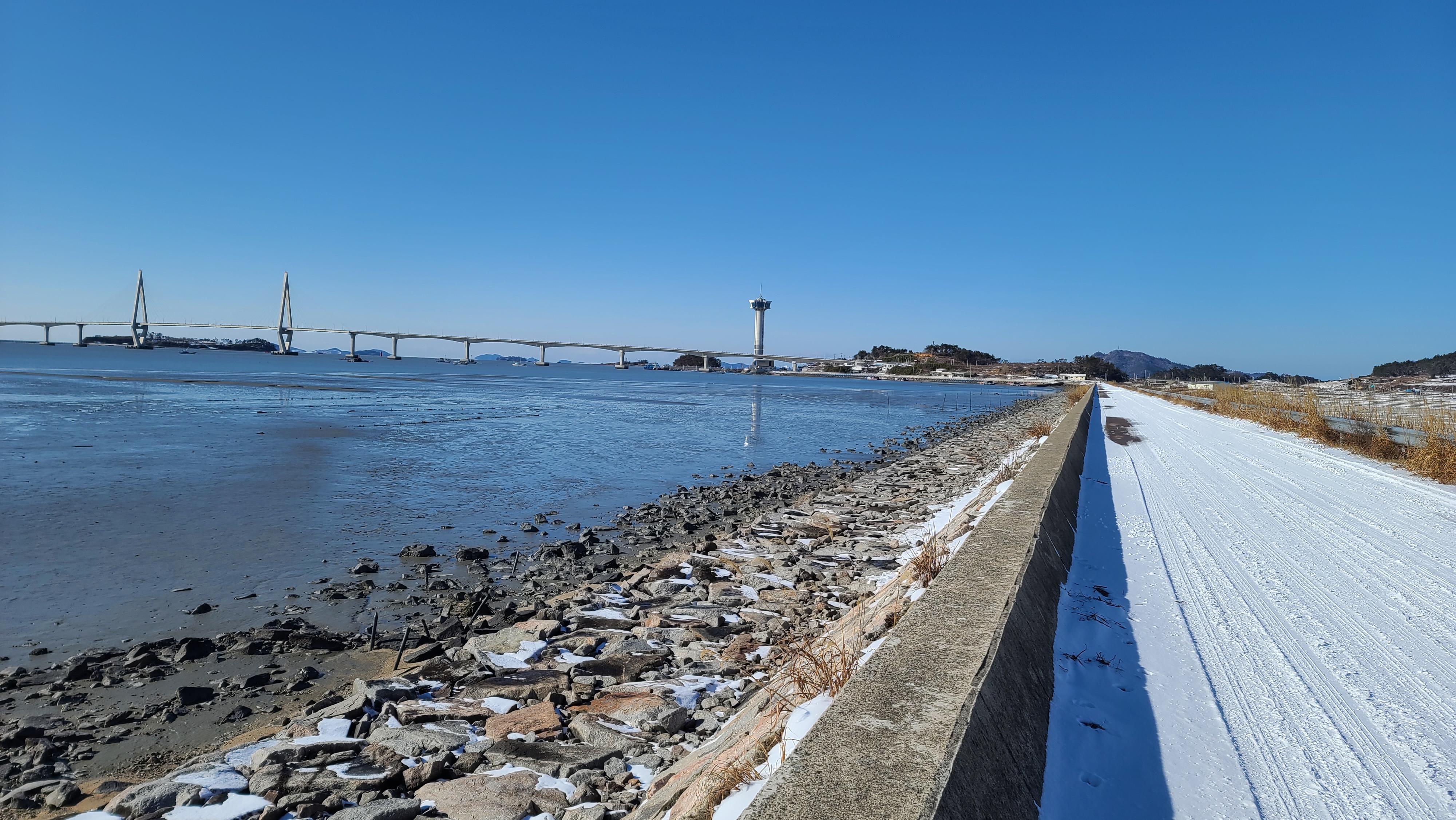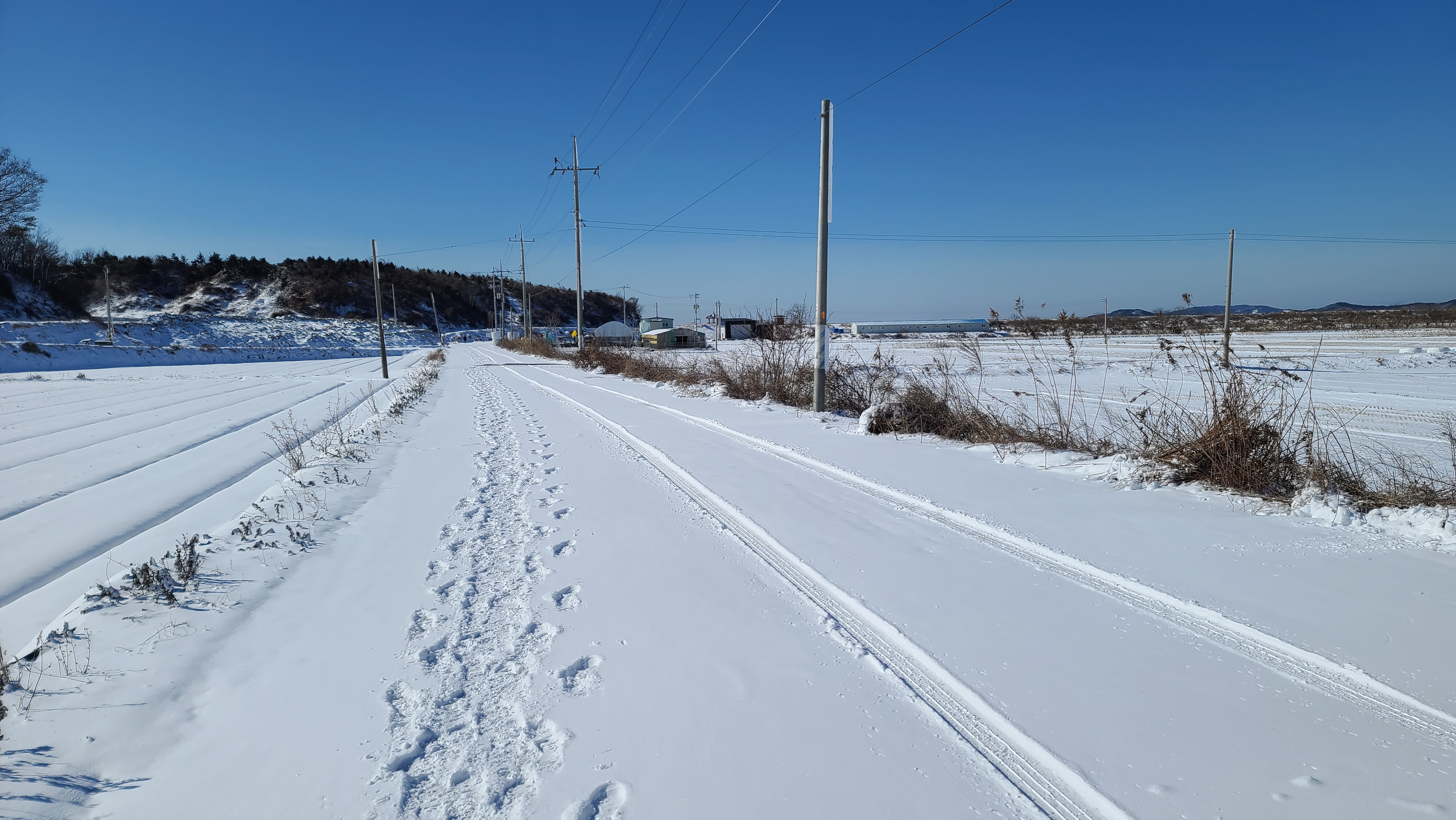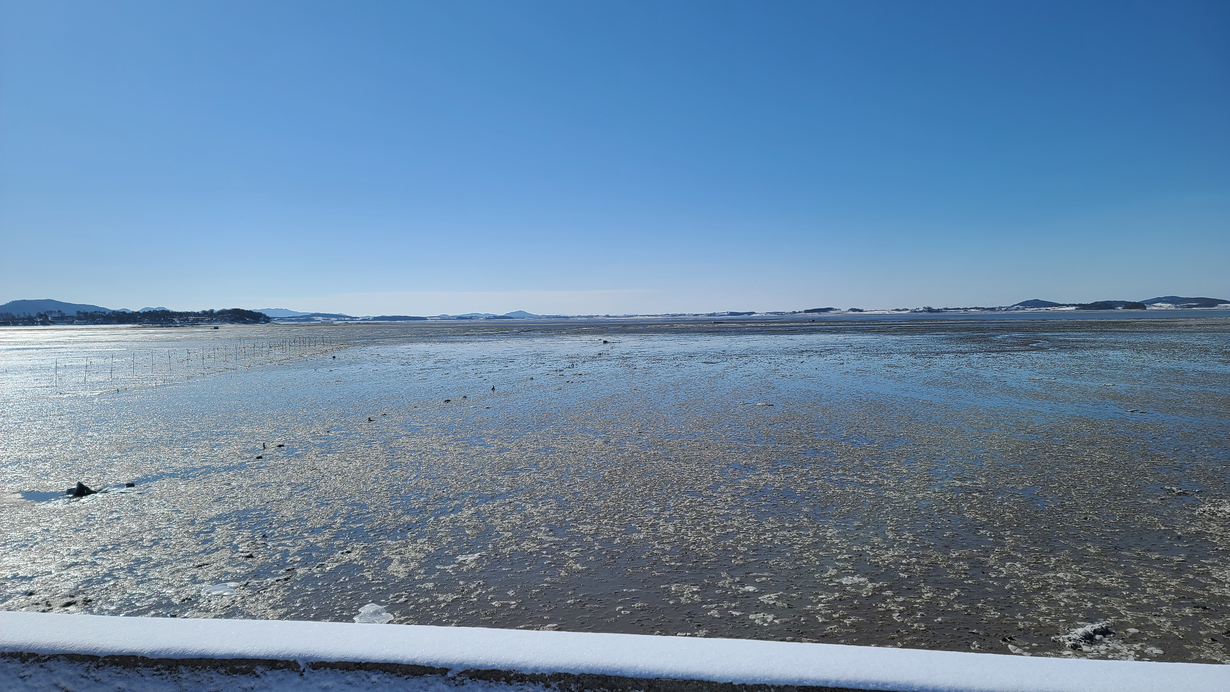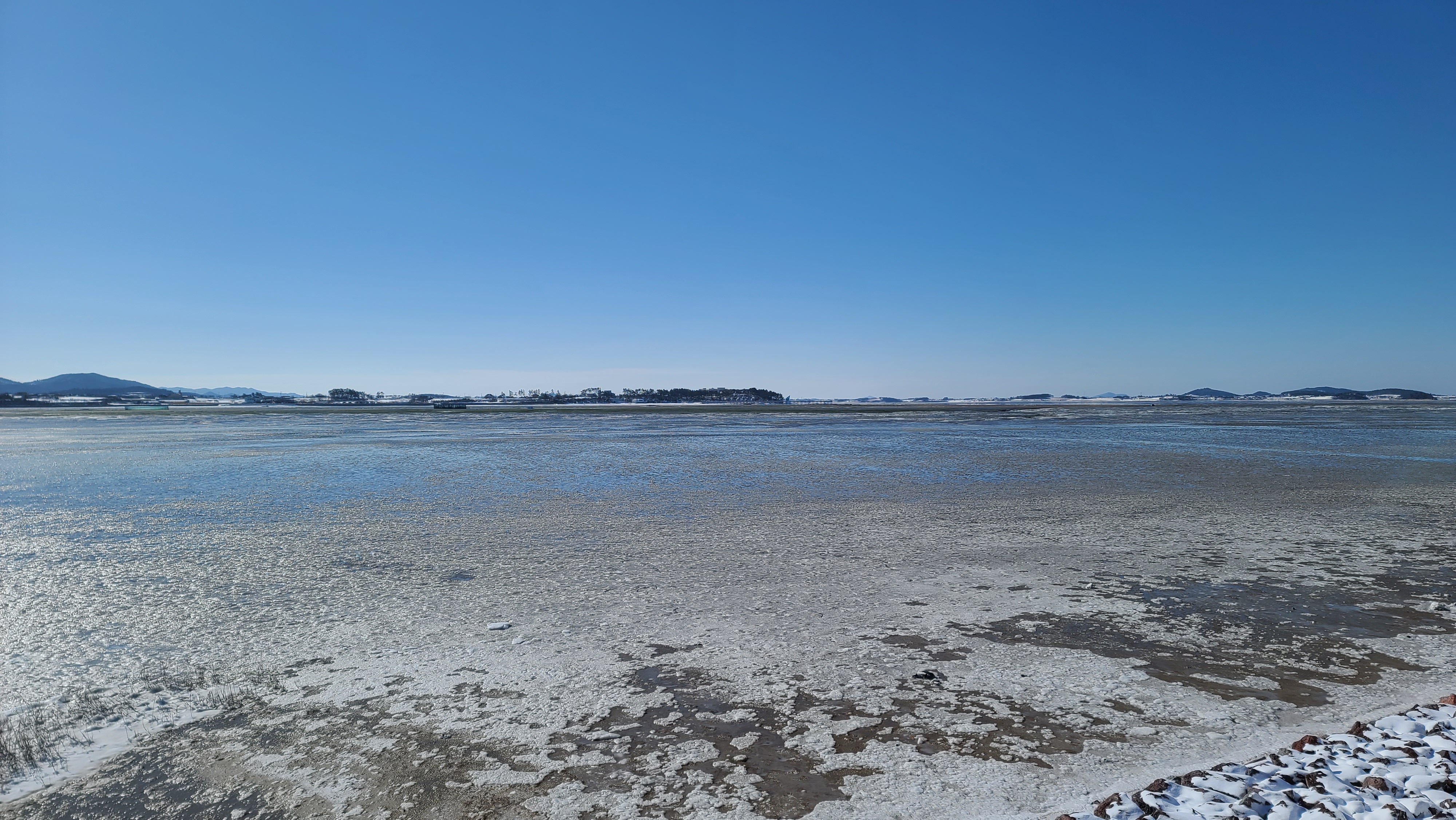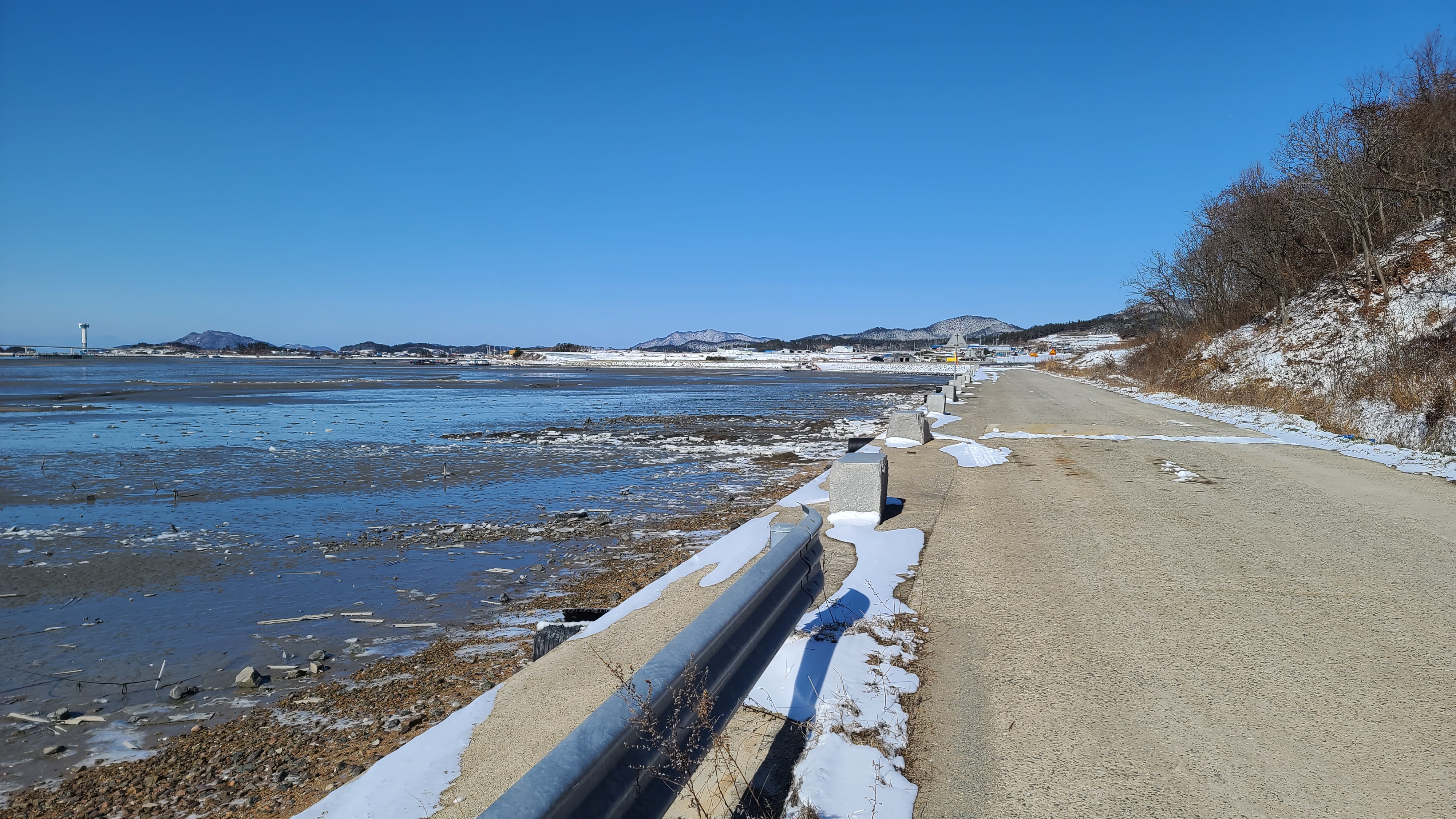 함해만 동쪽을 흐르는 산세는 높지 않고 나즈막한 산들이 이어지며, 해안과 산줄기 사이에 들녘이 펼쳐져 있다. 탐방하는 날은 운이 좋았는지, 눈 쌓인 산줄기와 눈 덮인 들녘이 투명한 겨울 햇빛을 받으며 거칠 것이 없이 탁트였다. 겨울산의 고적이 솟아오르고 겨울들녘의 평화가 펼쳐져 함해만 바다와 멋지게 어우러졌다. 그 중에서도 산남리의 들녘, 월천리의 들녘, 학산리의 들녘이 가슴에 새겨져 있다. 뒤에는 나즈막한 산맥이 흐르고, 앞에는 드넓은 평야가 펼쳐져 있는 마을들이 이웃하여 오손도손 자리하고 있다. 바람은은 들녘을 가로질러 바다를 건너 함해만 서쪽으로 불어가고 철새는 바다를 건너와 마을 앞 들녘의 하늘로 날아온다. 햇빛은 물 들어오는 바다에서 눈부시게 빛나고 물새들이 한가로이 유영을 즐긴다. 이 평화의 세상, 소박함이 그곳에 있으며 근면과 검소가 그곳에 있다. 긴 거리의 트레킹에 허우적거리다가 화려하지 않으나 빛나는 이 풍경의 아름다움에 길손은 벅차다.